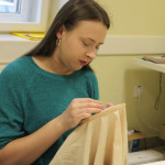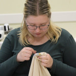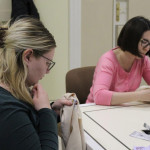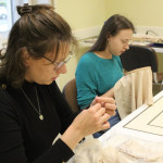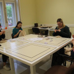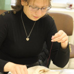 Hímzőszakkörünk szorgos tagjai gyűltek össze ismét, hogy folytassák a munkát, mégpedig a mezőberényi szűcshímzés motívumával ellátott párnahuzat készítését. Az öltések egyre szebbek, precízebbek lettek az órák folyamán, és szépen alakult a minta ezen a napon is. A résztvevők ezúttal is a lapos- és a ferde laposöltést alkalmazták, amelyek a leggyakrabban használt öltésfajták ennél a motívumnál. Nemsokára a száröltés technikája is sorra kerül ezen a munkadarabon, hogy azután új módszerekkel és mintákkal ismerkedjenek a résztvevők.