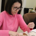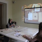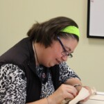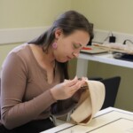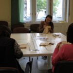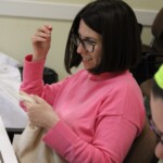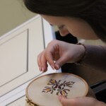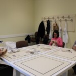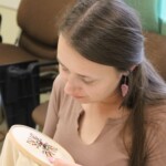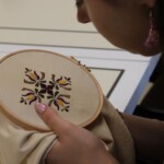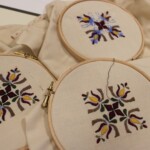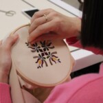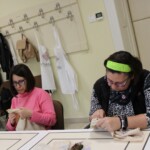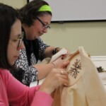 Május 7-én a hímzőszakkör tagjai szorgoskodtak ismét. Befejező fázisához érkezett a békési szűcshímzéssel díszített párnahuzat. A lapos- és a ferde öltéssel készített minta nem teljes kontúrozás nélkül. Ennek elkészítési módját, a száröltést tanulhatták meg ma a résztvevők, majd az oktatóvideó megtekintése után a gyakorlatban is kipróbálhatták az új öltésfajtát. Így teljes pompájában mutatkozik meg a minta.
