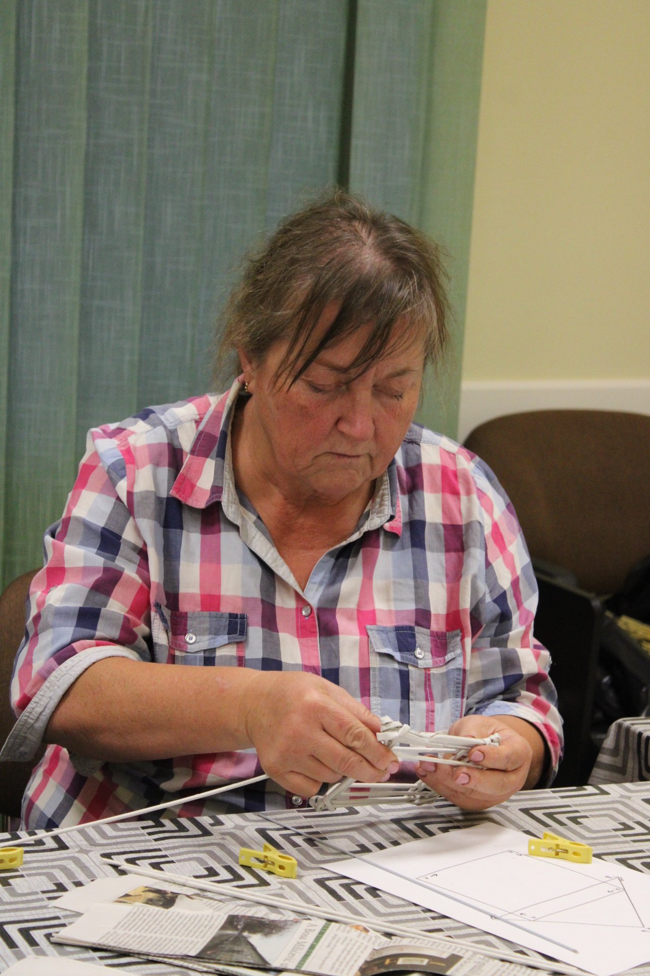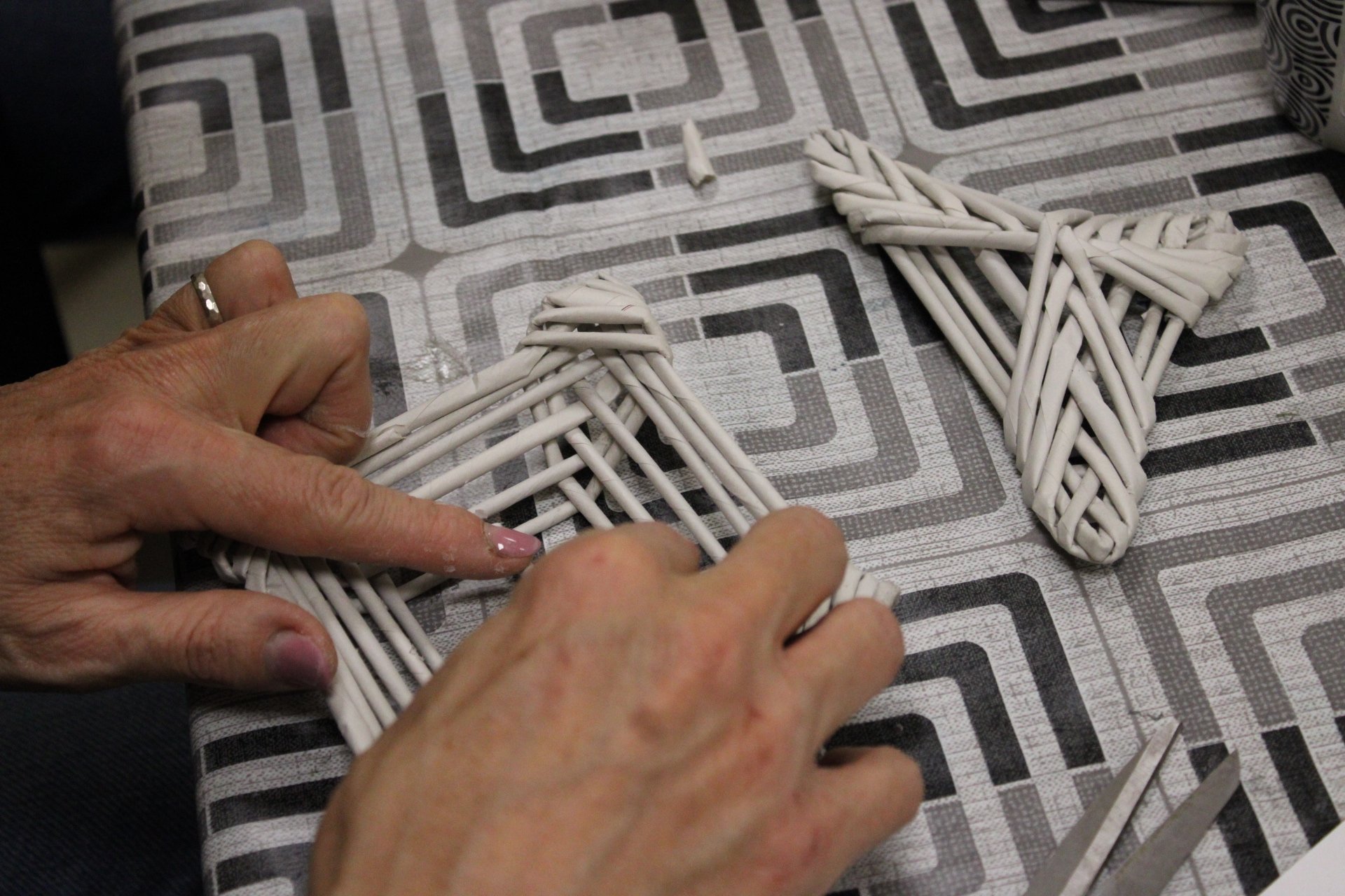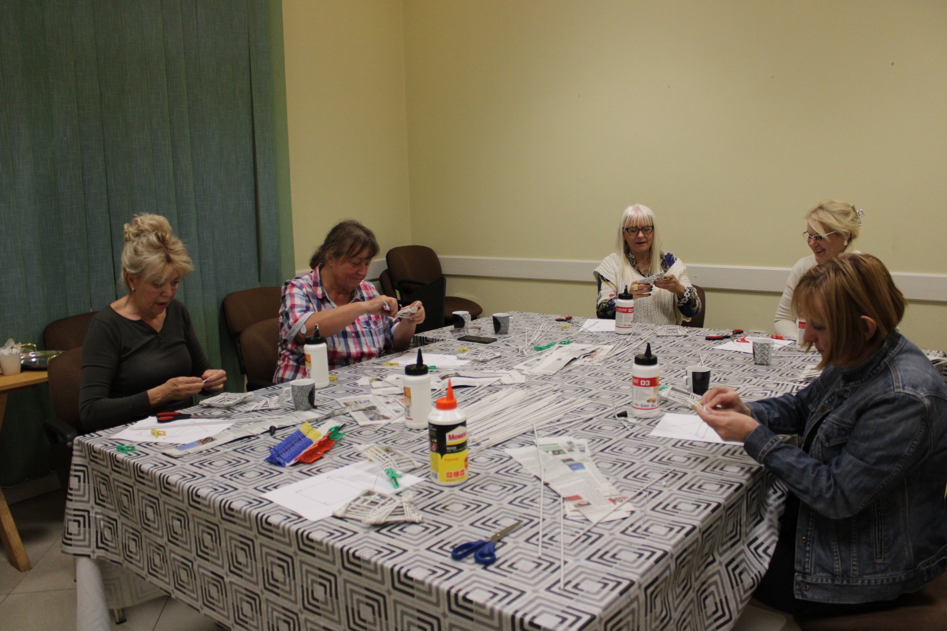 Szorgos munkával töltötték a hétfő délutánt a papírfonó szakkör tagjai. A mai feladat a házikó elkészítése volt, amelyet fehér papírpácák segítségével alkottak meg a résztvevők. Ily módon pillanthattak bele a munkafolyamatba és gyakorolhatták a fonás alapmozdulatait, amelyekre a későbbiekben szükségük lesz. A délután végére szép munkák születtek, örömet szerezve a csoporttagoknak.