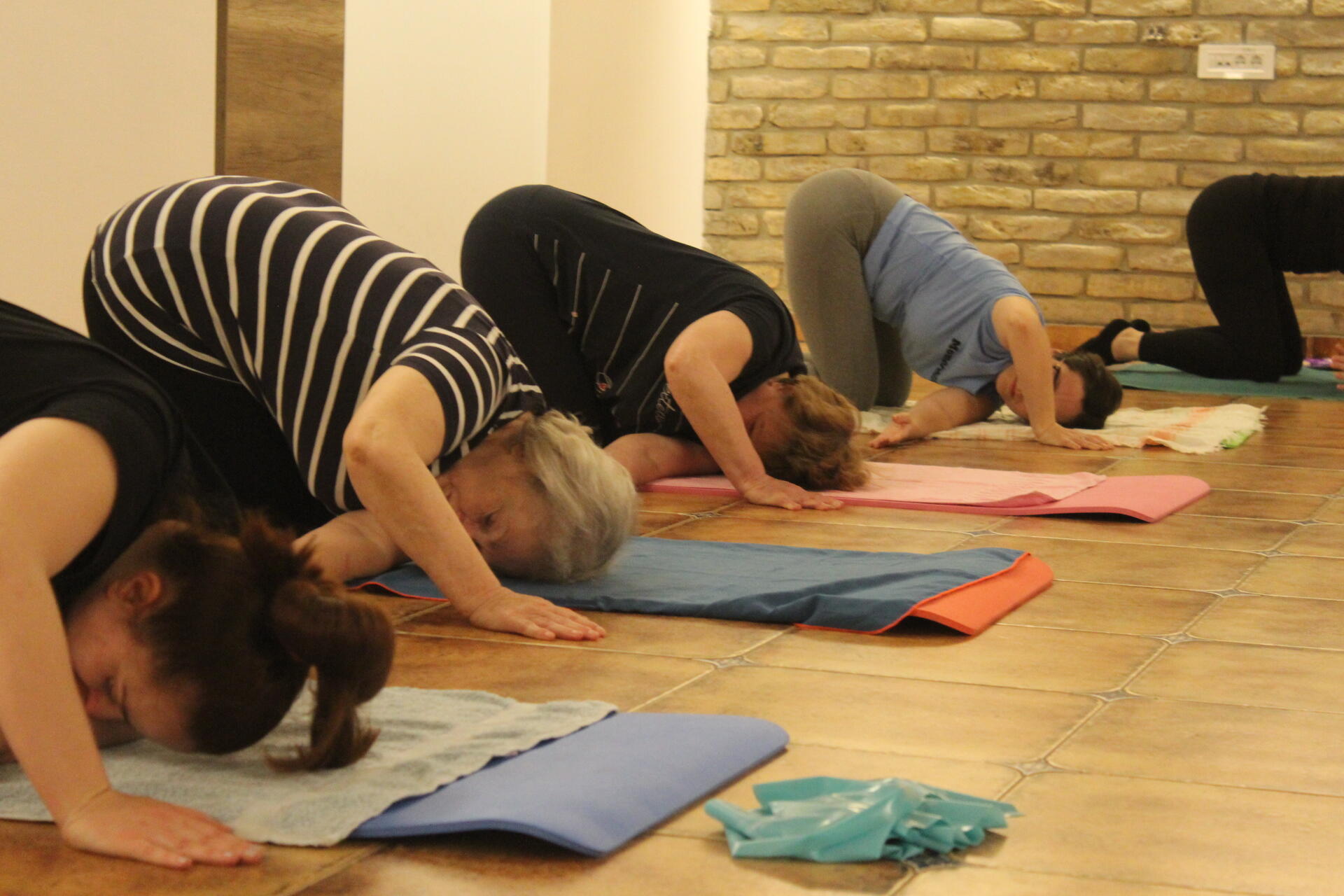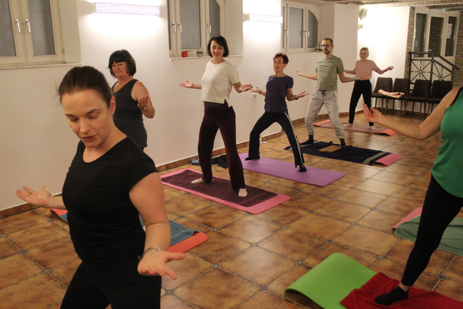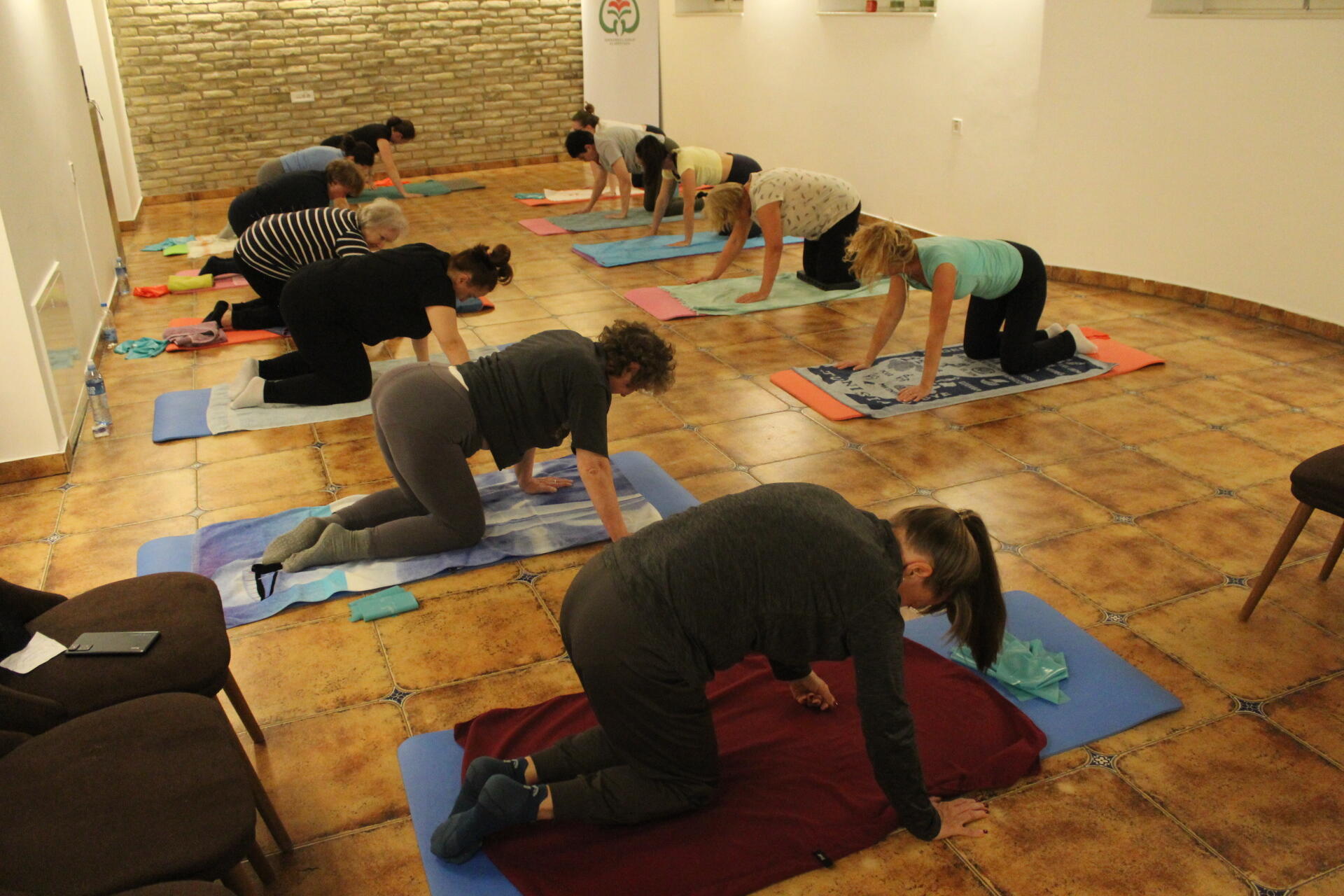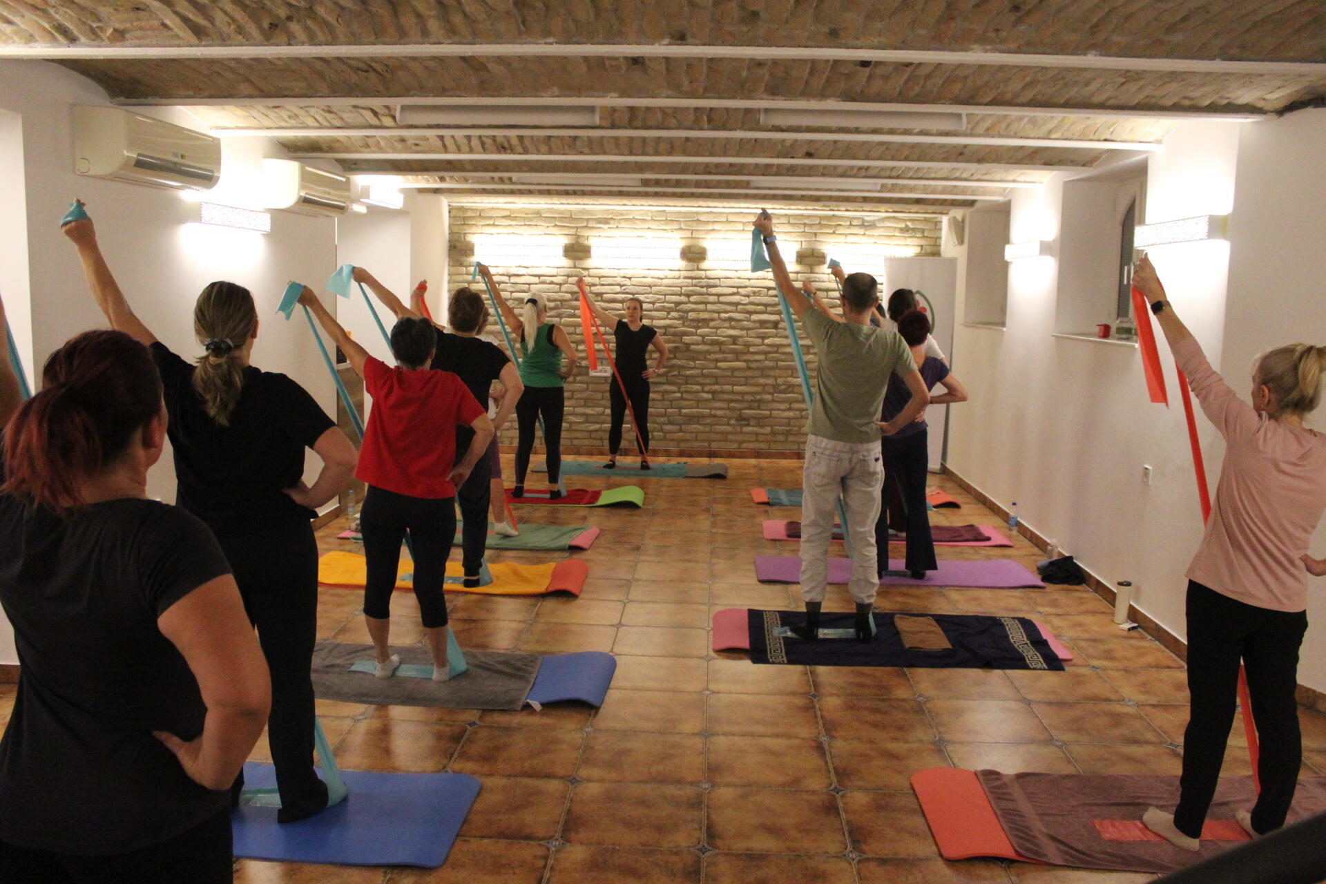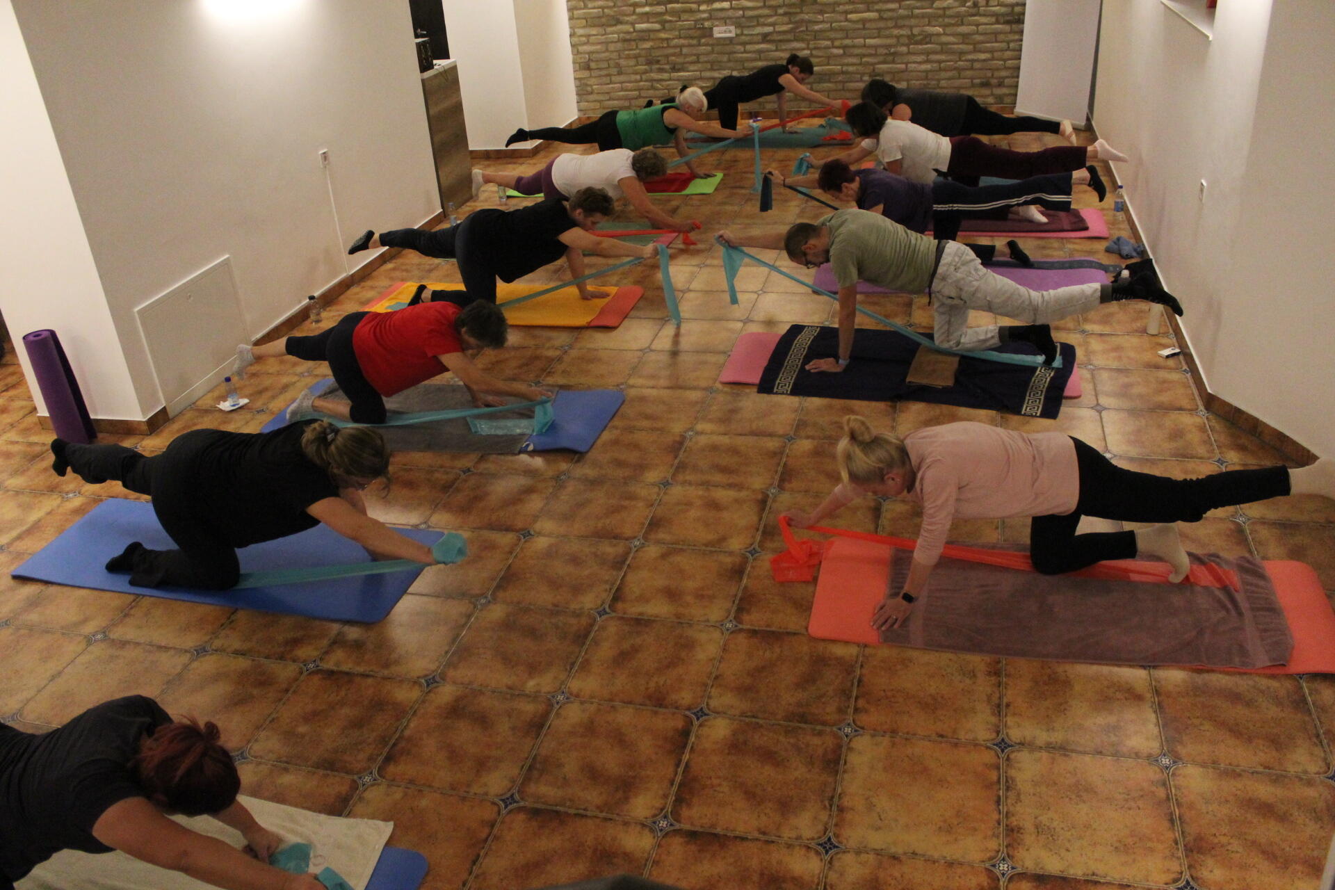 Ezen a héten is ellátogathattak alapítványunkba azok, akik tenni szerettek volna egészségükért, hiszen két időpontban is várta őket az Egészséges gerinctréning nevet viselő foglalkozás. A tartásjavító, izomerősítő, pilates és jóga alapjain nyugvó gyakorlatokat ezúttal is a bemelegítő mozgássorok elvégzése után hajtották végre a résztvevők. A mai alkalommal elasztikus gumiszalagok segítségével tették változatossá a mozdulatokat.