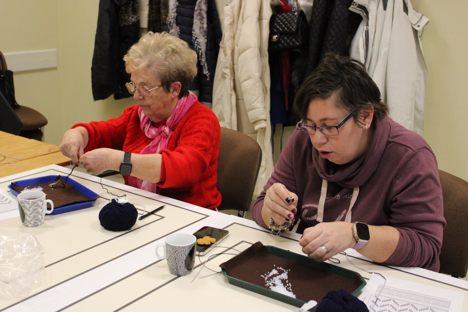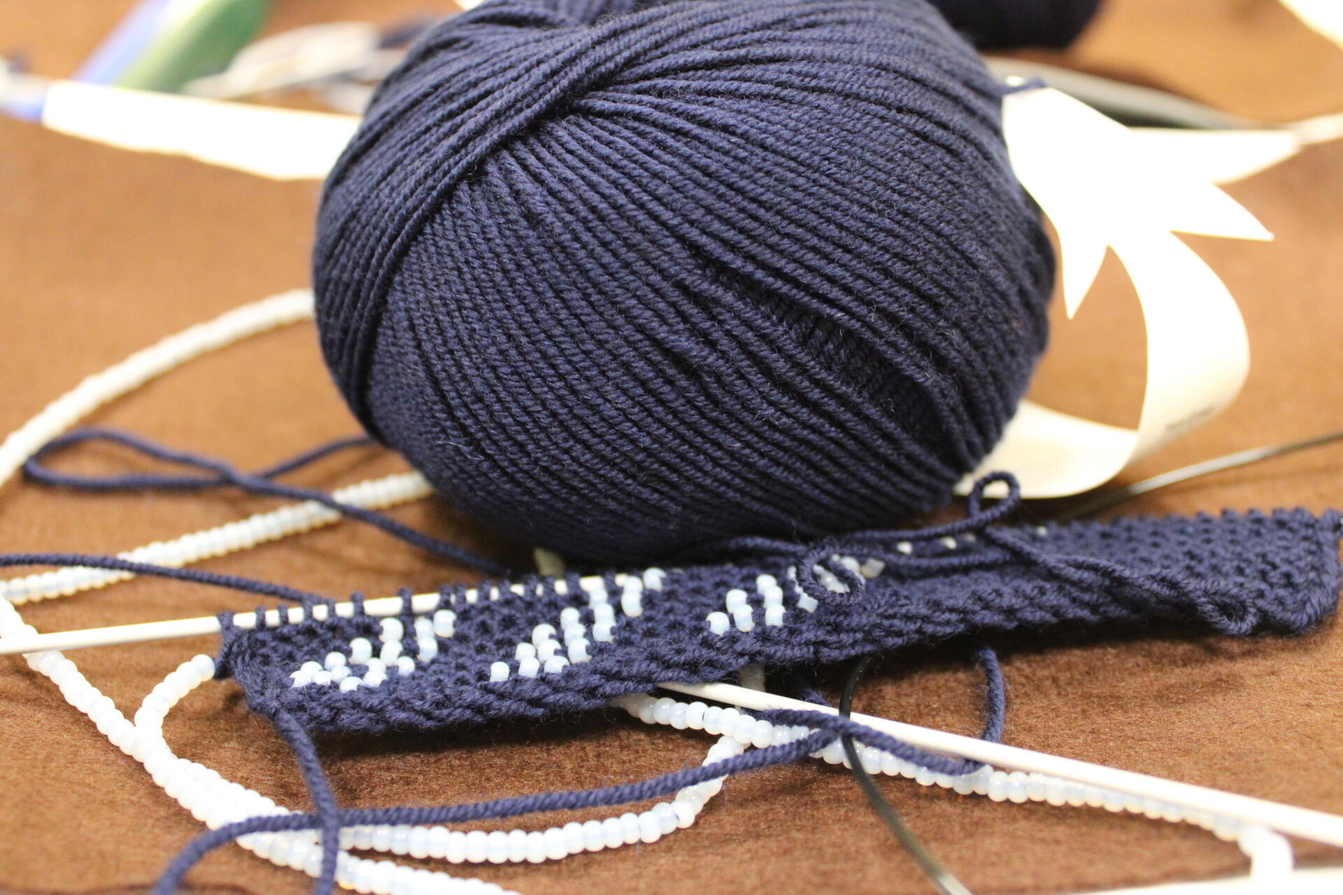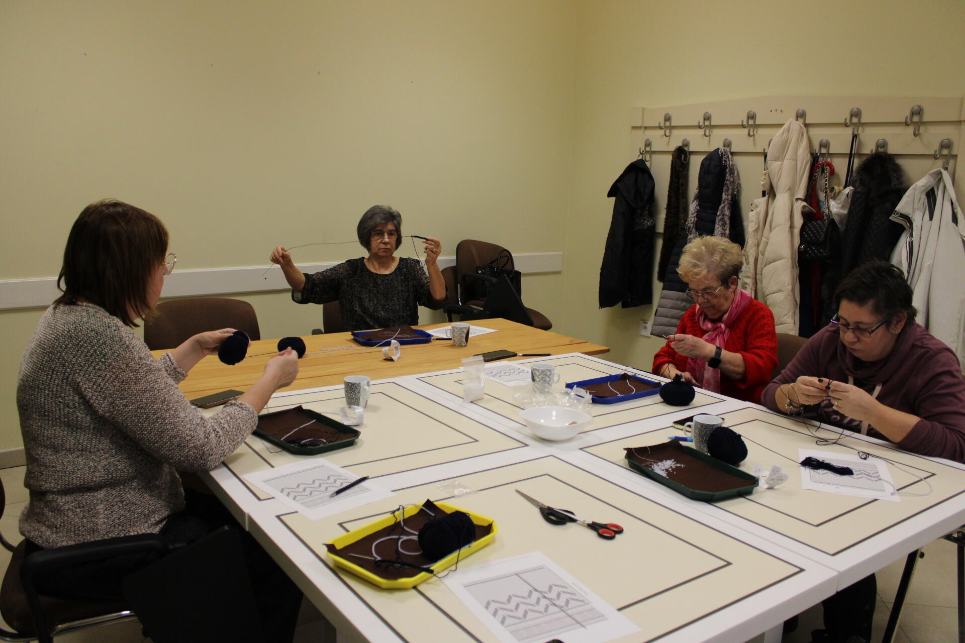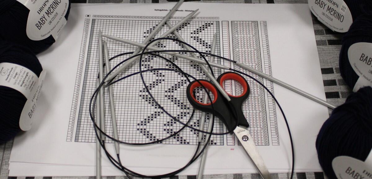 A könyvjelző sikeres befejezése után új munkába vágtak bele szorgos gyöngykötőink. A gyöngyök sokaságának felfűzését követően egy, ma már ritkán használt, de igen praktikus kiegészítő, az érmelegítő készítésére került sor. A kezdősor megkötése után indulhatott is a mintalap alapján a motívum munkadarabba való beillesztése. Jövő héten folytatjuk!