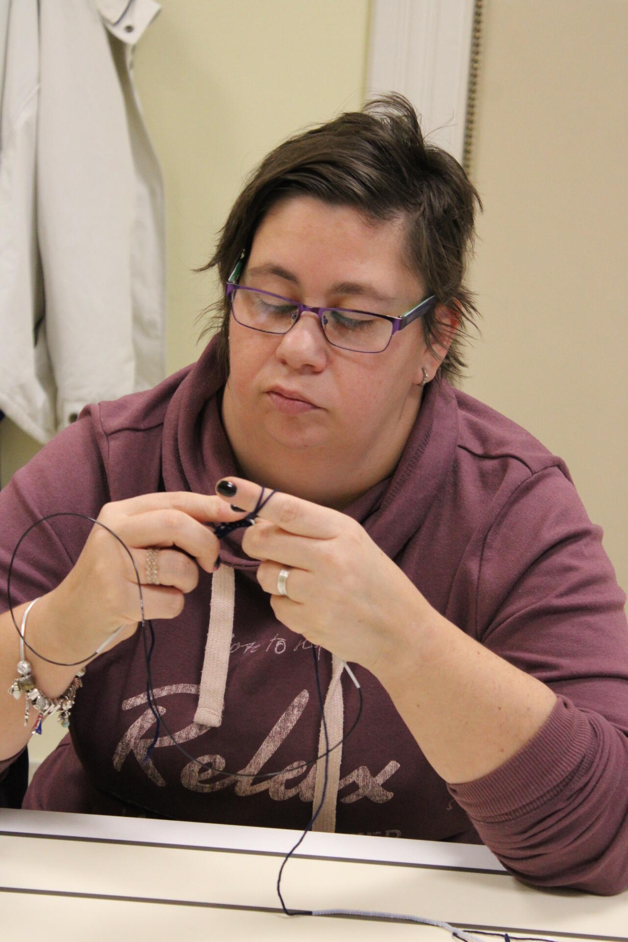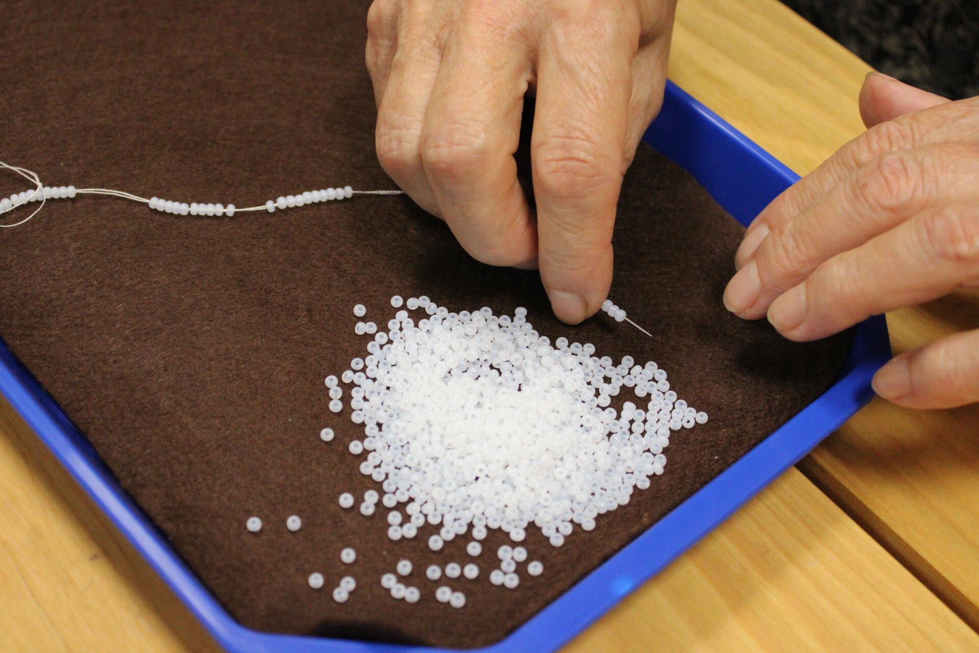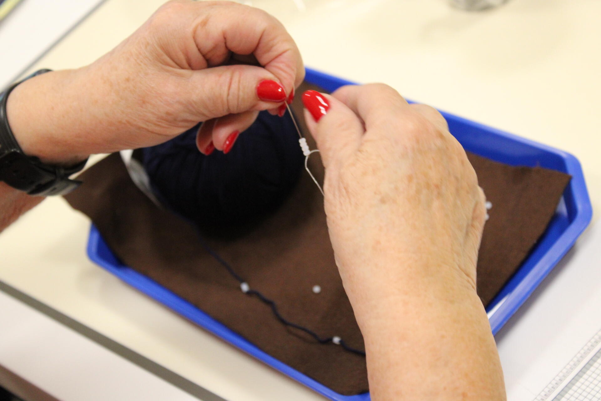 A könyvjelző sikeres befejezése után új munkába vágtak bele szorgos gyöngykötőink. A gyöngyök sokaságának felfűzését követően egy, ma már ritkán használt, de igen praktikus kiegészítő, az érmelegítő készítésére került sor. A kezdősor megkötése után indulhatott is a mintalap alapján a motívum munkadarabba való beillesztése. Jövő héten folytatjuk!