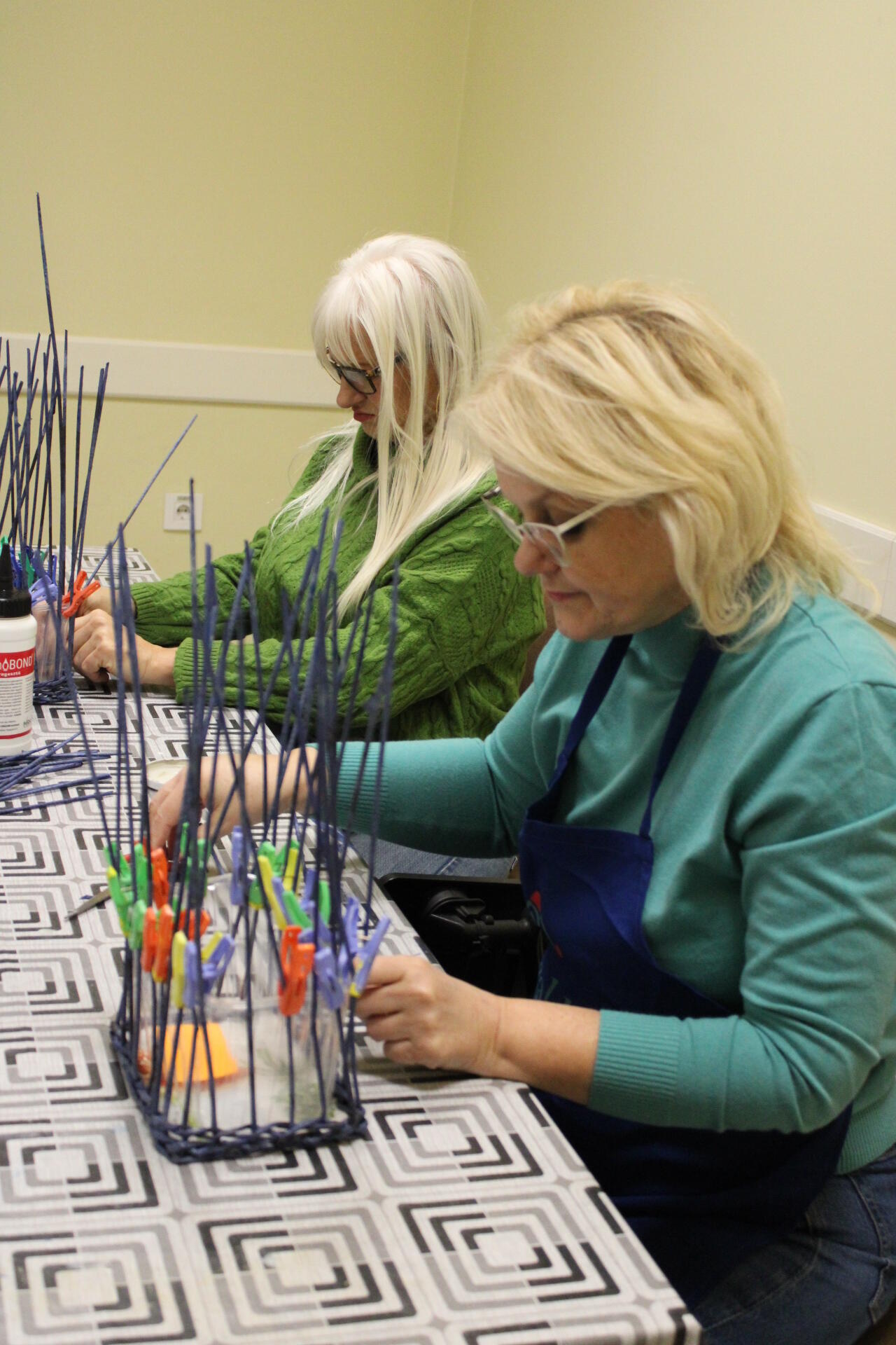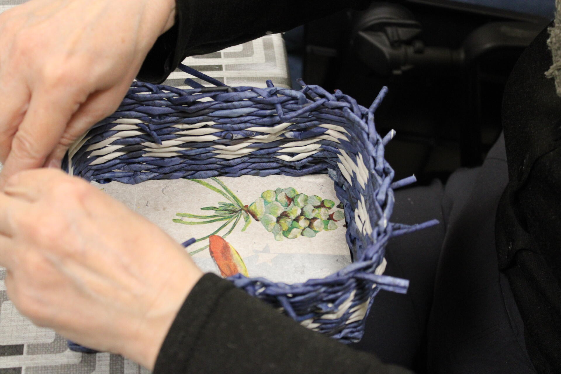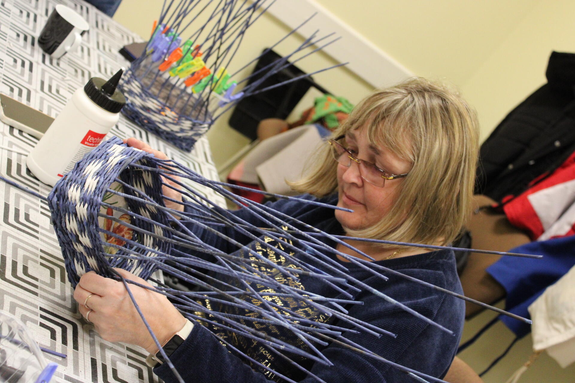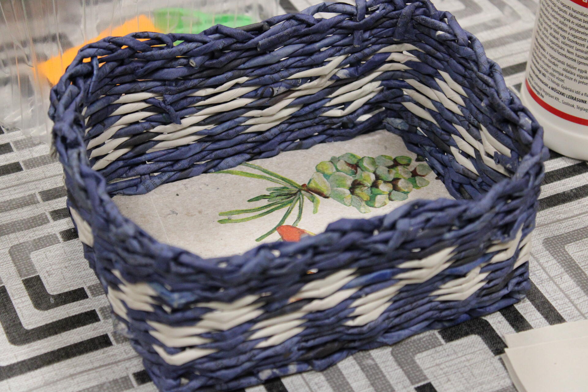 A papírfonó szakkör tagjai hétfőn folytatták a múlt alkalommal megkezdett kék négyszögletű kosár fonását. Ezúttal fehér pálcák felhasználásával minta is került a tároló falába, ezzel díszítve azt. Következő alkalommal a munkadarab befejezése után várja szakköröseinket az új feladat!
