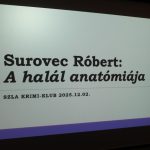 Surovec Róbert felvidéki származású magyar író debütáló regényéről beszélgettünk Krimi-klub foglalkozásunk december 2-ai eseményén. A halál anatómiája című, 2022-es krimi több szempontból is izgalmas olvasmánynak bizonyult: a csoporttagok lelkesen számoltak be a XIX. századbeli Kassán játszódó regény legemlékezetesebb mozzanatairól. Surovec Róbert trilógiájának első része kapcsán a könyv hangulatáról beszélgettünk, valamint kitértünk az amatőr nyomozópáros, Rhédey Anna és Grossz Kálmán baráti kapcsolatának jelentőségére is. A rendelkezésünkre álló 90 percben megosztottuk elméleteinket A Fakó Lovas kilétéről, illetve felolvastunk pár részletet a fordulatokkal teli krimiből. Foglalkozássorozatunk következő alkalmán kiderítjük, hogyan folytatódik a kassai nyomozópáros története. Sok szeretettek várjuk vissza résztvevőinket december 16-án!
