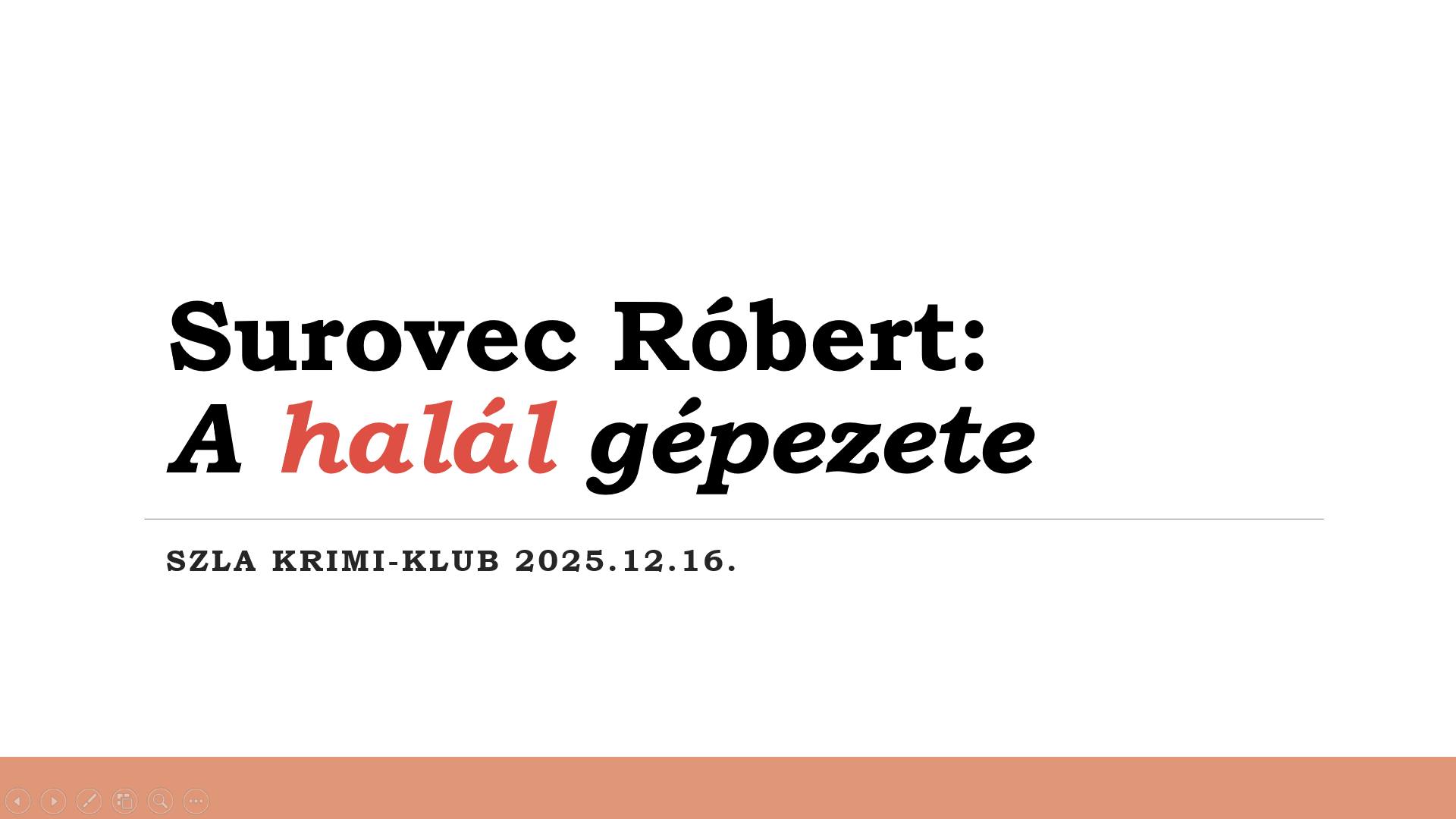 Krimi-klub foglalkozásunk idei utolsó alkalmának témája Surovec Róbert kortárs író trilógiájának második része, A halál gépezete című regény volt. A halál anatómiája folytatásaként megjelent krimiben Rhédey Anna és Grossz Kálmán újabb nyomozásáról olvashatunk, ezúttal egy szeánsz során meggyilkolt gépész halála áll a középpontban. Foglalkozásunkon összehasonlítottuk a trilógia eddig megjelent részeinek felépítését és nyelvezetét. A foglalkozás második felében áttekintettük eddigi olvasmányainkat, valamint megosztottuk, mely művek voltak ránk legnagyobb hatással. A remek hangulatú összejövetelen egy bögre forró teával és egy kis édességgel hangolódtunk közösen a közelgő ünnepekre. Köszönjük, hogy velünk tartottak! Januárban egy könnyed és hangulatos regénnyel, Benjamin Stevenson Idén karácsonykor mindenki gyilkos című könyvével folytatjuk.