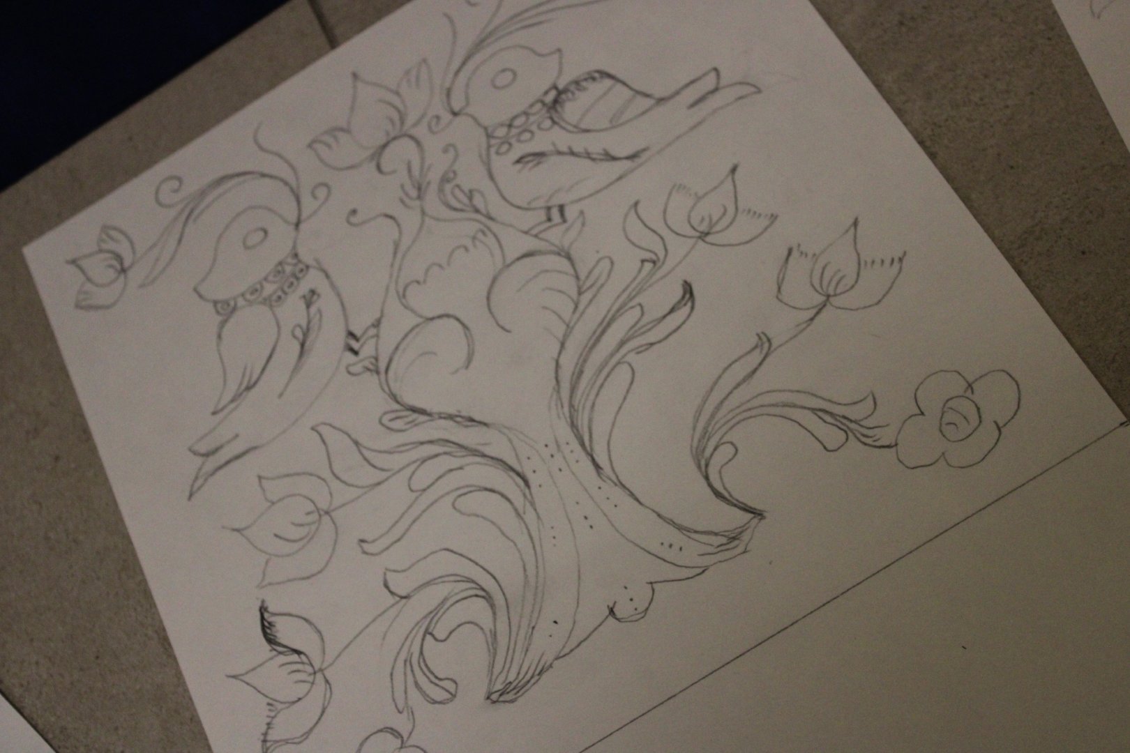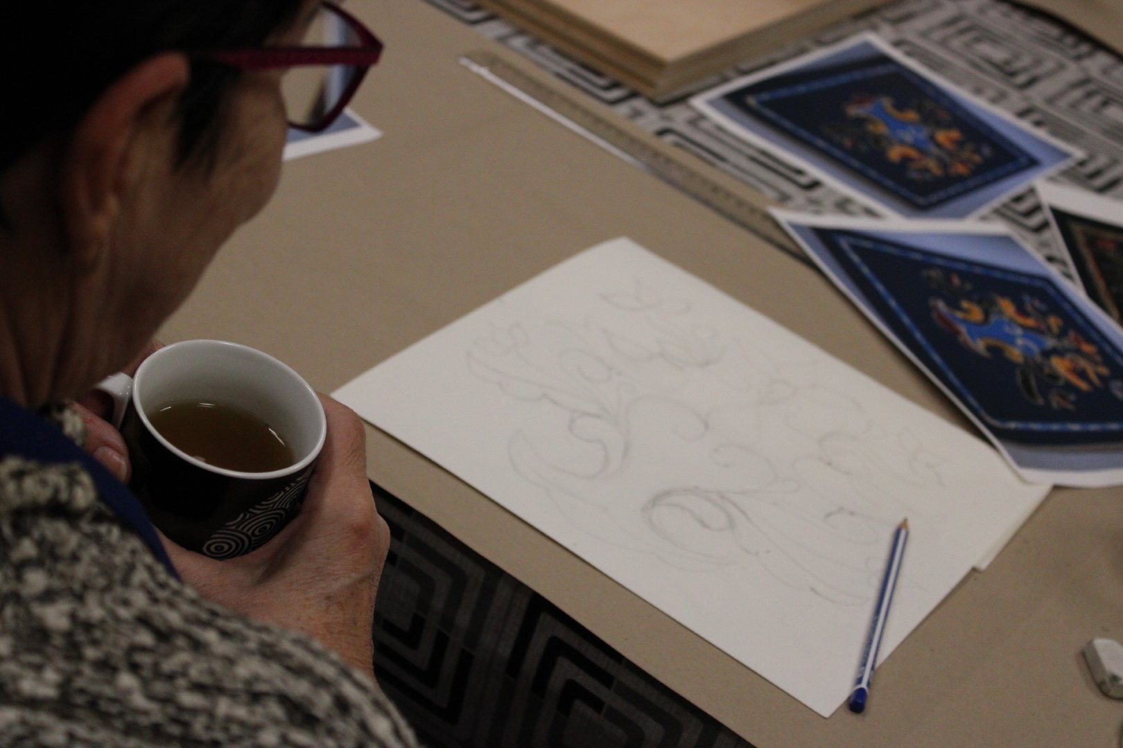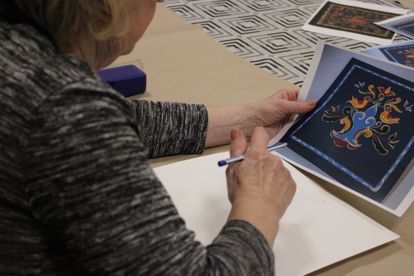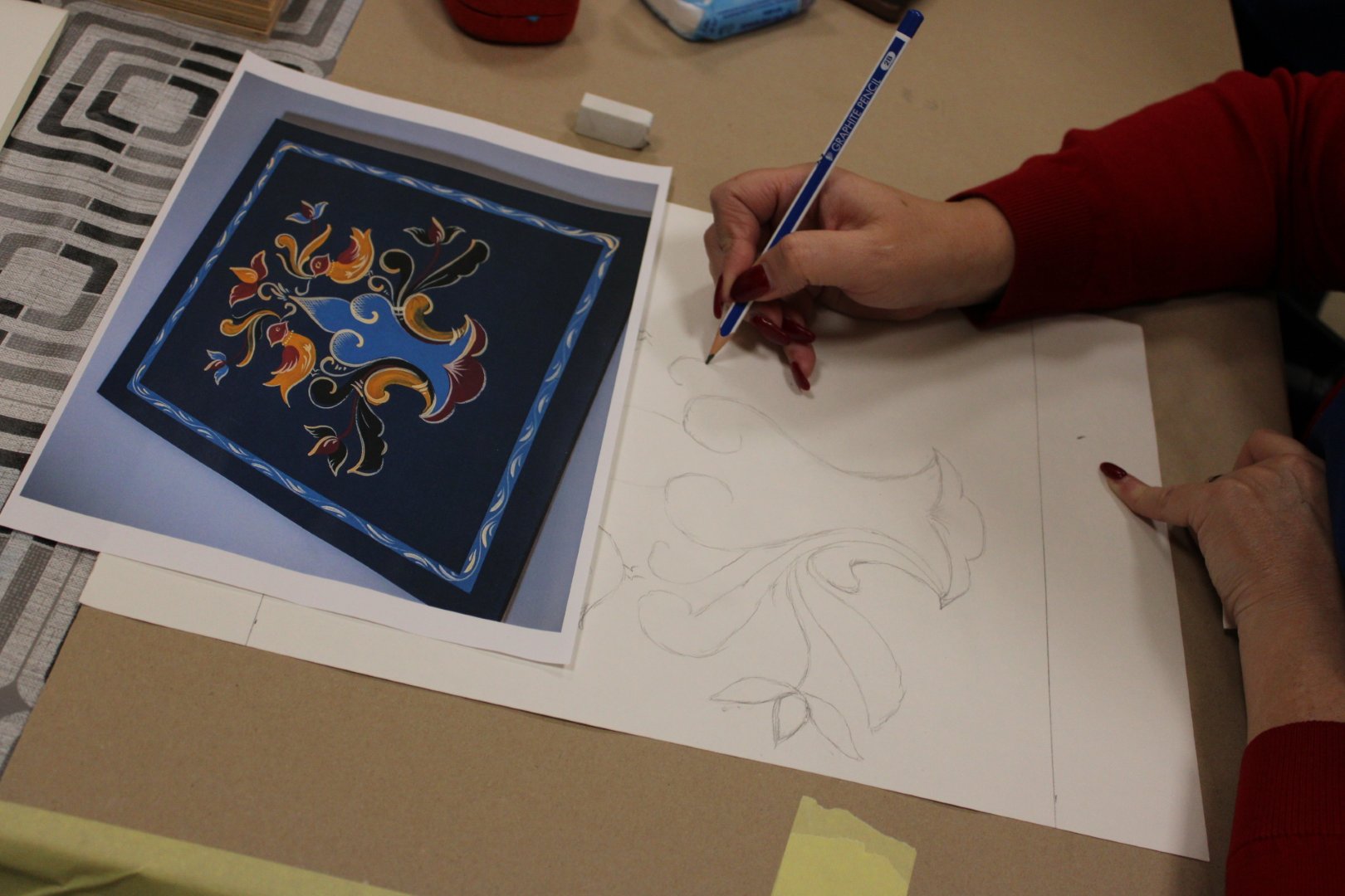 A bútorfestő szakkör tagjai szerdán virtuális kirándulást tettek az Ormánságba, pontosabban a kórósi református templom mennyezetkazettáit vették alaposabban szemügyre. Ezután készítették el a munkadarab vázlatát, majd a színkeverést követően felvitték az alapszínt. A legközelebbi szakköri alkalmon kezdődhet is majd az ormánsági motívumok megfestése!