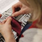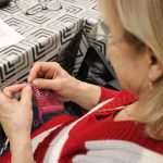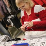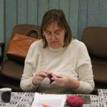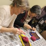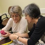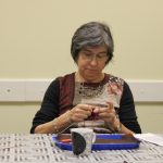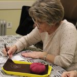 A gyöngykötő szakkör tagjai ismét együtt tölthették a kedd délutánt székházunkban. Miután előző alkalommal felfűzték a vízfolyásos mintához elegendő mennyiségű gyöngyszemet és megkezdték a munkát, ezúttal tovább kötötték a telefontokot. A lyuksorok elkészítése után a gyöngyminta kialakításával foglalkoztak nagy igyekezettel, hogy minél előbb elkészüljön a munkadarab.