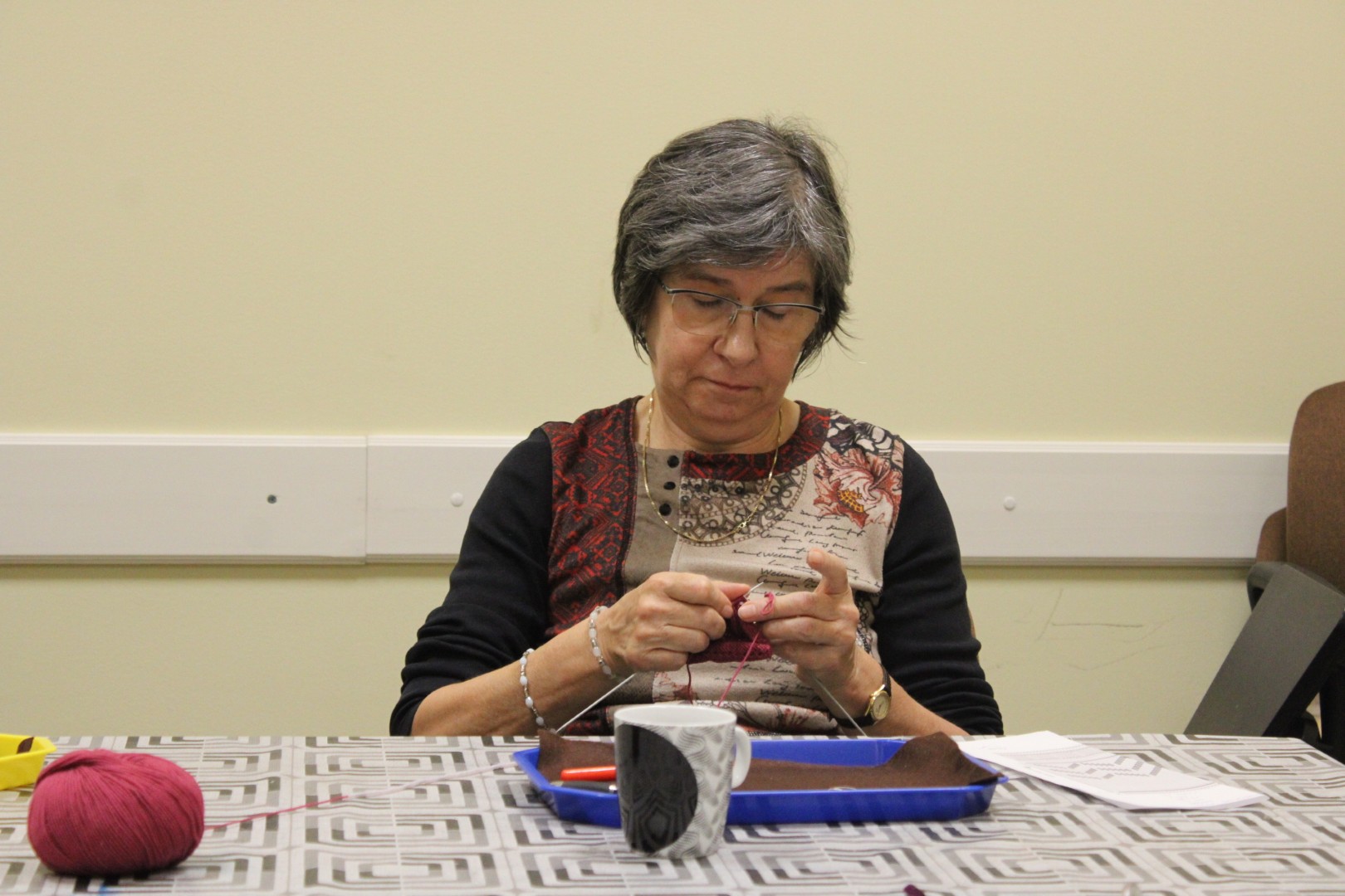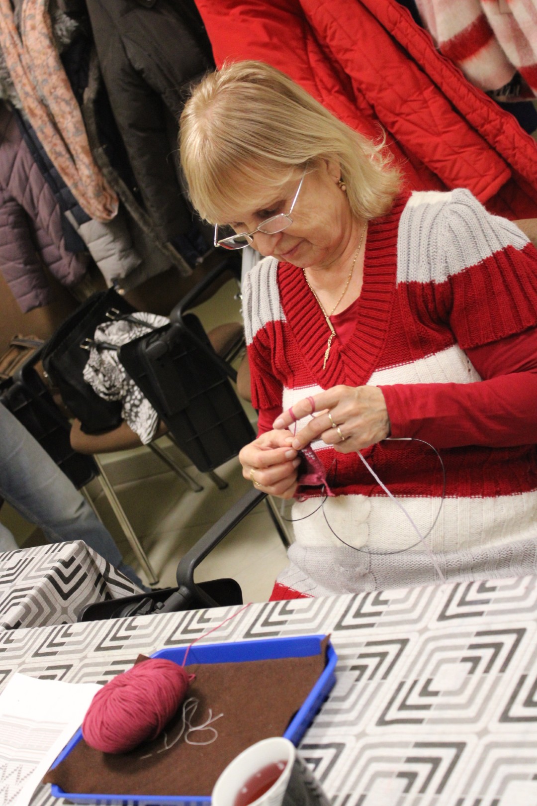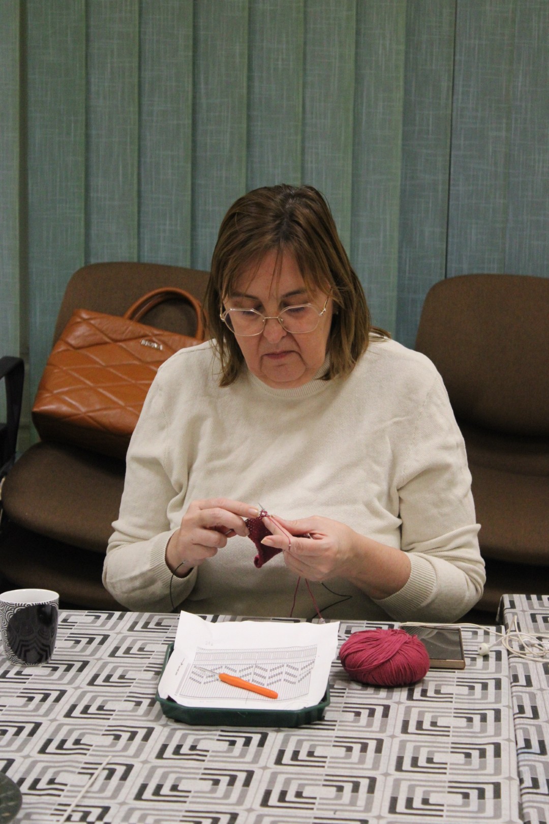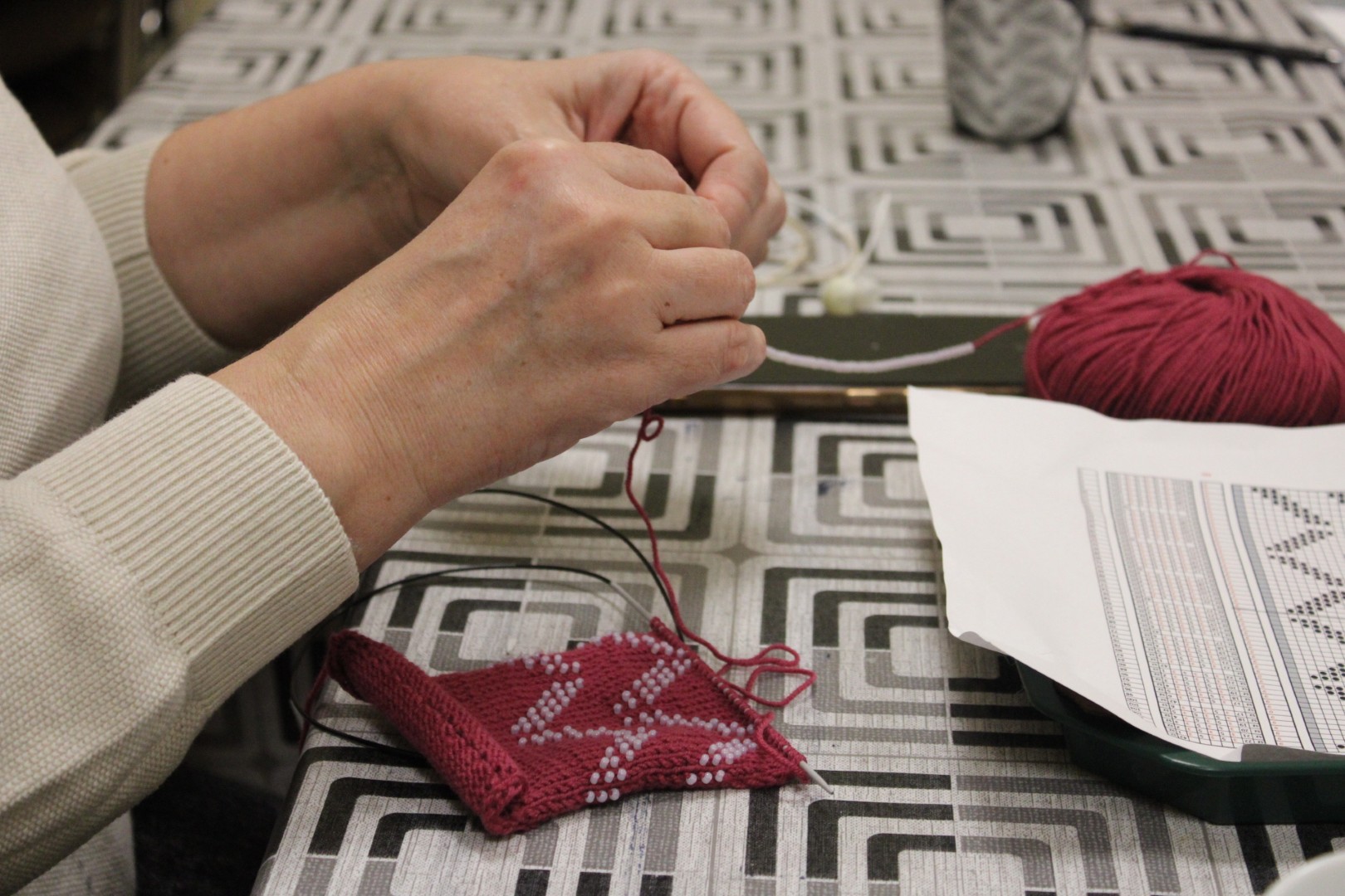 A gyöngykötő szakkör tagjai ismét együtt tölthették a kedd délutánt székházunkban. Miután előző alkalommal felfűzték a vízfolyásos mintához elegendő mennyiségű gyöngyszemet és megkezdték a munkát, ezúttal tovább kötötték a telefontokot. A lyuksorok elkészítése után a gyöngyminta kialakításával foglalkoztak nagy igyekezettel, hogy minél előbb elkészüljön a munkadarab.