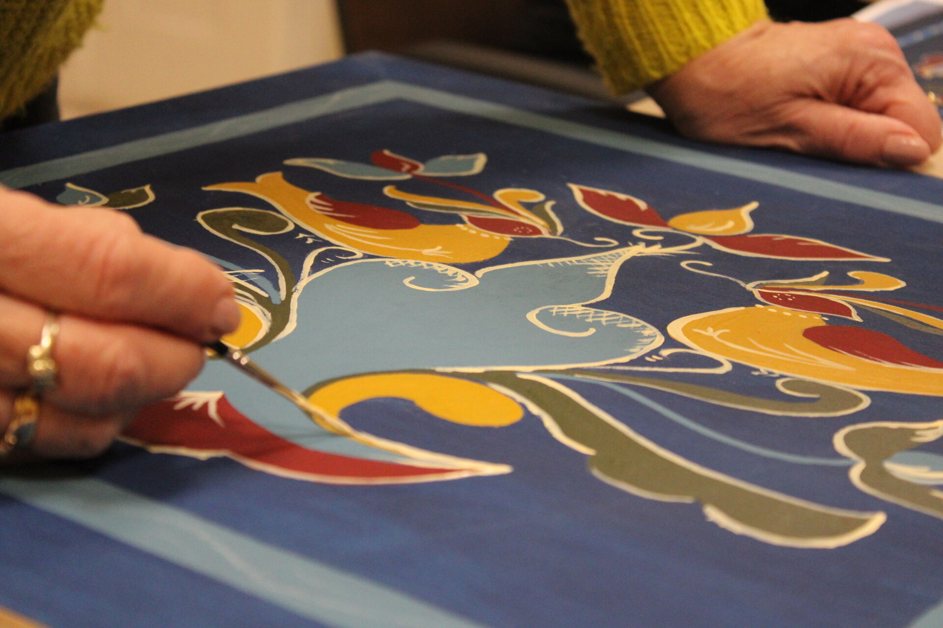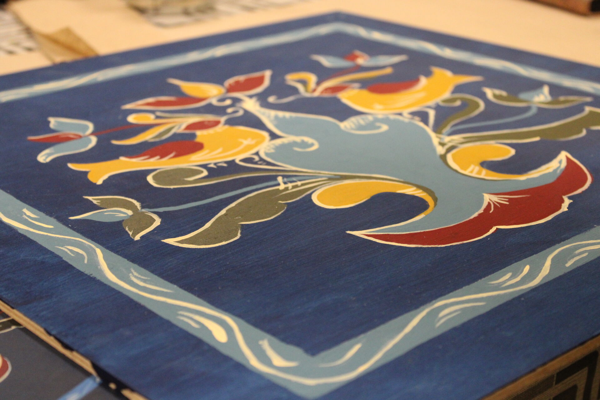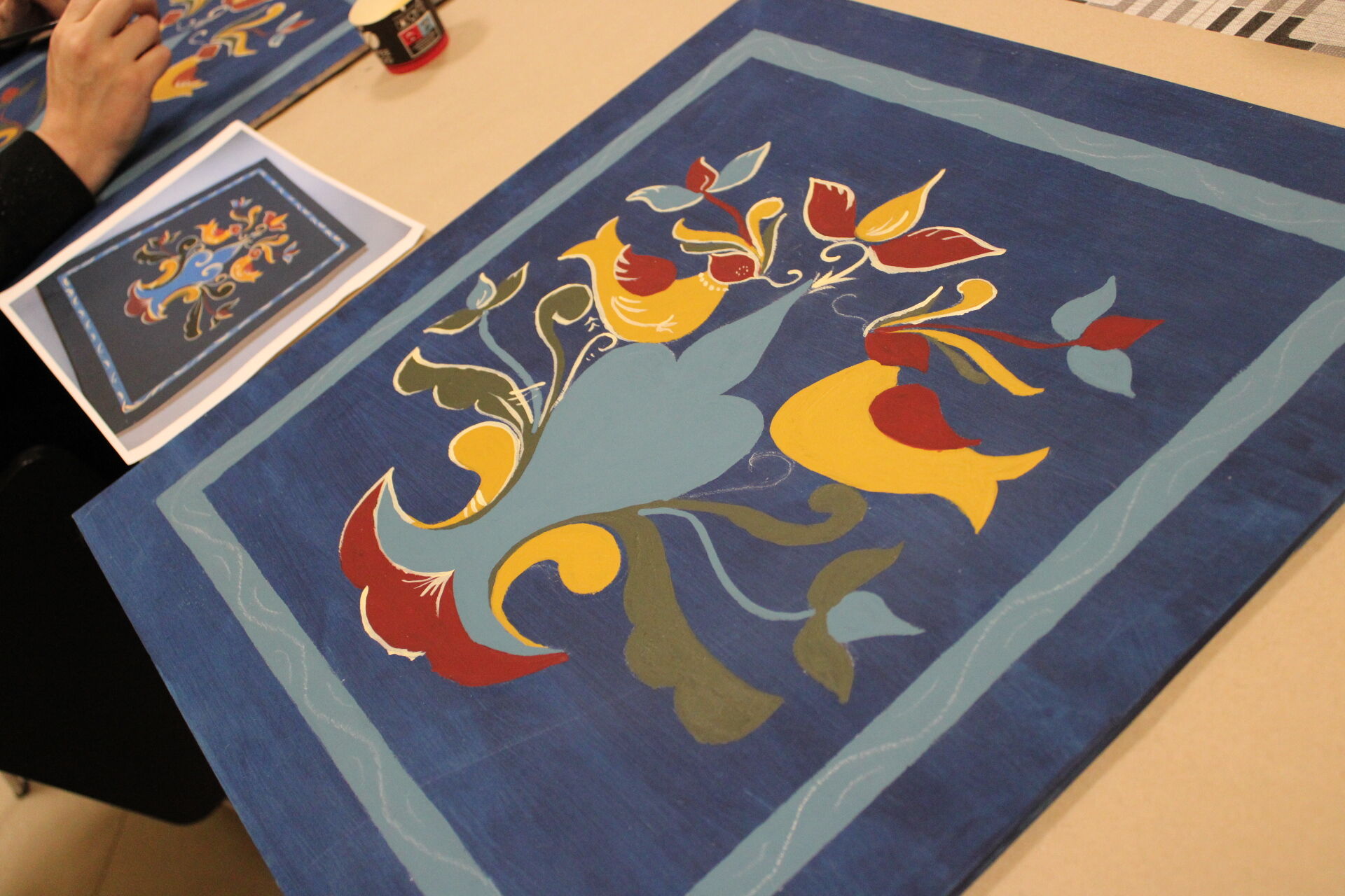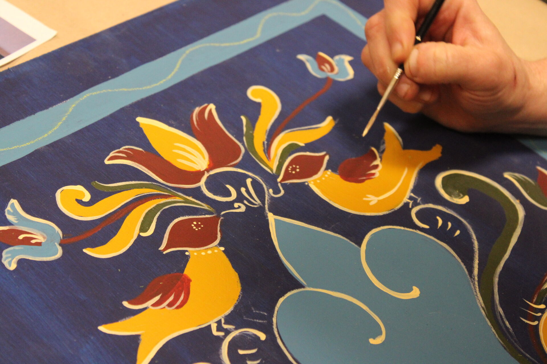 A bútorfestő szakkör szorgos csapata ismét elmélyült munkával töltötte a szerda délutánt. Elérkeztek a kórósi templomkazetta kidolgozásának végéhez. A megfelelő szín kikeverése után sor került a fények és a szegélydísz felfestésére is, ami megadta a motívumok végső formáját, dinamikáját. A feladat sikeres teljesítése után új tájegység mintáit ismerhetik meg a szakkörösök, természetesen egy újabb munkadarab kidogozása által.