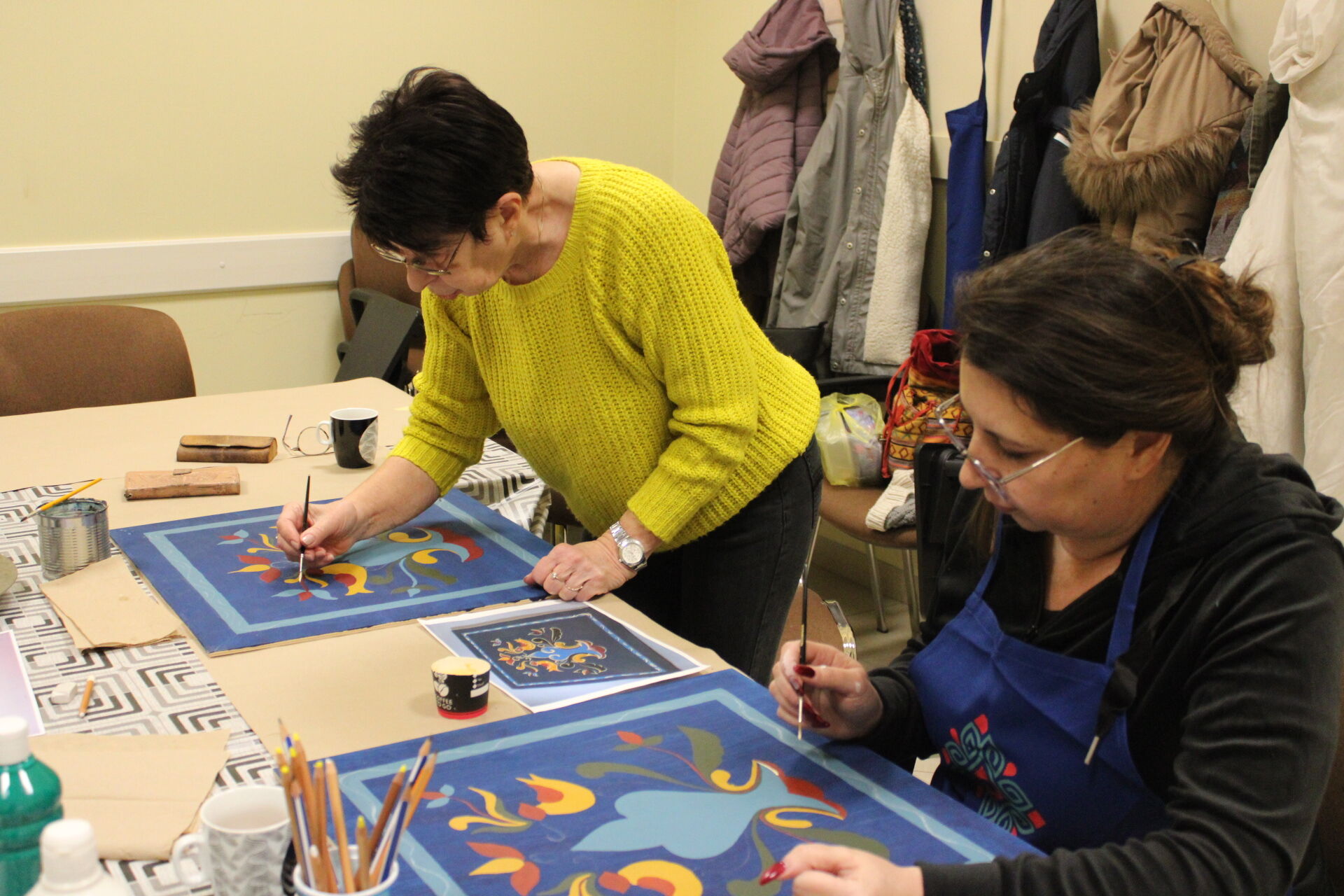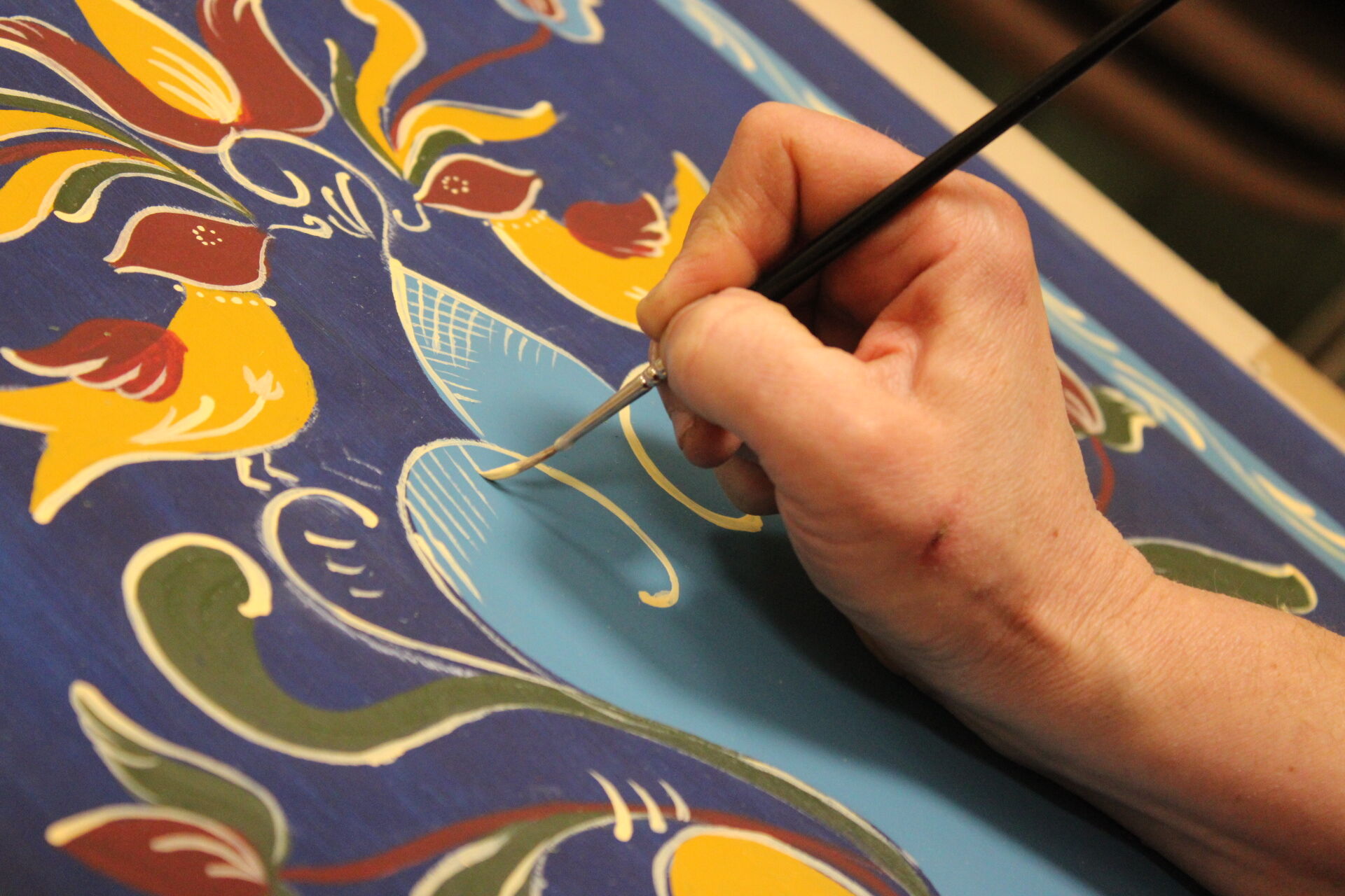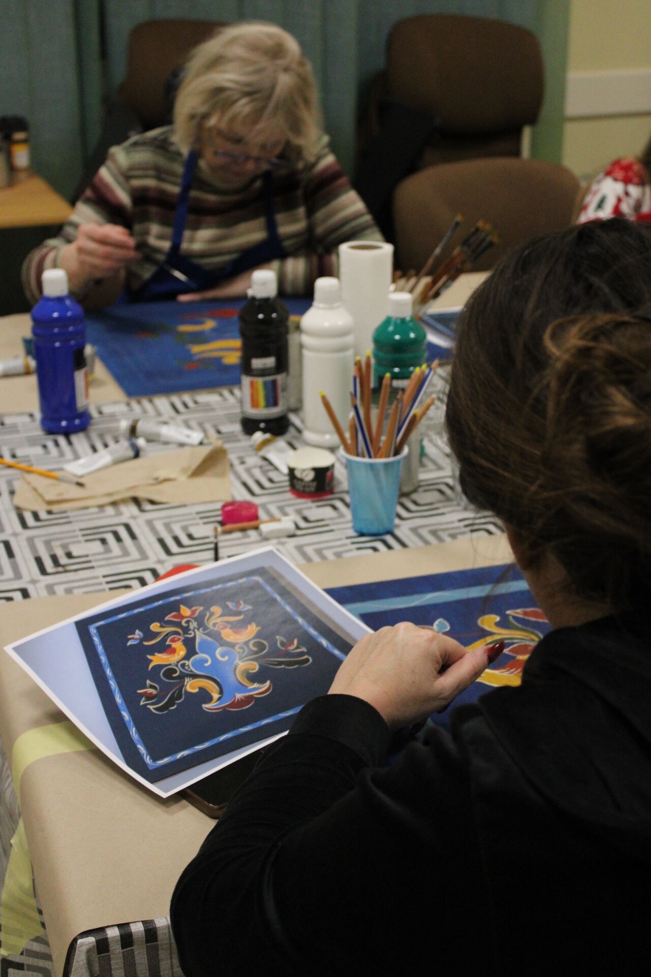 A bútorfestő szakkör szorgos csapata ismét elmélyült munkával töltötte a szerda délutánt. Elérkeztek a kórósi templomkazetta kidolgozásának végéhez. A megfelelő szín kikeverése után sor került a fények és a szegélydísz felfestésére is, ami megadta a motívumok végső formáját, dinamikáját. A feladat sikeres teljesítése után új tájegység mintáit ismerhetik meg a szakkörösök, természetesen egy újabb munkadarab kidogozása által.