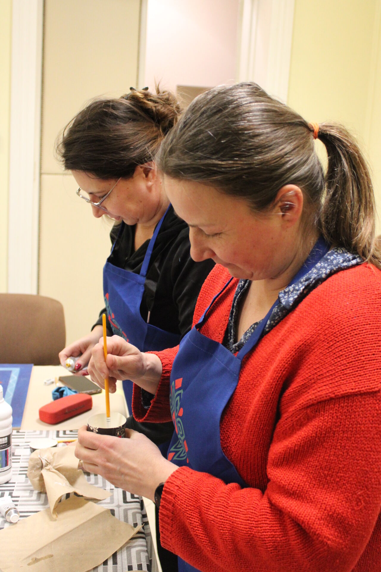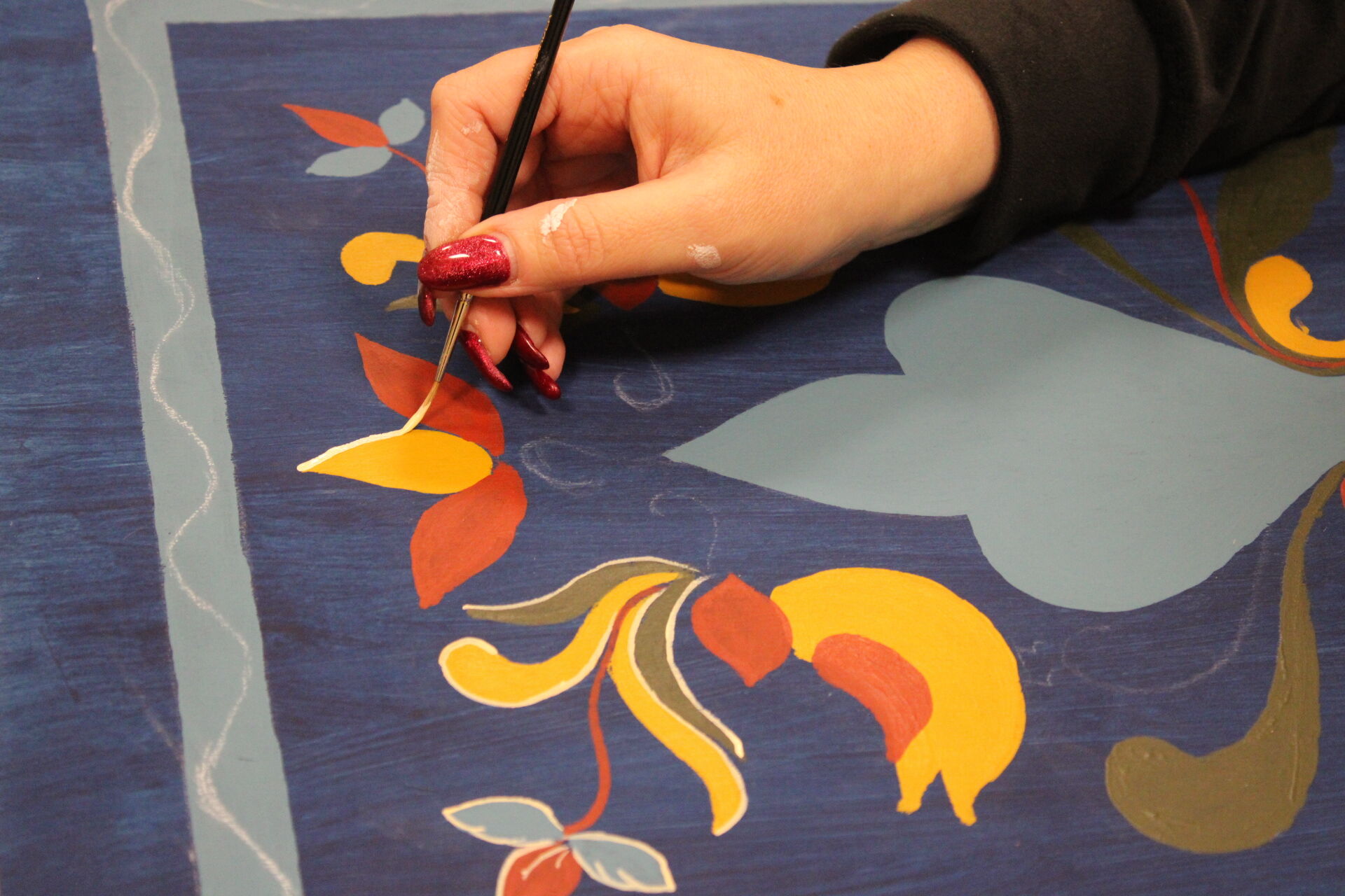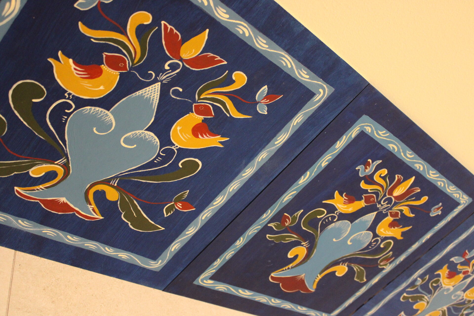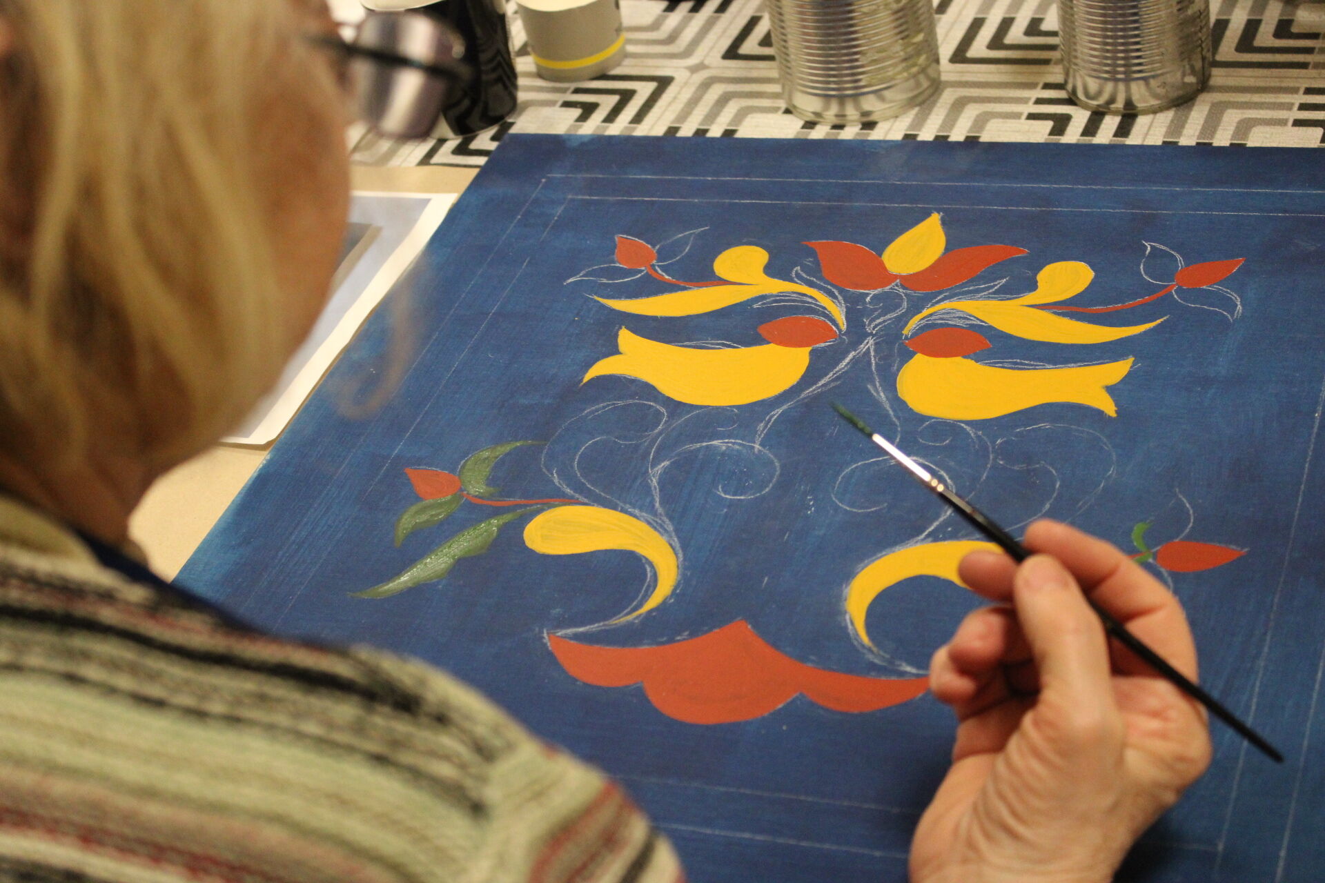 A bútorfestő szakkör szorgos csapata ismét elmélyült munkával töltötte a szerda délutánt. Elérkeztek a kórósi templomkazetta kidolgozásának végéhez. A megfelelő szín kikeverése után sor került a fények és a szegélydísz felfestésére is, ami megadta a motívumok végső formáját, dinamikáját. A feladat sikeres teljesítése után új tájegység mintáit ismerhetik meg a szakkörösök, természetesen egy újabb munkadarab kidogozása által.