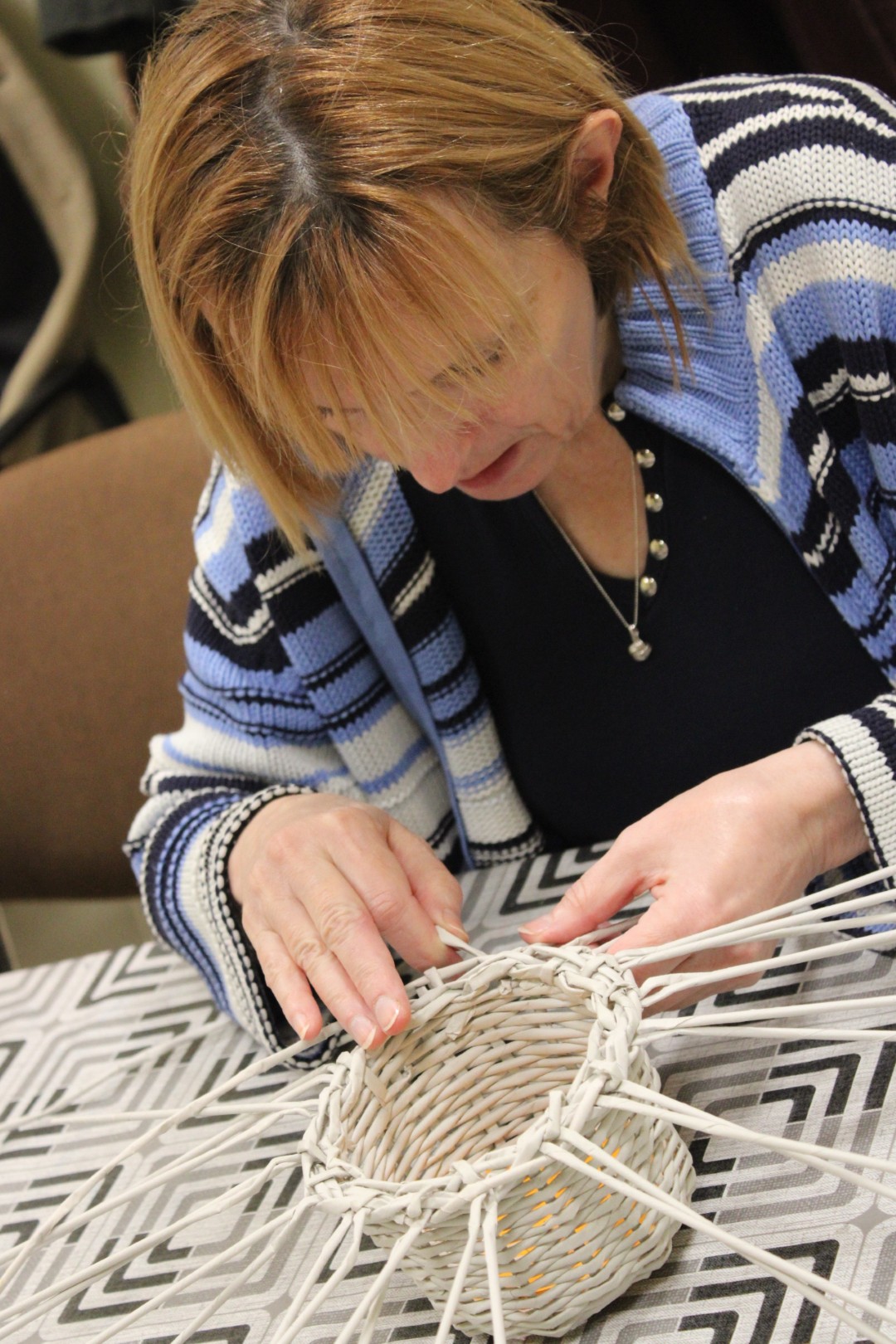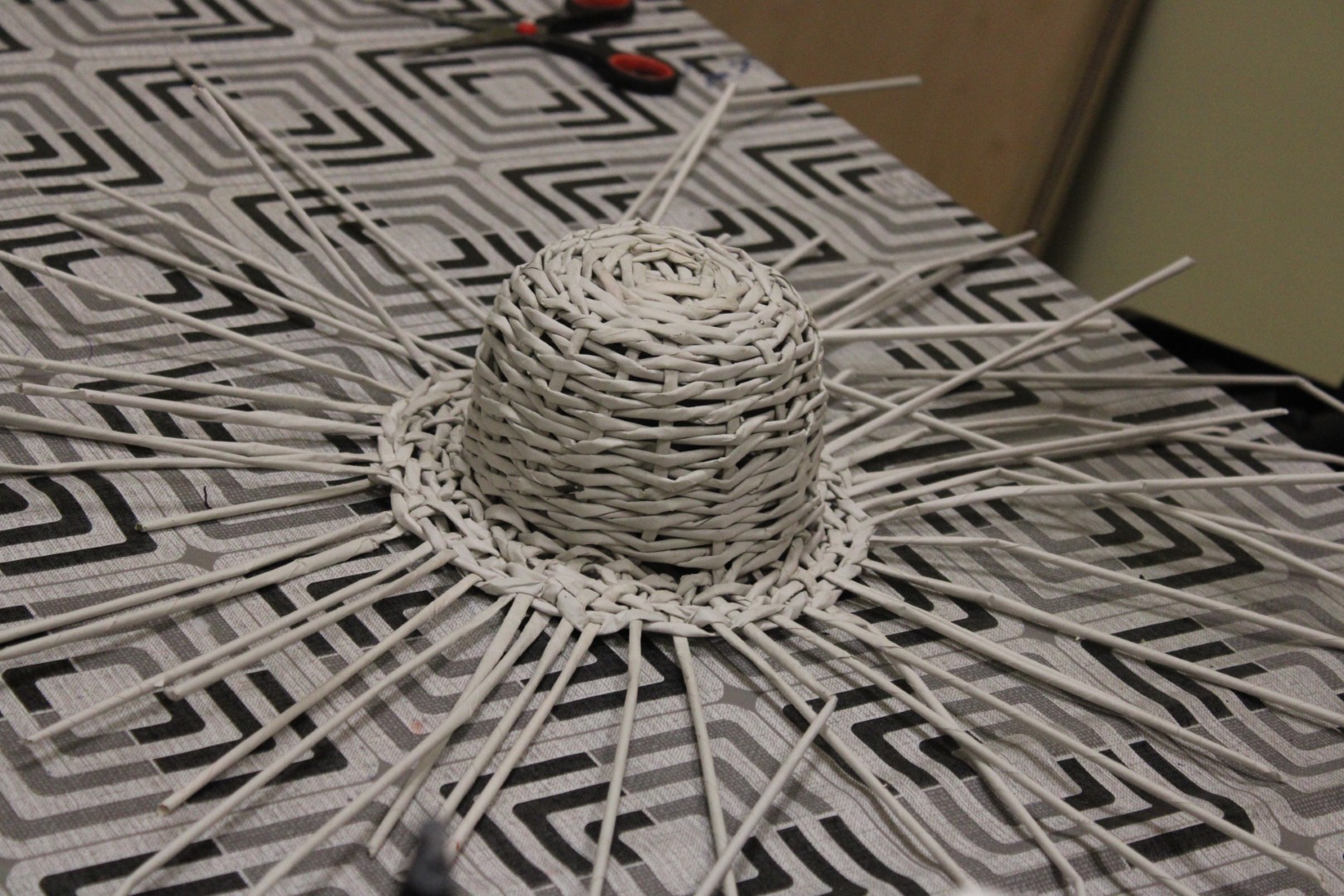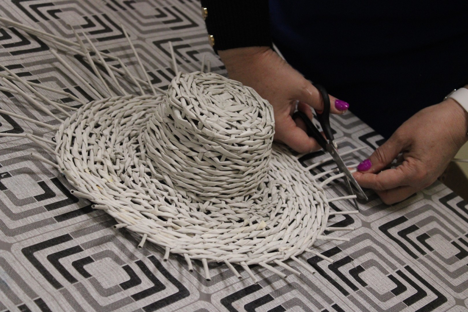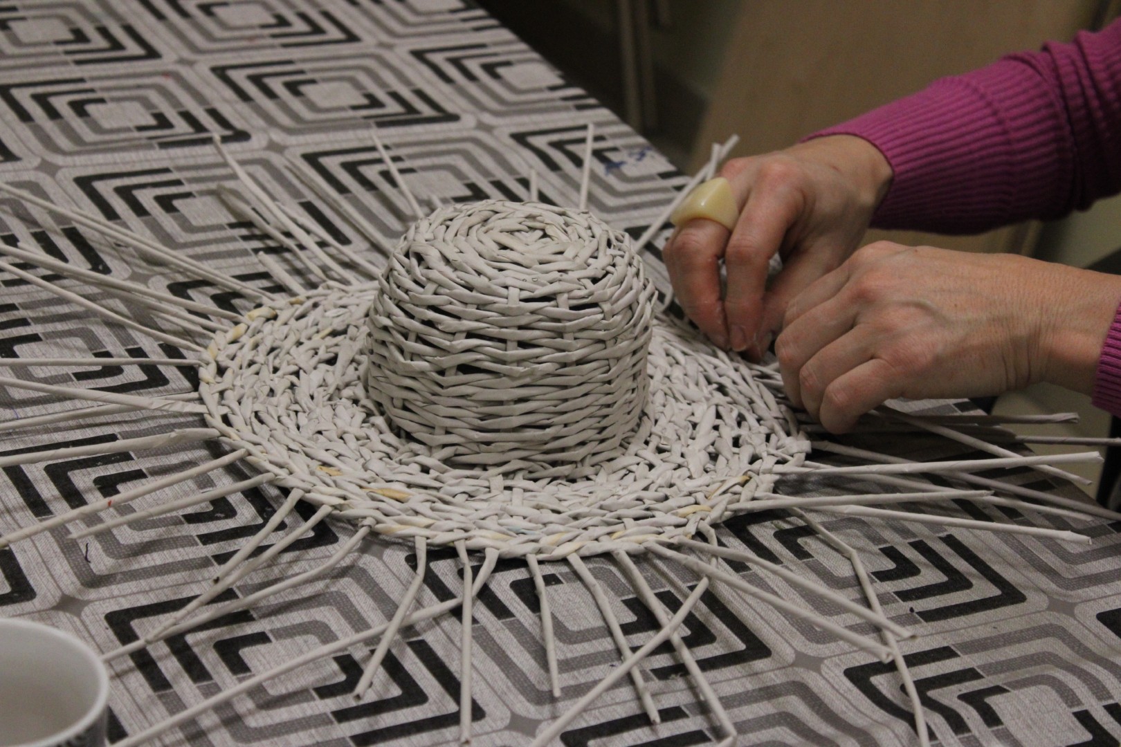 A papírfonó szakkör összejövetelének hétfői alkalmán a csoporttagok folytatták a fehér kalap fonását. A kétszálas gyűrűfonás technikáját használva elkészültek a karimák is, így a fonószálak eldolgozásával be is fejeződött ez a feladat. Következő alkalommal új munkadarab és új technikák elsajátítása vár a szakkörösökre.