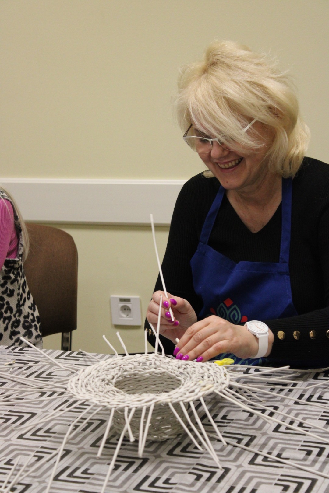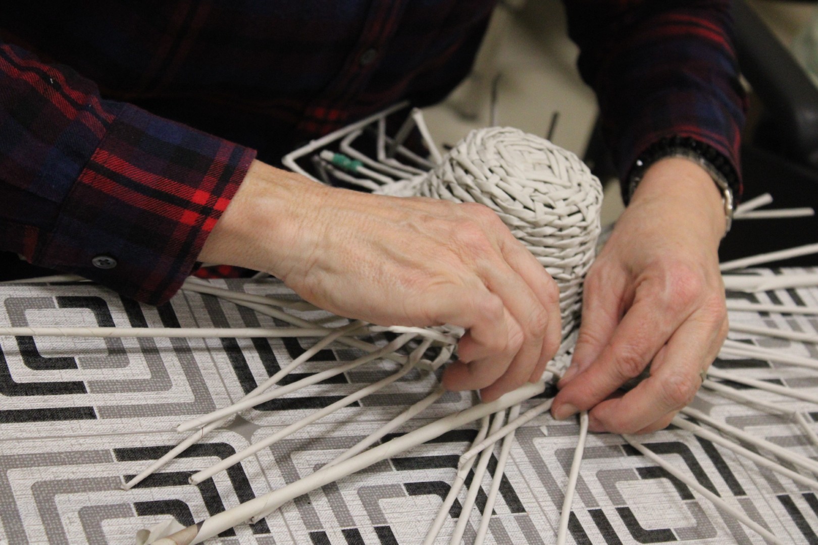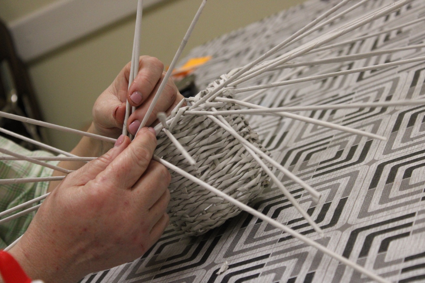 A papírfonó szakkör összejövetelének hétfői alkalmán a csoporttagok folytatták a fehér kalap fonását. A kétszálas gyűrűfonás technikáját használva elkészültek a karimák is, így a fonószálak eldolgozásával be is fejeződött ez a feladat. Következő alkalommal új munkadarab és új technikák elsajátítása vár a szakkörösökre.