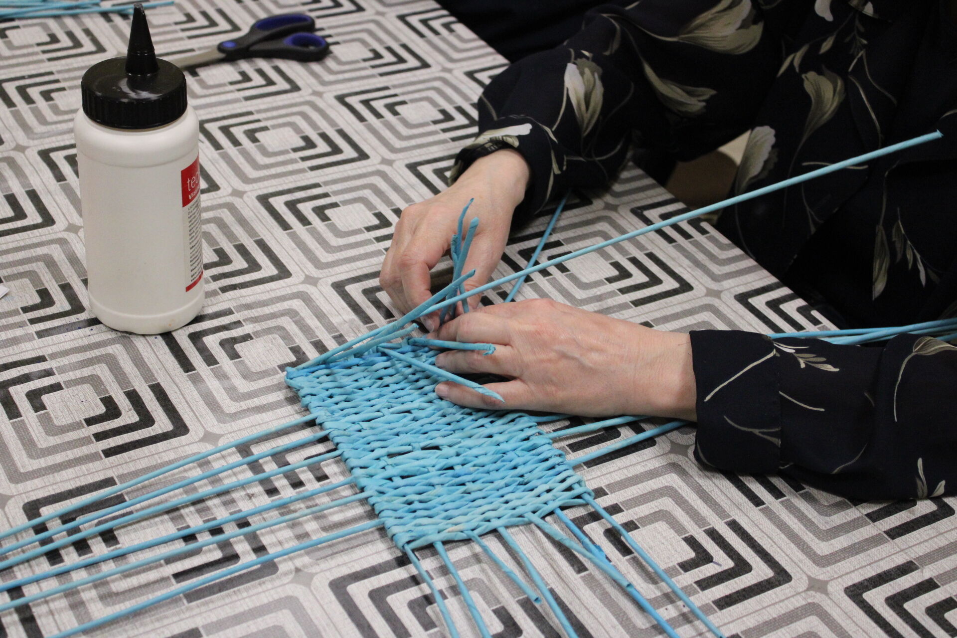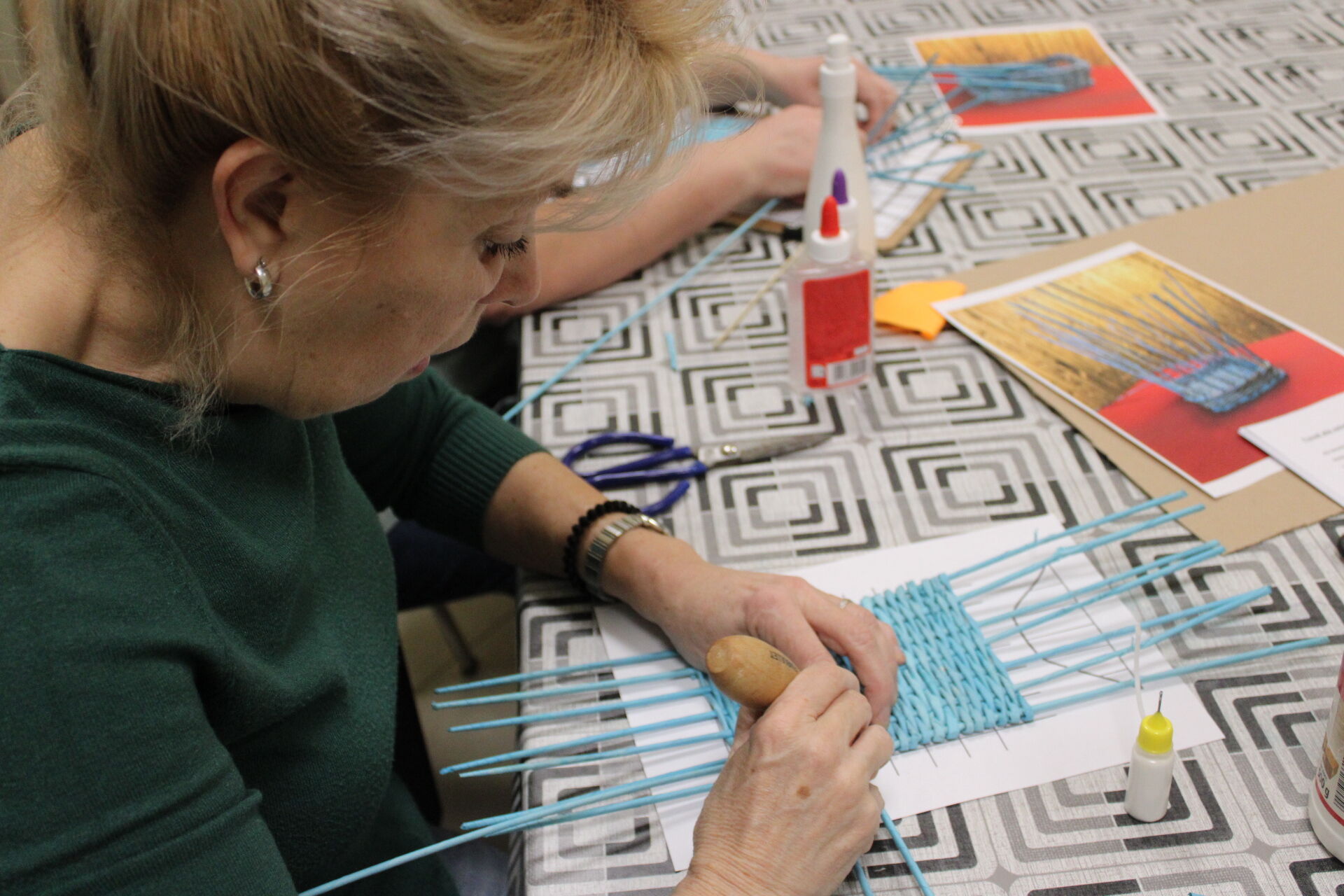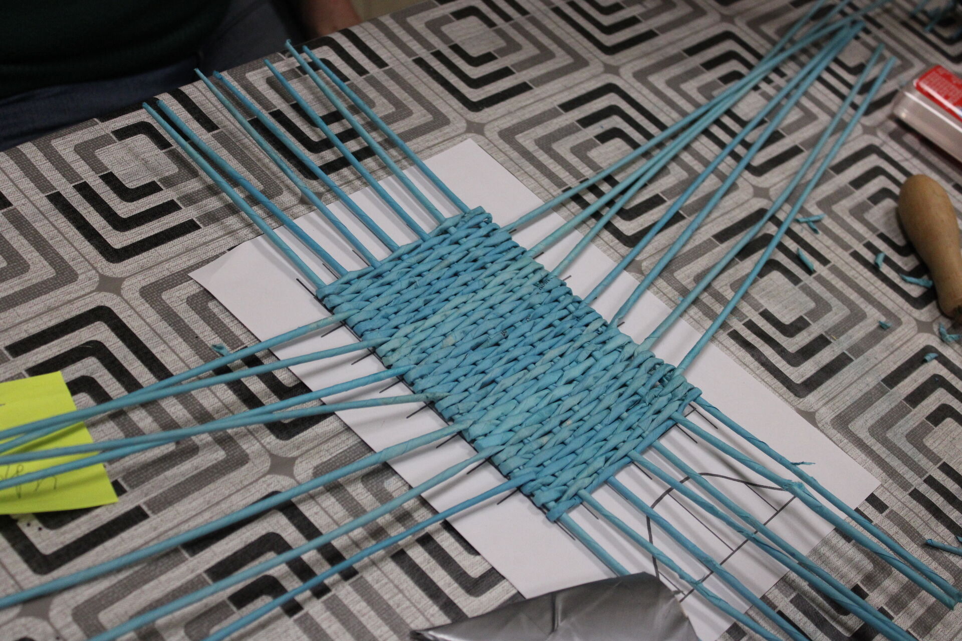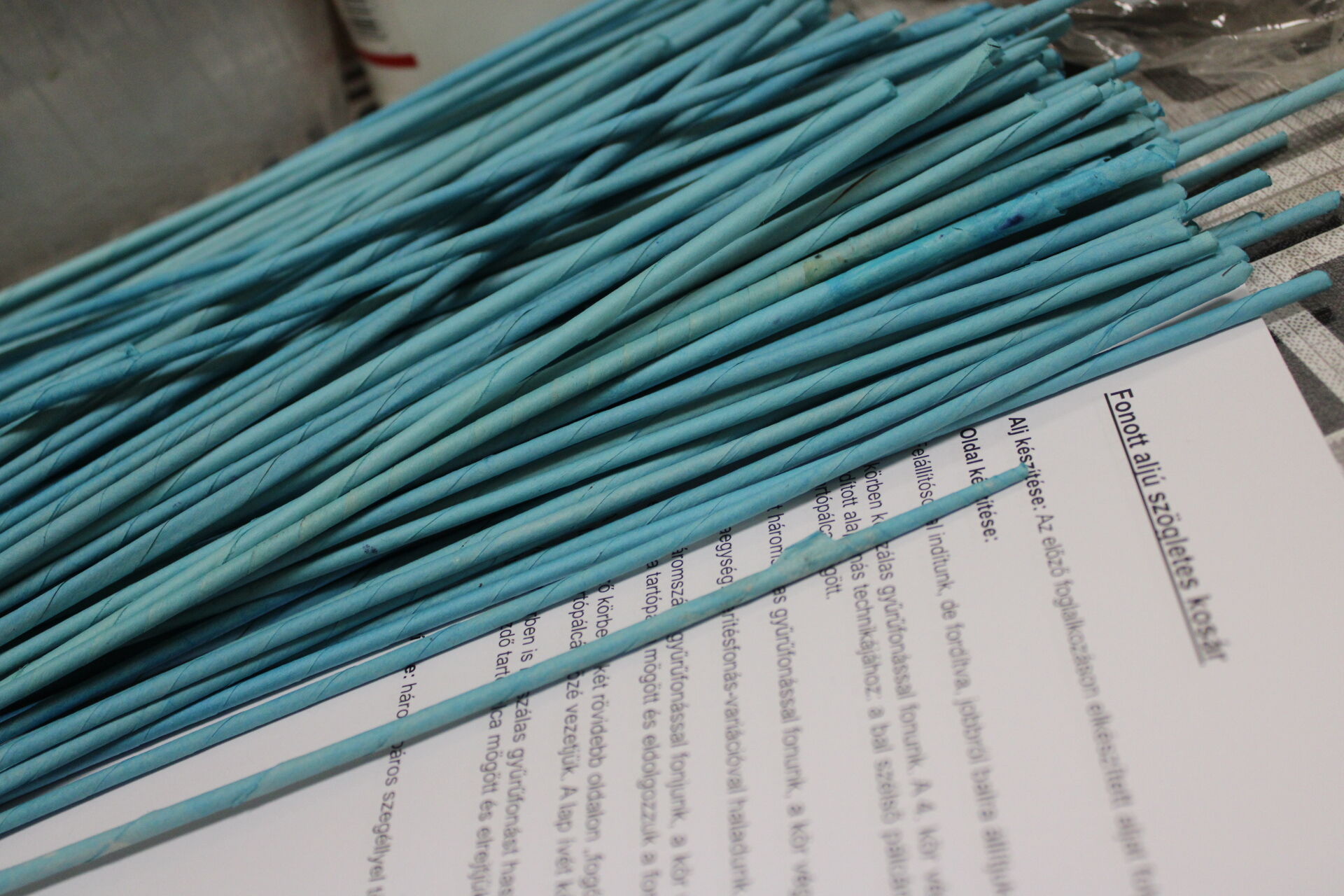 A papírfonó szakkör szorgos tagjai ezen a hétfőn folytatta a múlt héten megkezdett türkizkék fonott négyszögletű kosár készítését. Miután behelyezték az oldalsó tartópálcákat, kezdődhetett is a tároló oldalának fonása. A felállítósor elkészülte után kétsoros alapfonással dolgoztak a csoporttagok, jövő héten pedig tovább folytatják a kosárkát.