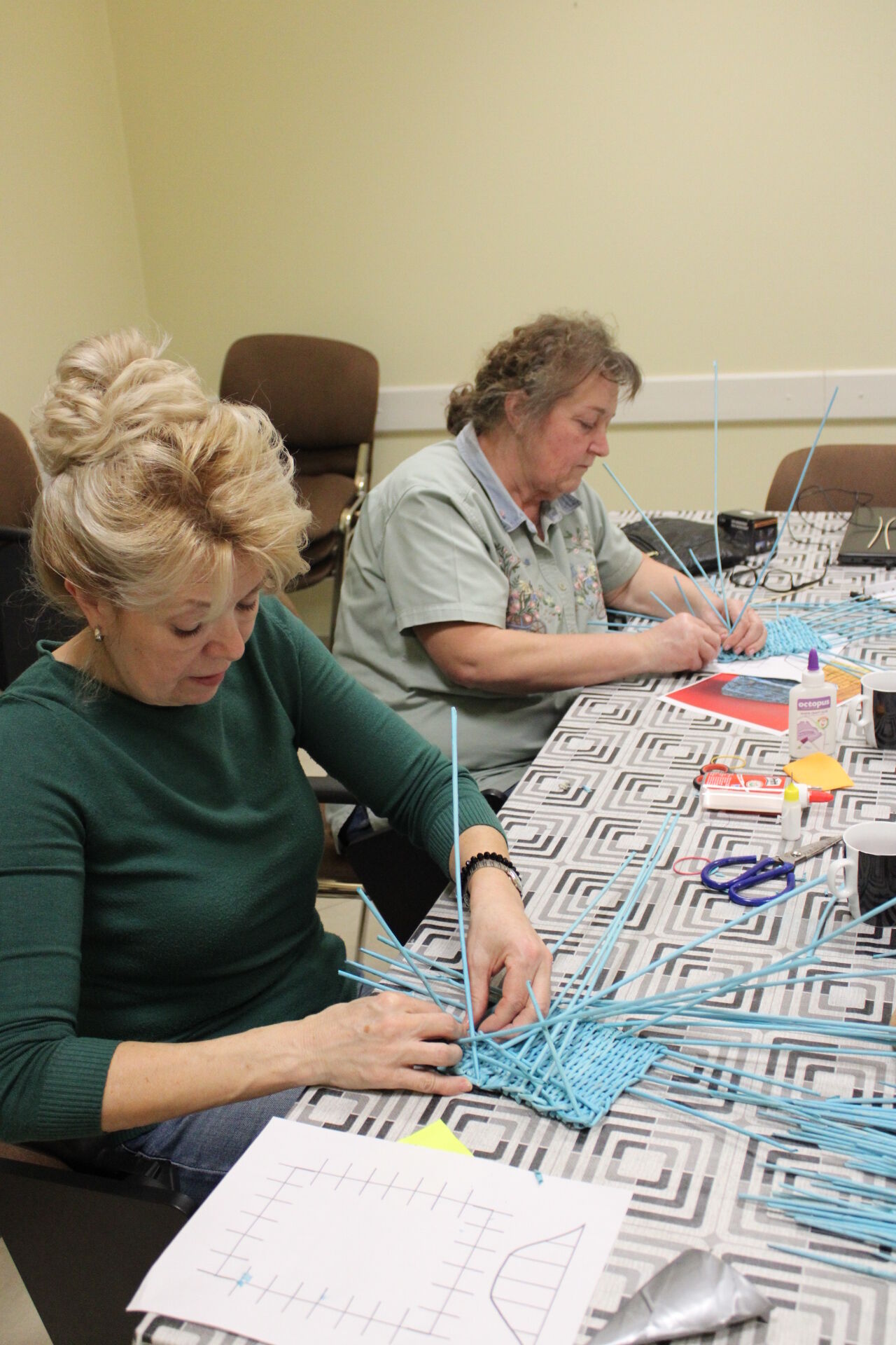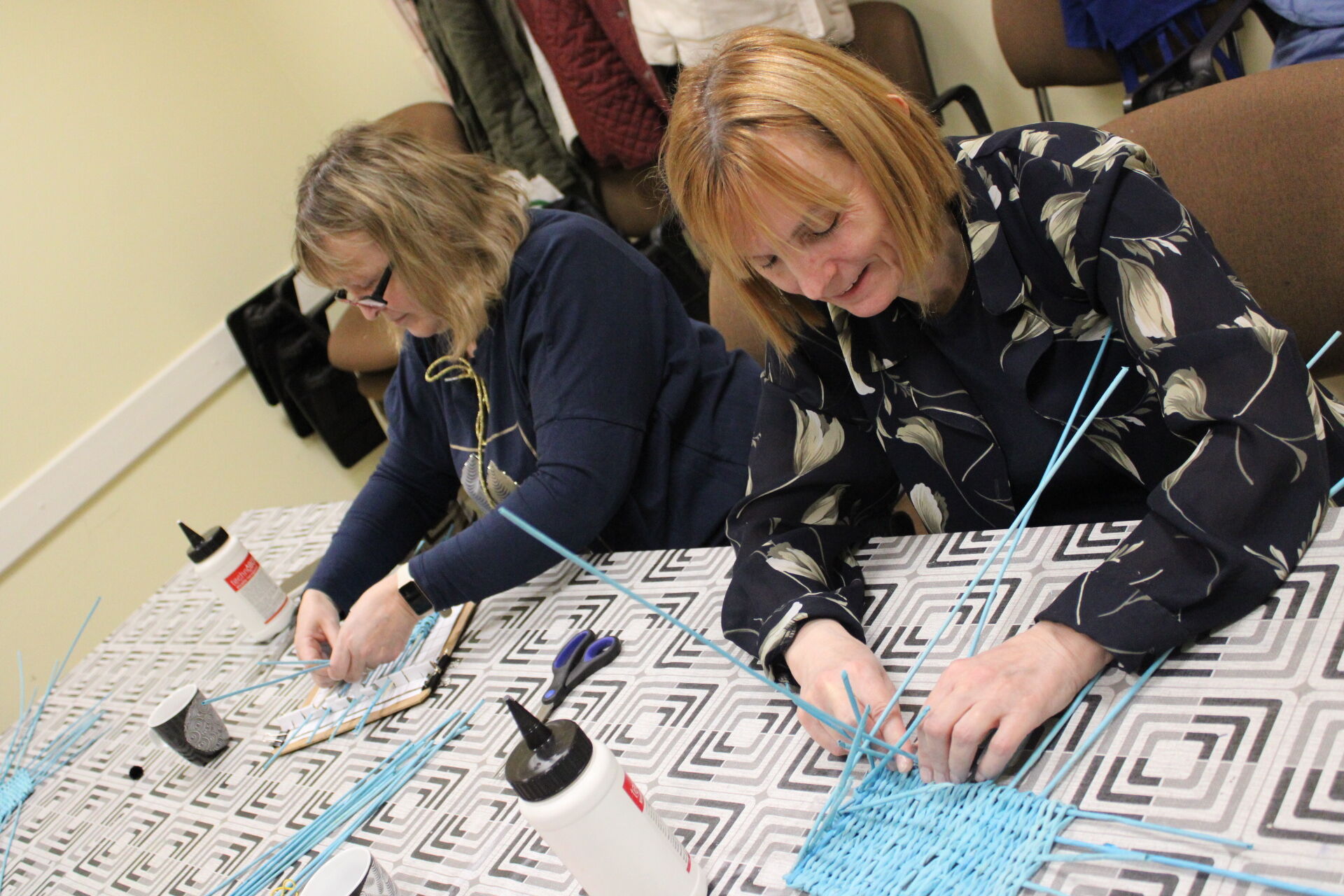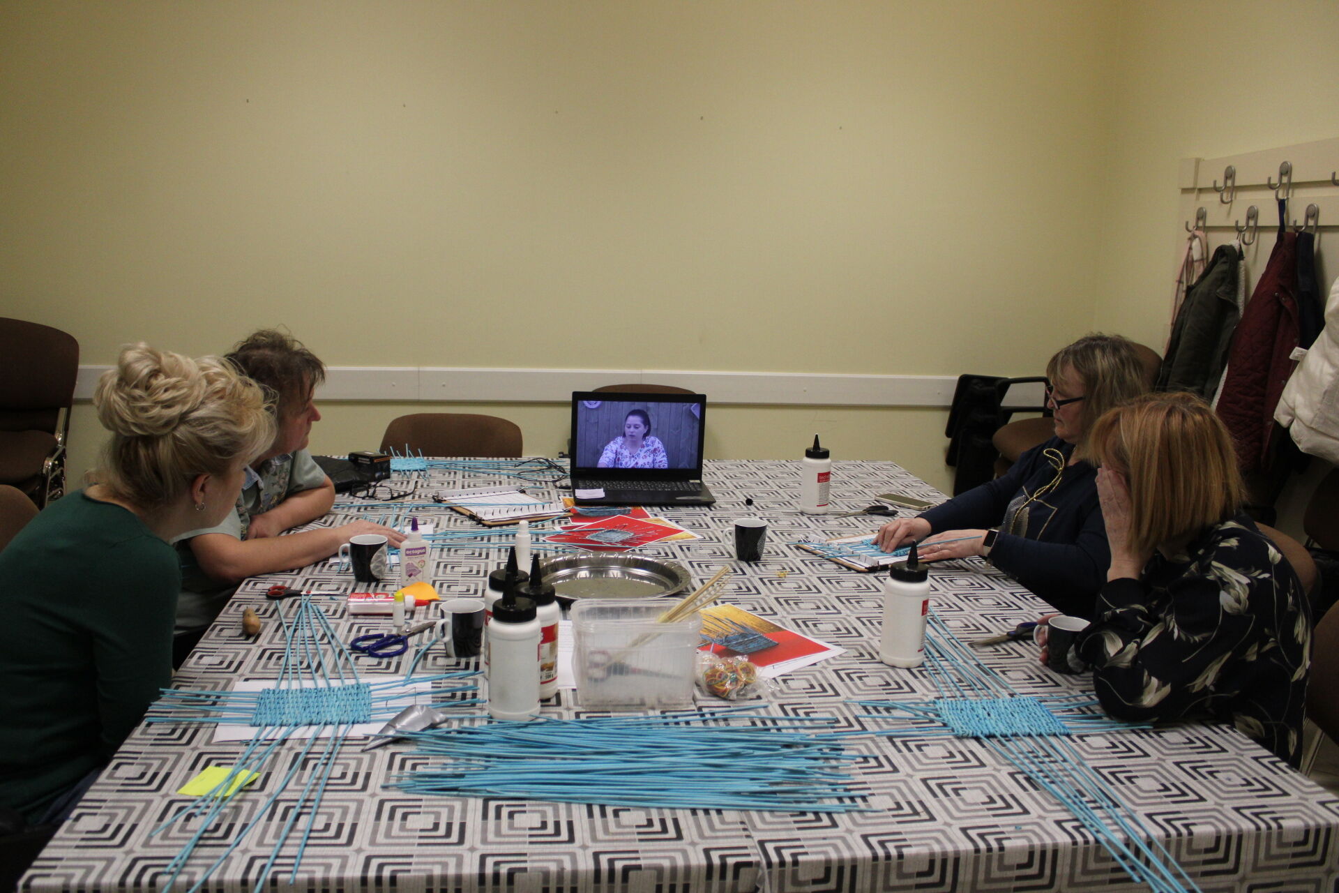 A papírfonó szakkör szorgos tagjai ezen a hétfőn folytatta a múlt héten megkezdett türkizkék fonott négyszögletű kosár készítését. Miután behelyezték az oldalsó tartópálcákat, kezdődhetett is a tároló oldalának fonása. A felállítósor elkészülte után kétsoros alapfonással dolgoztak a csoporttagok, jövő héten pedig tovább folytatják a kosárkát.