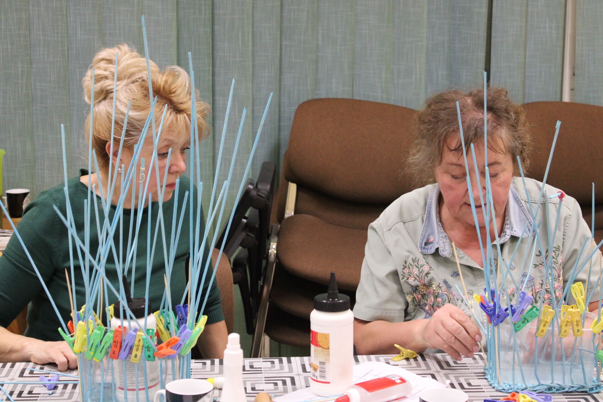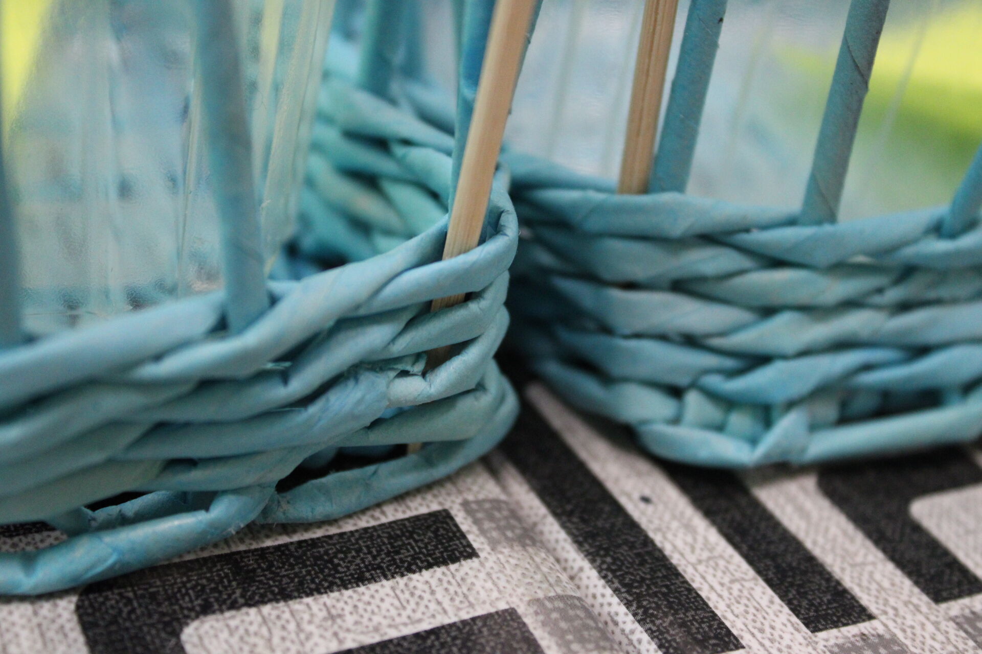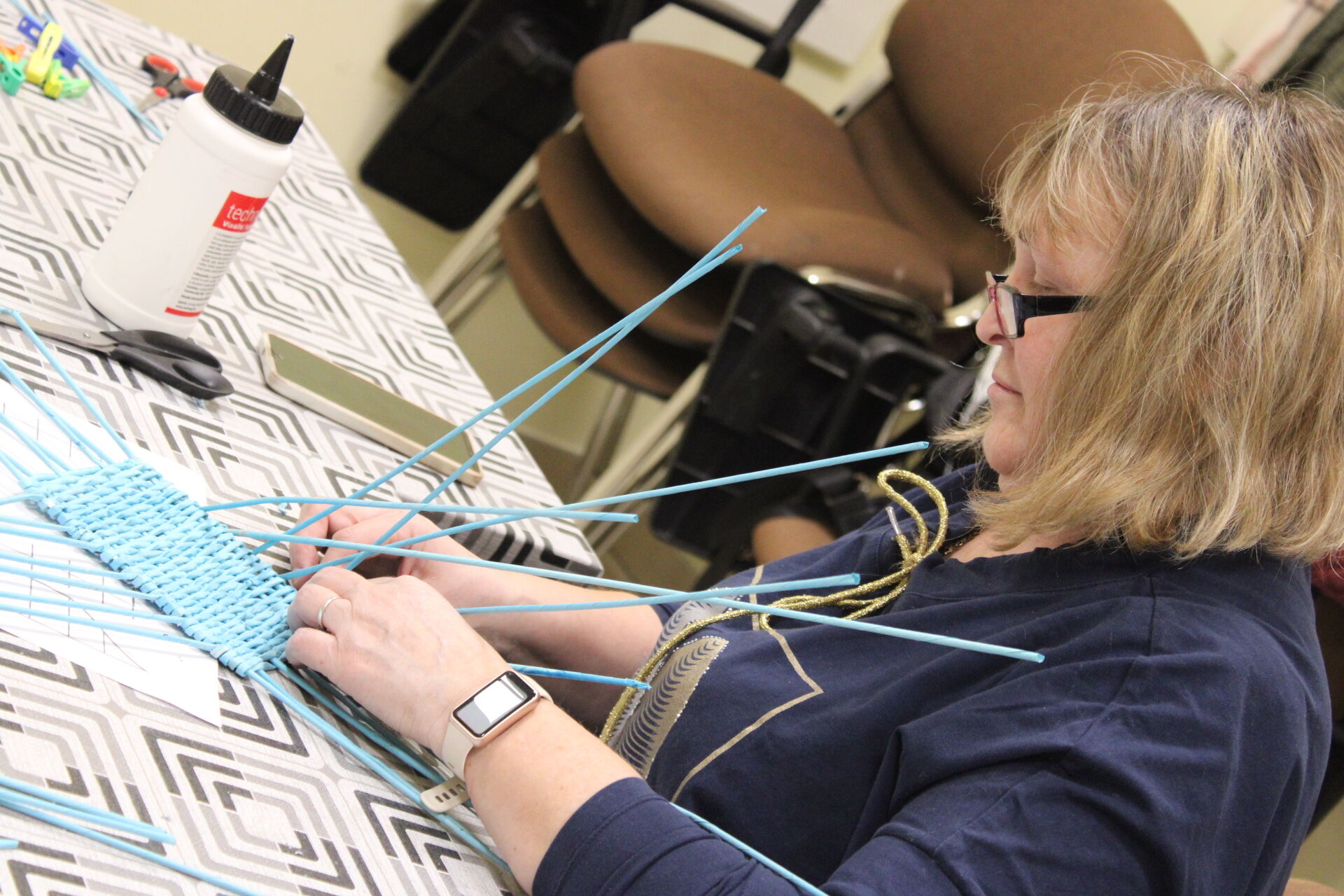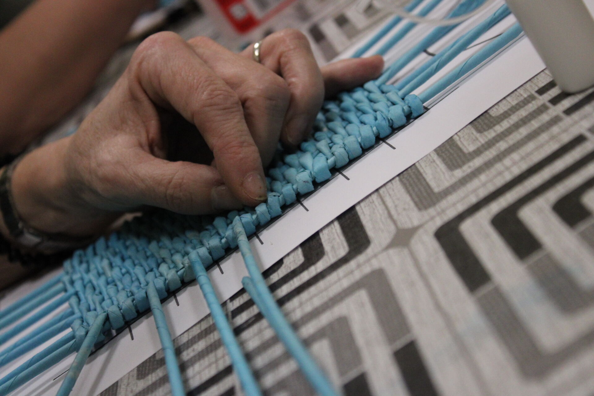 A papírfonó szakkör szorgos tagjai ezen a hétfőn folytatta a múlt héten megkezdett türkizkék fonott négyszögletű kosár készítését. Miután behelyezték az oldalsó tartópálcákat, kezdődhetett is a tároló oldalának fonása. A felállítósor elkészülte után kétsoros alapfonással dolgoztak a csoporttagok, jövő héten pedig tovább folytatják a kosárkát.