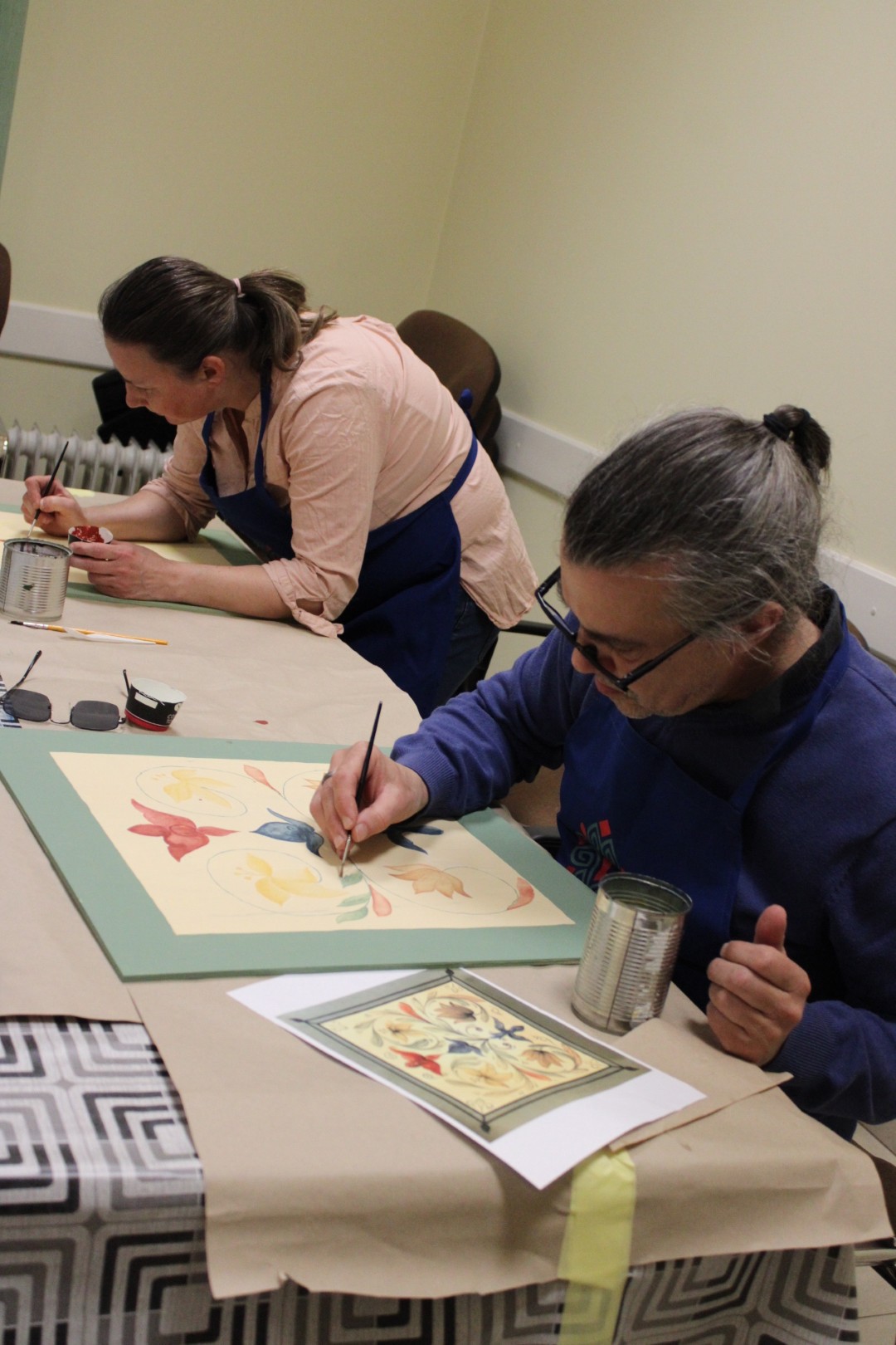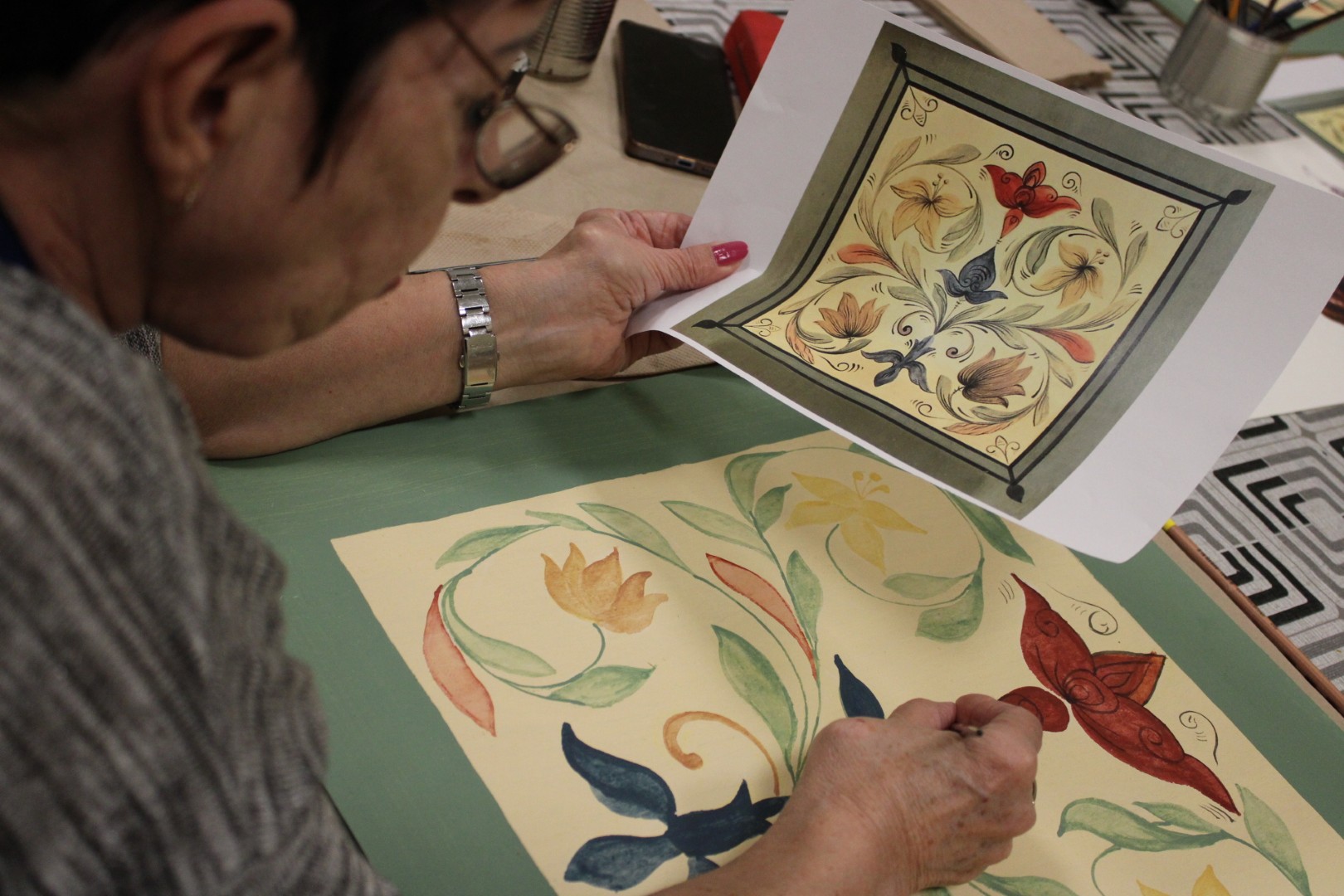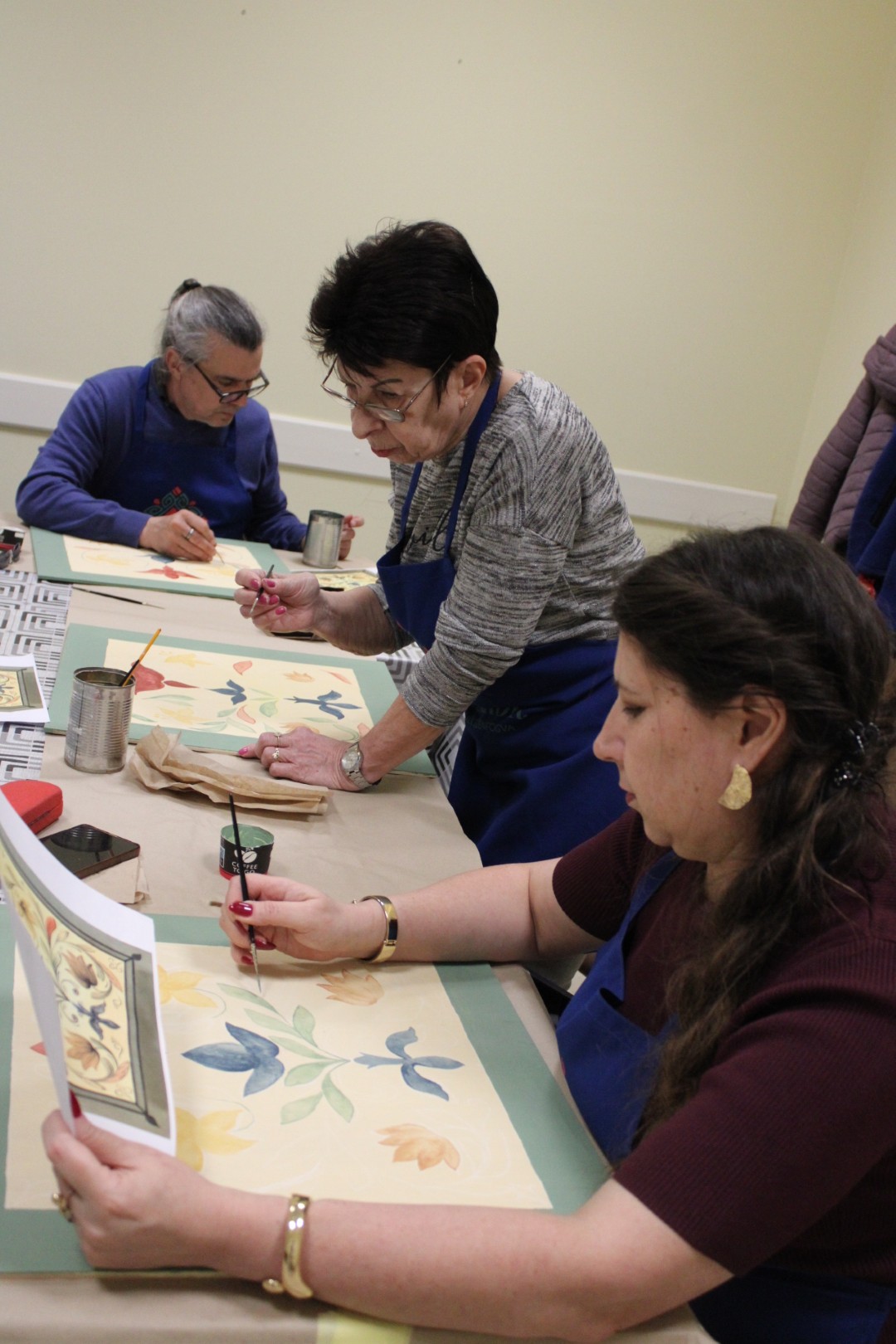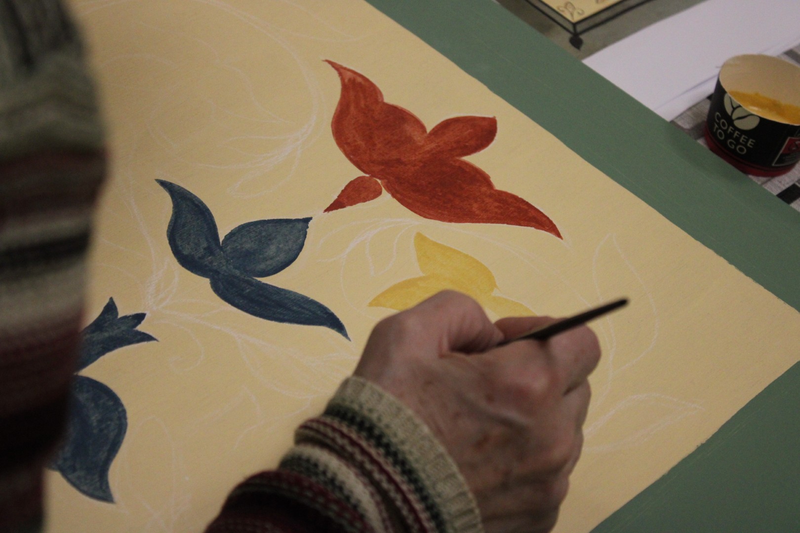 A bútorfestő szakkör tagjai ezen a szerdán is kitettek magukért. Szorgos munkájuk során tovább gazdagodott a vizesréti templomkazetta motívumrendszere. Ezen az alkalmon a megfelelő szín kikeverése után felkerültek a levelek és indák, majd kezdődhetett az árnyékok festése, amely különleges hatást ad majd a kész munkadarabnak.