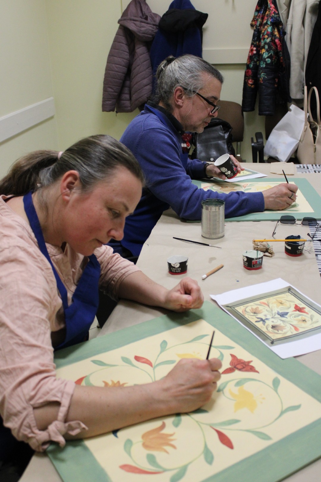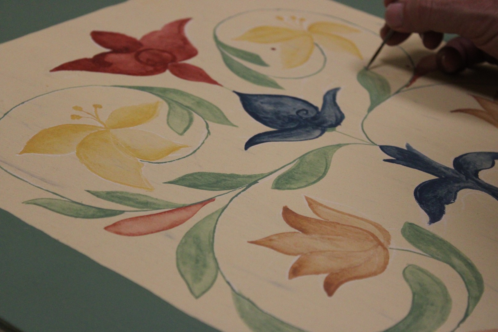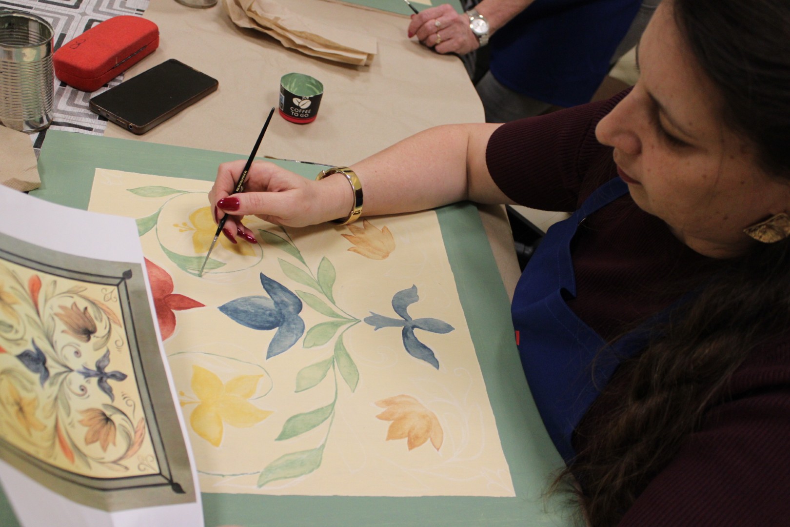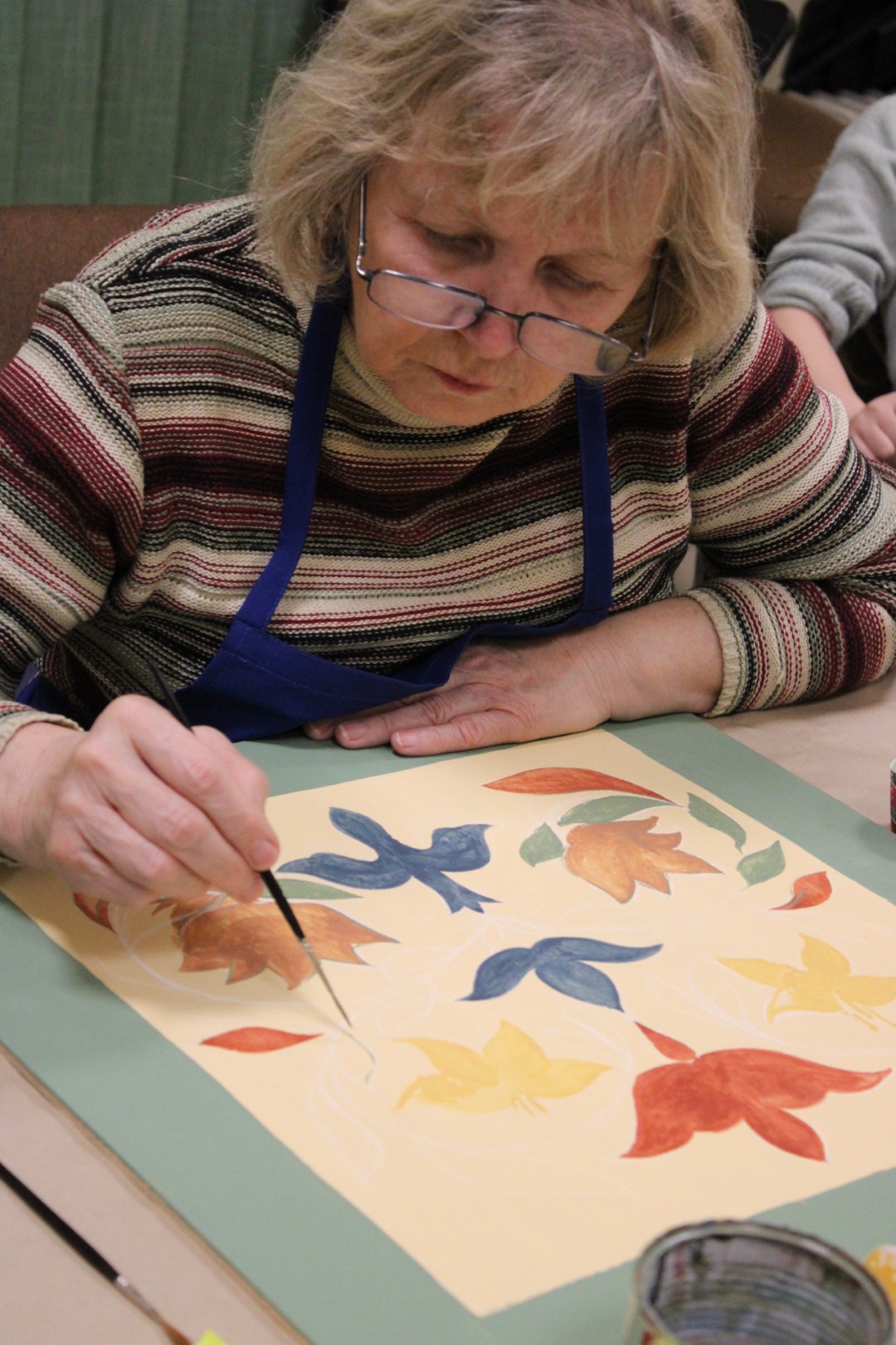 A bútorfestő szakkör tagjai ezen a szerdán is kitettek magukért. Szorgos munkájuk során tovább gazdagodott a vizesréti templomkazetta motívumrendszere. Ezen az alkalmon a megfelelő szín kikeverése után felkerültek a levelek és indák, majd kezdődhetett az árnyékok festése, amely különleges hatást ad majd a kész munkadarabnak.