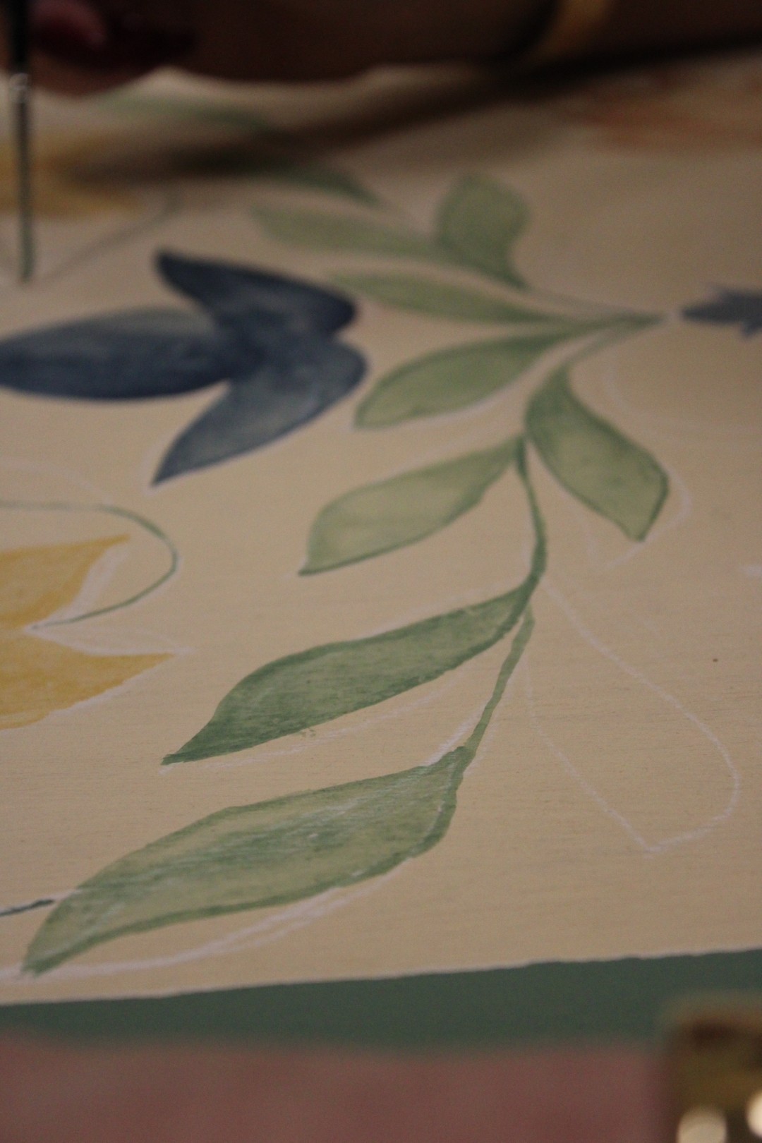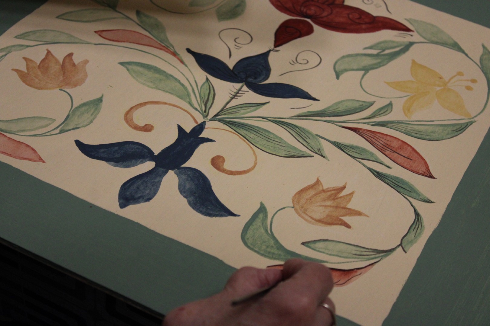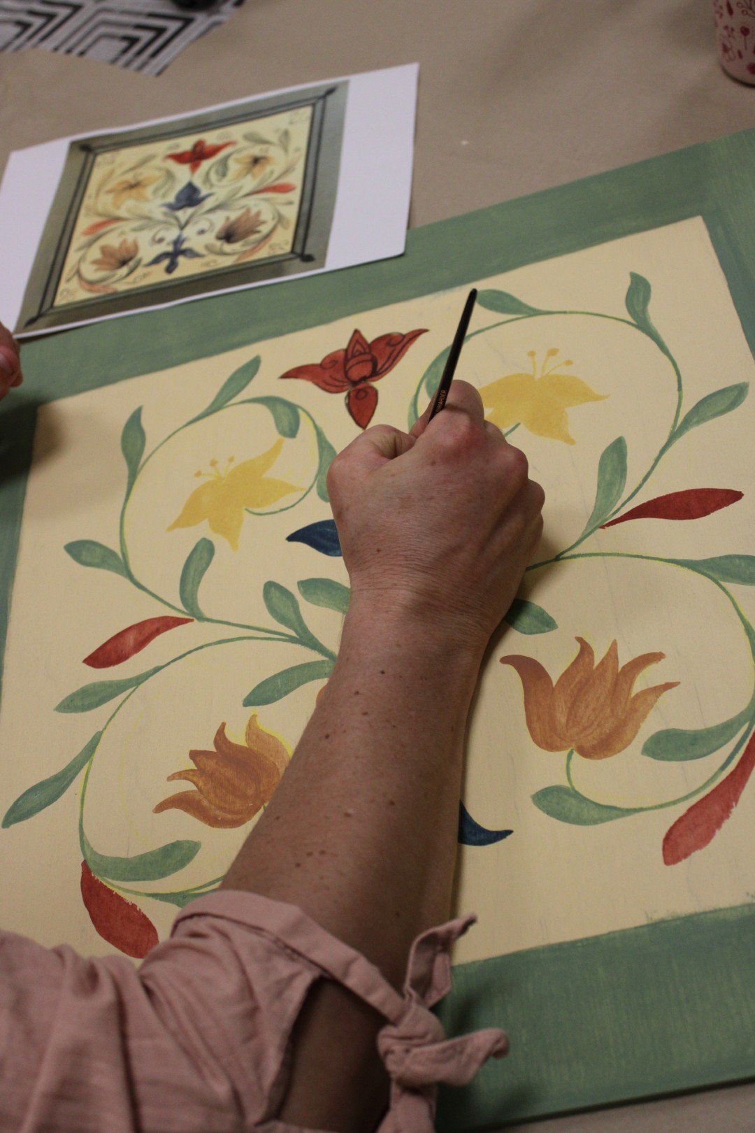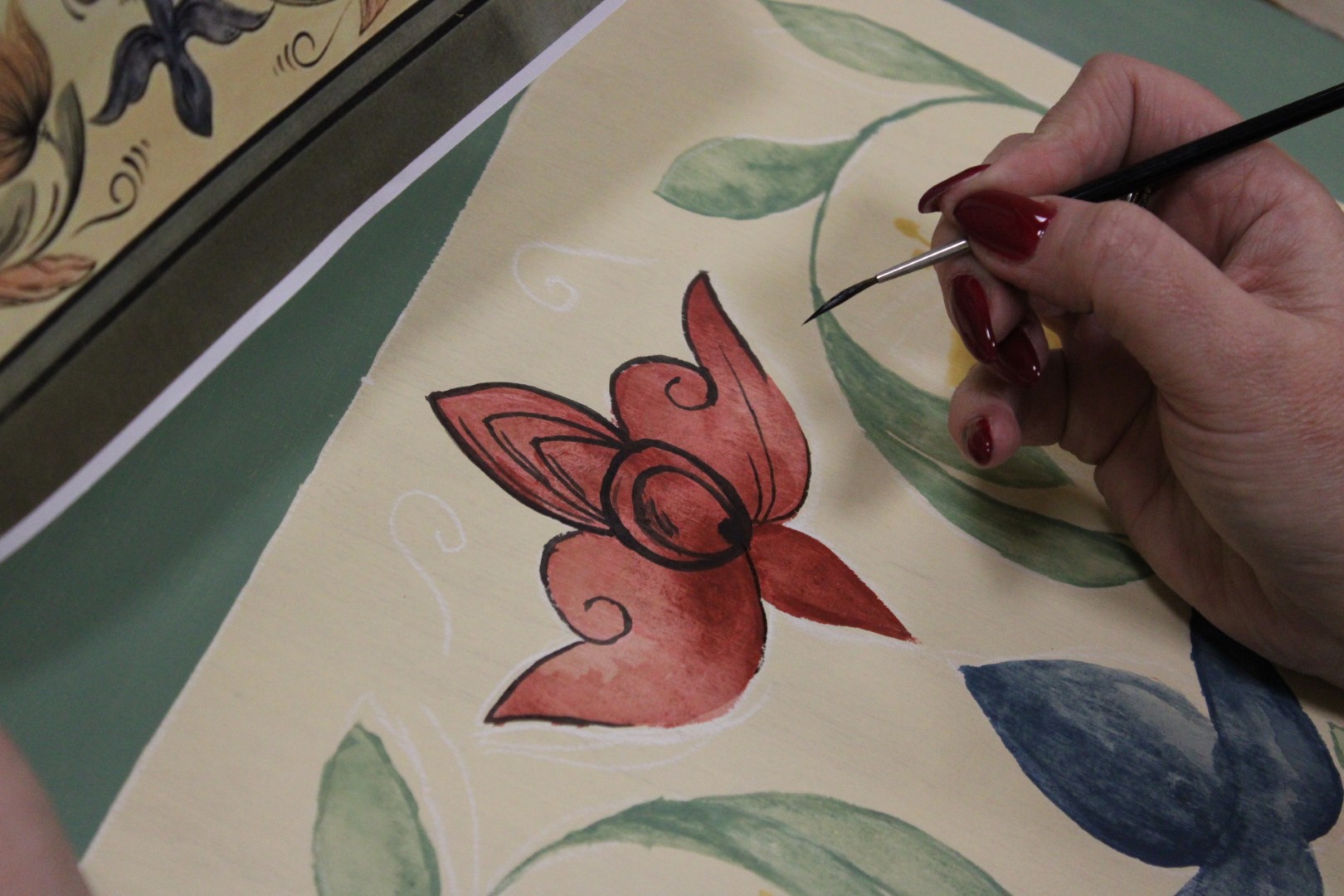 A bútorfestő szakkör tagjai ezen a szerdán is kitettek magukért. Szorgos munkájuk során tovább gazdagodott a vizesréti templomkazetta motívumrendszere. Ezen az alkalmon a megfelelő szín kikeverése után felkerültek a levelek és indák, majd kezdődhetett az árnyékok festése, amely különleges hatást ad majd a kész munkadarabnak.