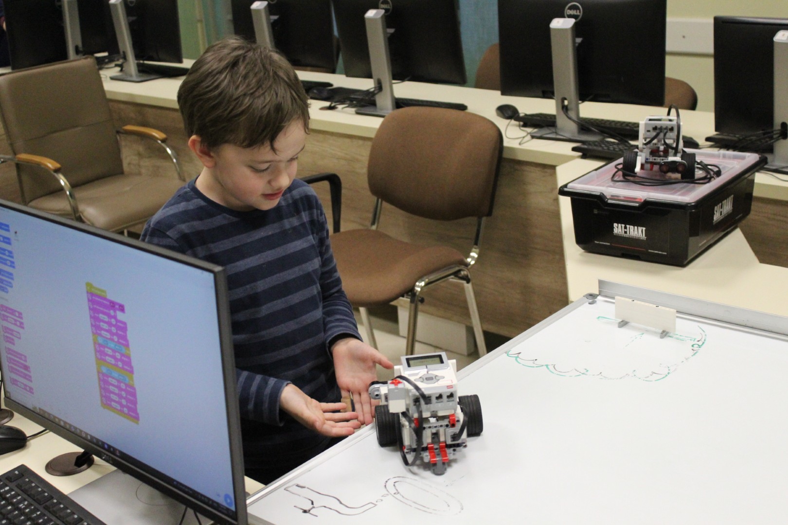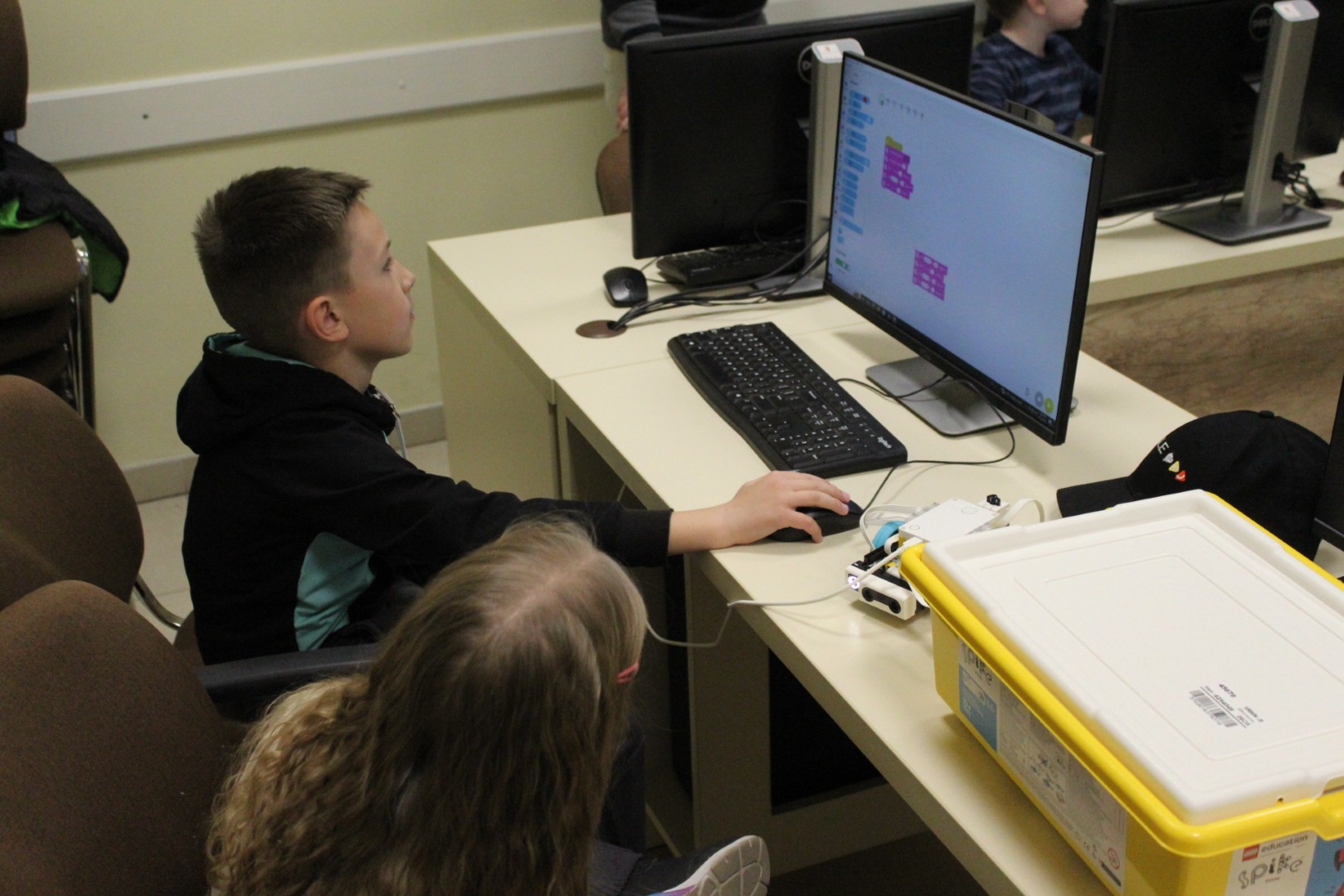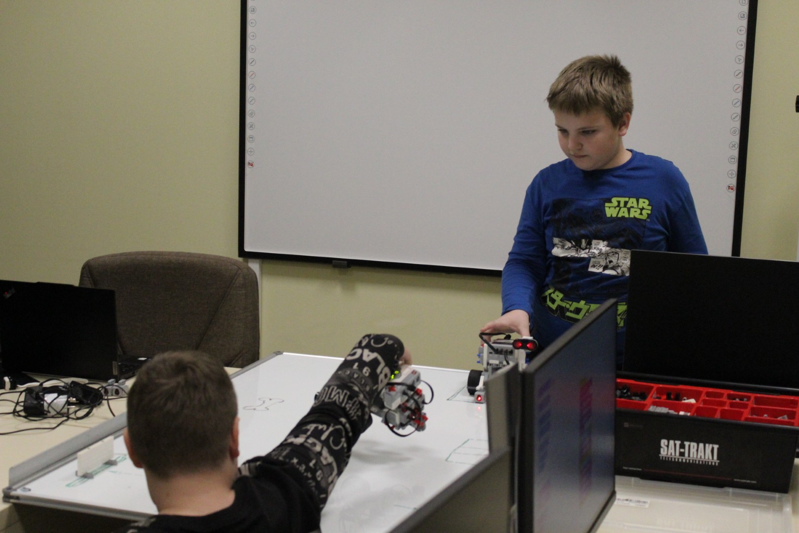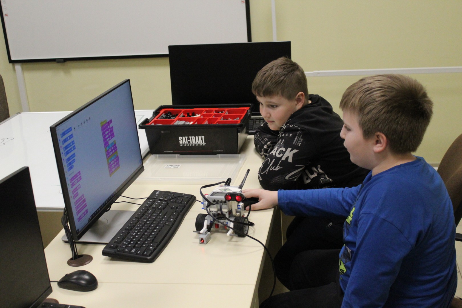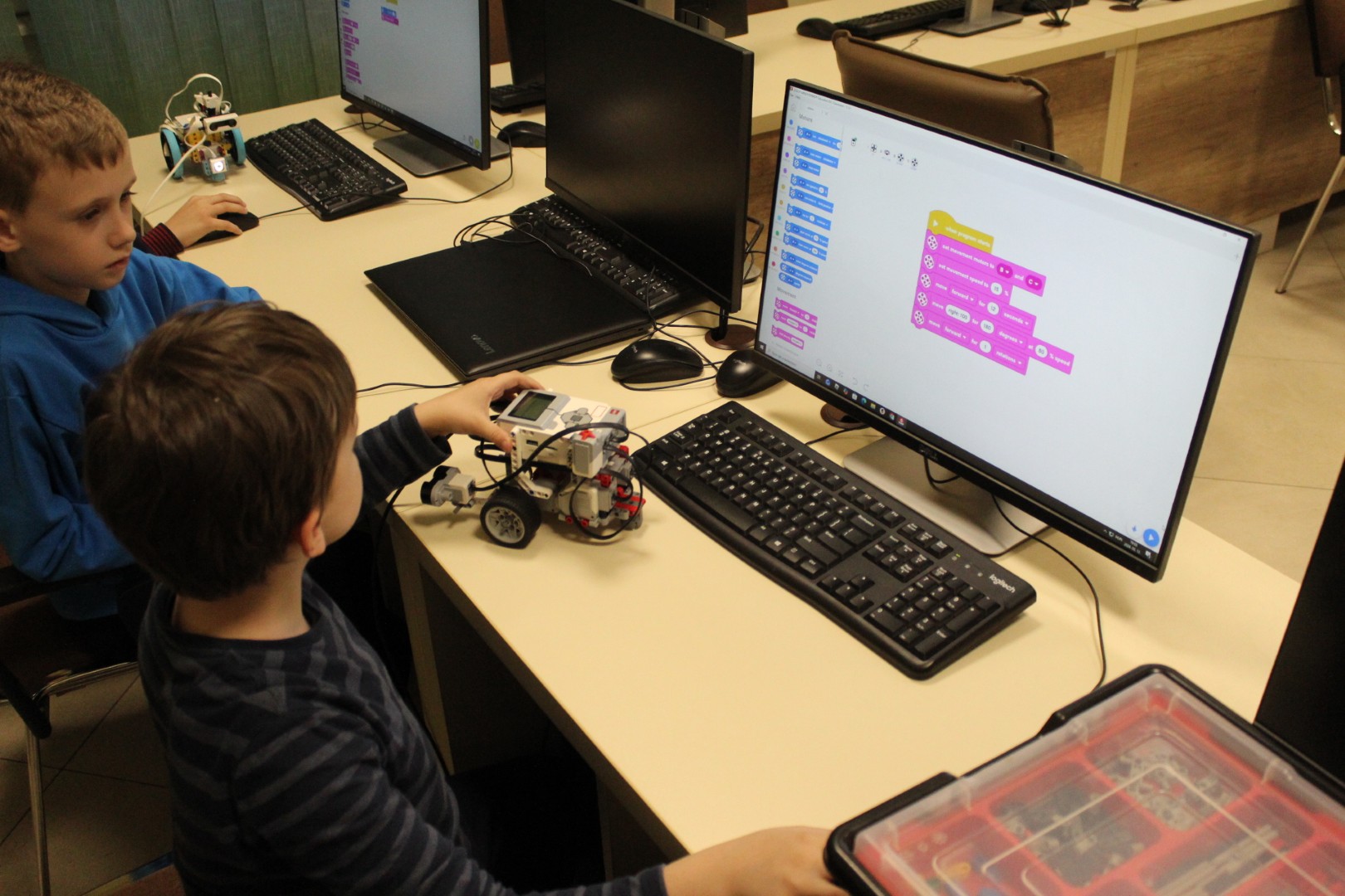 LEGO robotika foglalkozásunk csütörtöki alkalmán egy új érzékelővel ismerkedtünk meg, a színszenzorral. Ennek segítségével a kis tanulók el tudták érni, hogy a robot a falhoz érve megállapítsa annak színét, és ennek megfelelően cselekedjen. Az új eszköz segítségével a robot tulajdonképpen „ki tudott nézni az ablakon”: ha sötétet érzékelt, bement a házba, ha pedig világosat érzékelt, a vízcsap irányába mozdult. A következő órán ezt a műveletsort tökéletesítjük, majd tovább fejlesztjük a robot ügyességét: robotkart építünk rá, így már tárgyak mozgatását is képesek leszünk robotizálni.