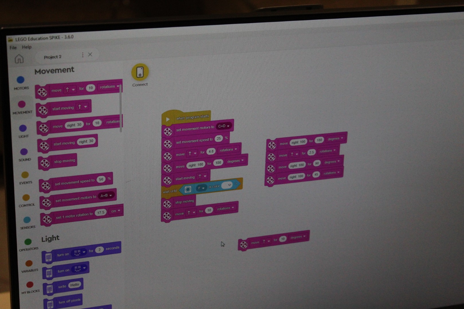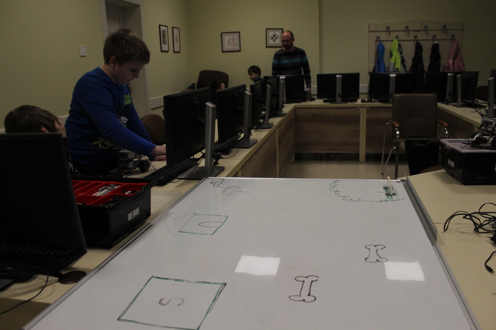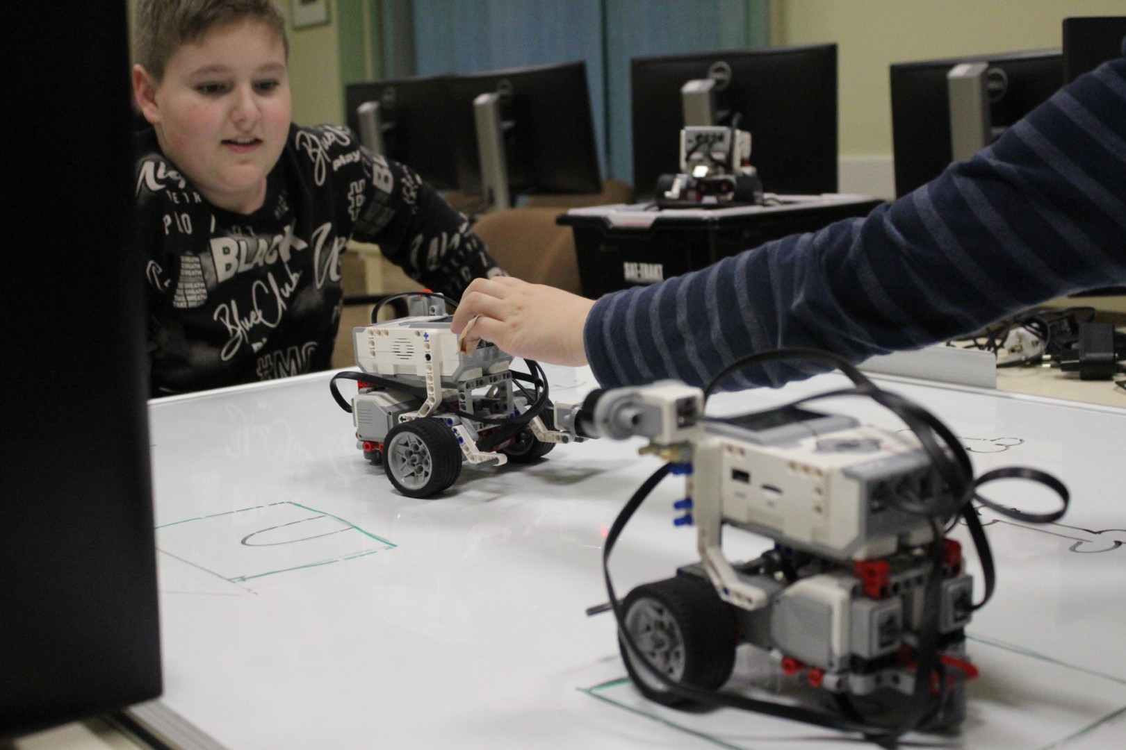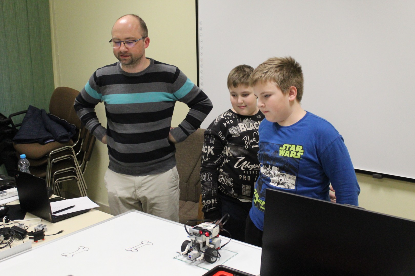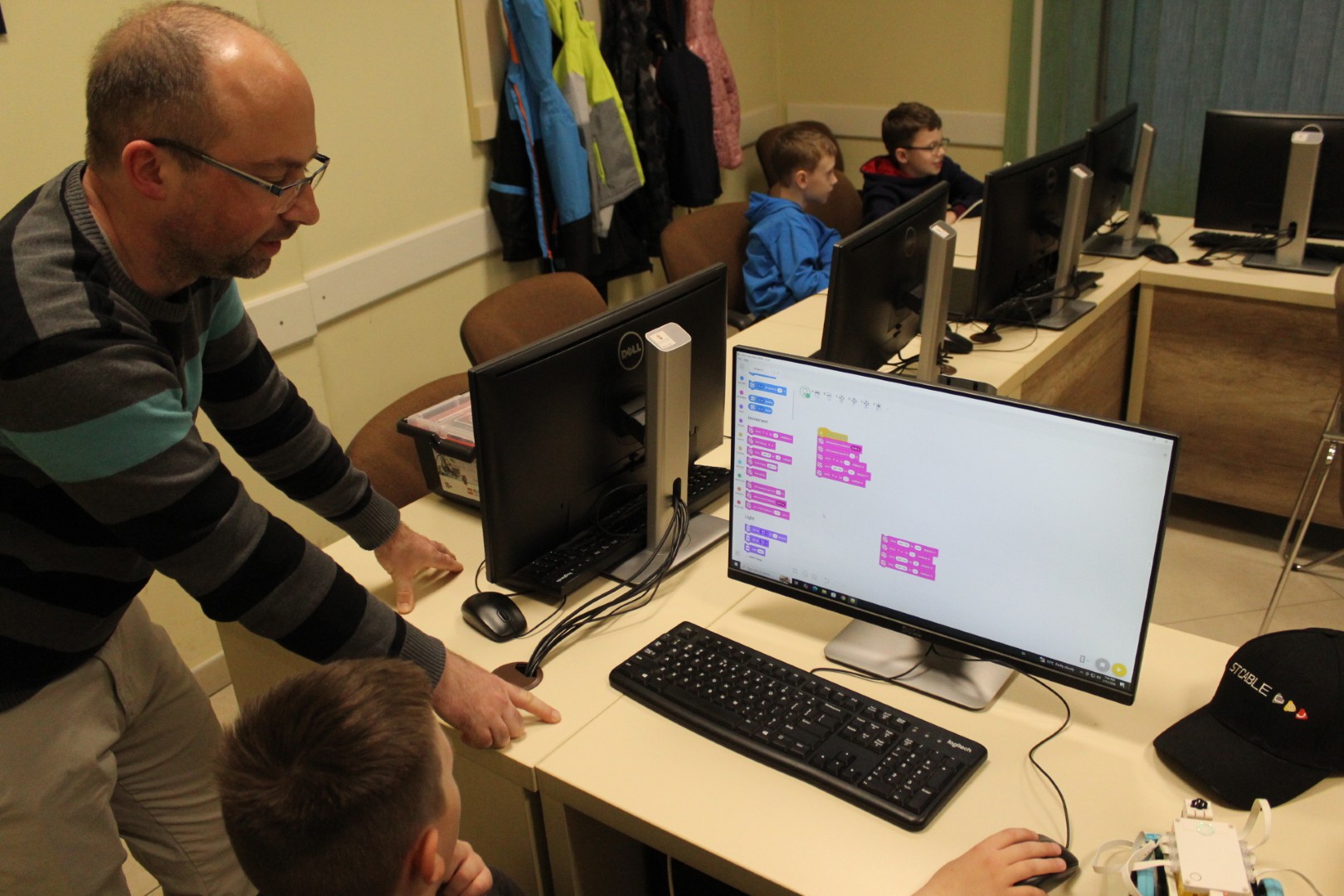LEGO robotika foglalkozásunk csütörtöki alkalmán egy új érzékelővel ismerkedtünk meg, a színszenzorral. Ennek segítségével a kis tanulók el tudták érni, hogy a robot a falhoz érve megállapítsa annak színét, és ennek megfelelően cselekedjen. Az új eszköz segítségével a robot tulajdonképpen „ki tudott nézni az ablakon”: ha sötétet érzékelt, bement a házba, ha pedig világosat érzékelt, a vízcsap irányába mozdult. A következő órán ezt a műveletsort tökéletesítjük, majd tovább fejlesztjük a robot ügyességét: robotkart építünk rá, így már tárgyak mozgatását is képesek leszünk robotizálni.