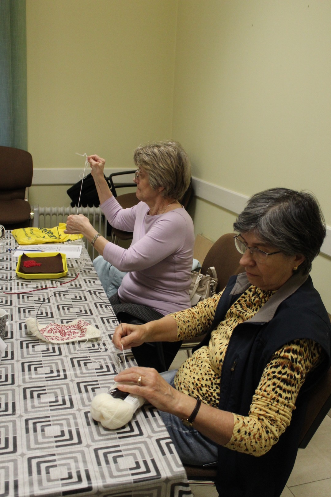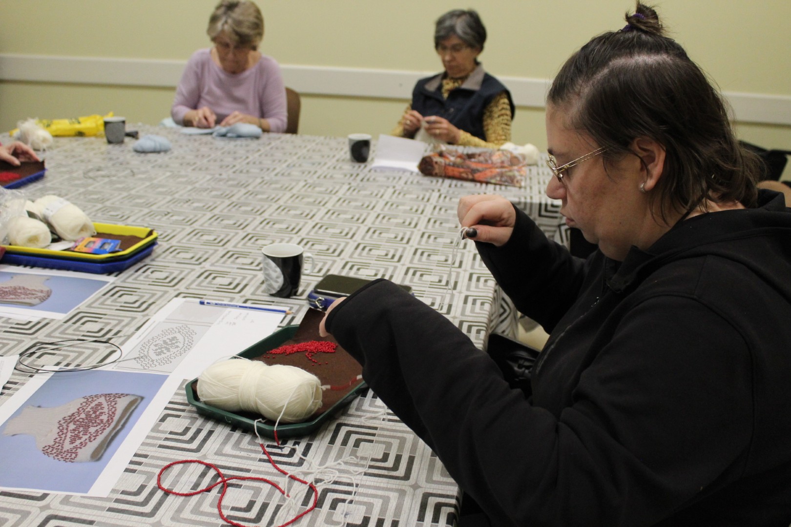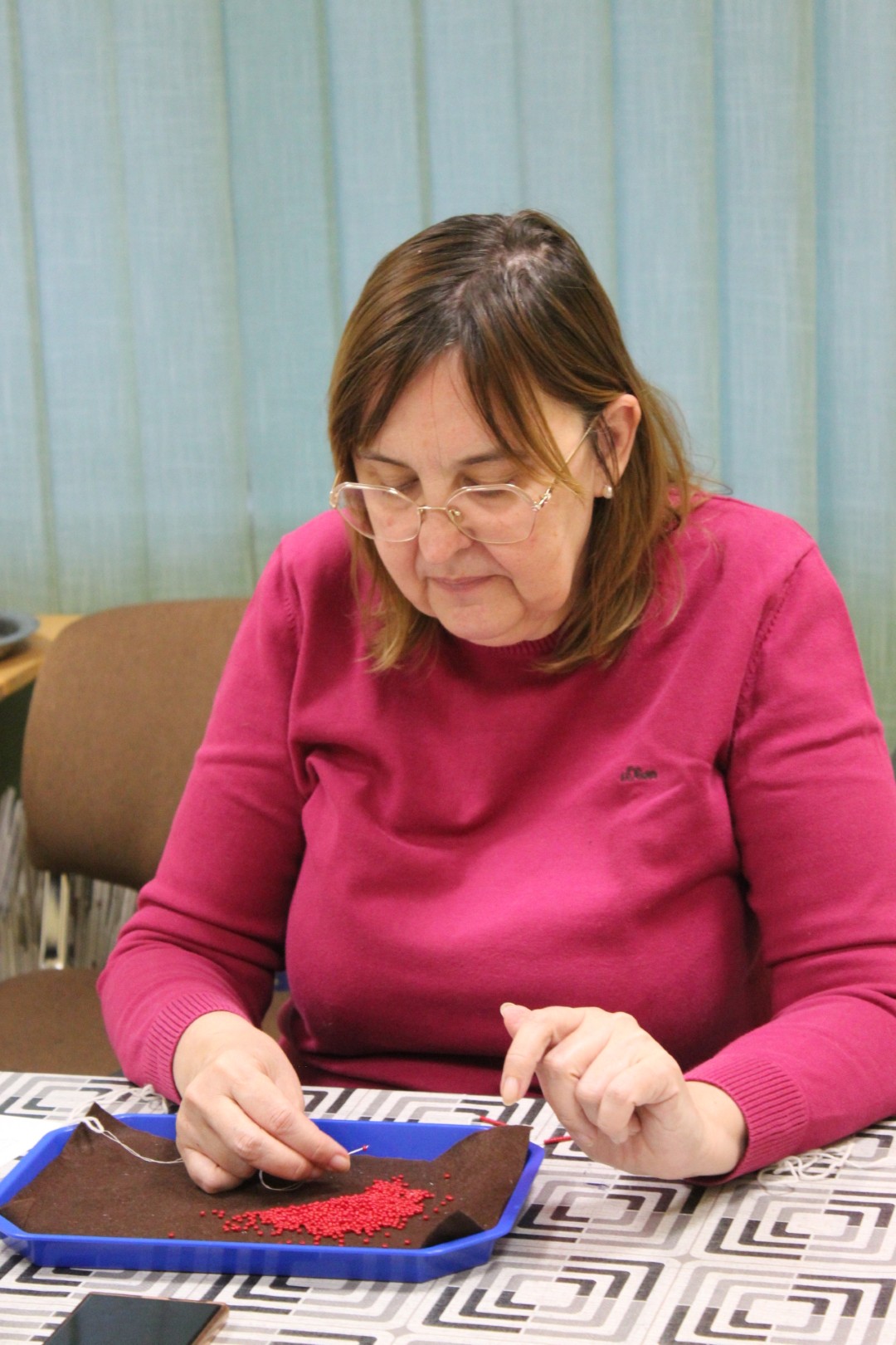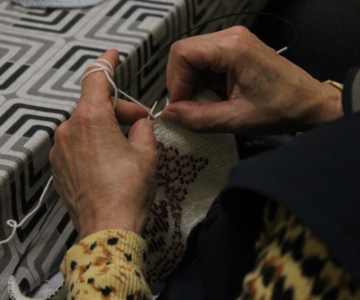 A gyöngykötő szakkör tagjai kedd délután a soron következő munkadarab előkészítésével és megkezdésével voltak elfoglalva. Az új feladat a tótkomlósi takácsmintával díszített csizmagallér kidolgozása, ehhez kellett első lépésben a nem csekély számú gyöngyöt felfűzni. A mintalap alapos tanulmányozása után kezdődhetett is ennek a nagyon látványos kiegészítőnek megkötése, amely nemcsak szép, de praktikus része lehet ruhatáruknak.