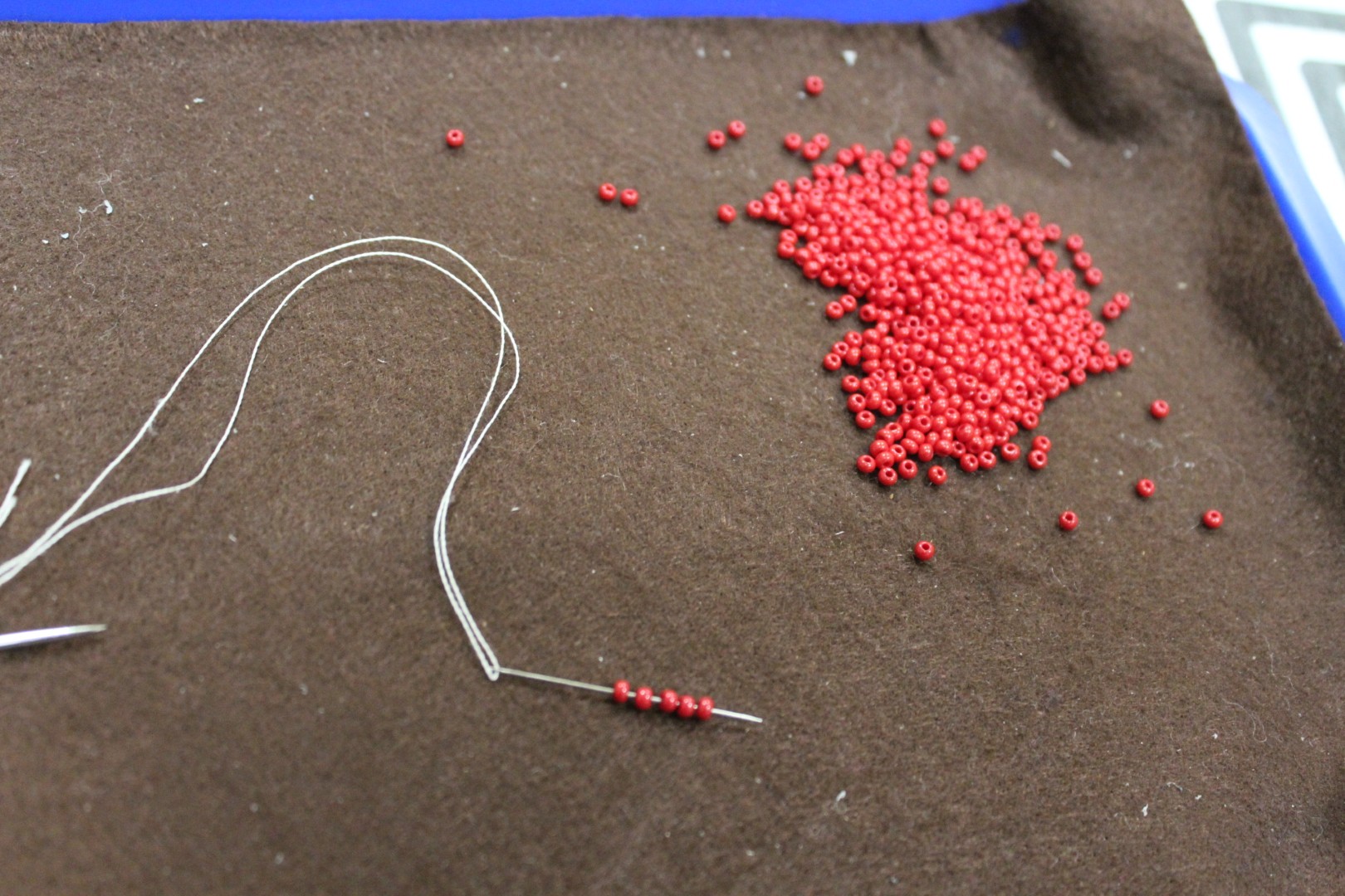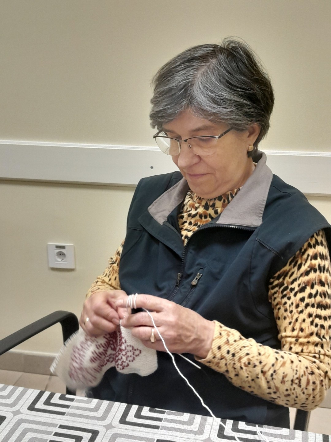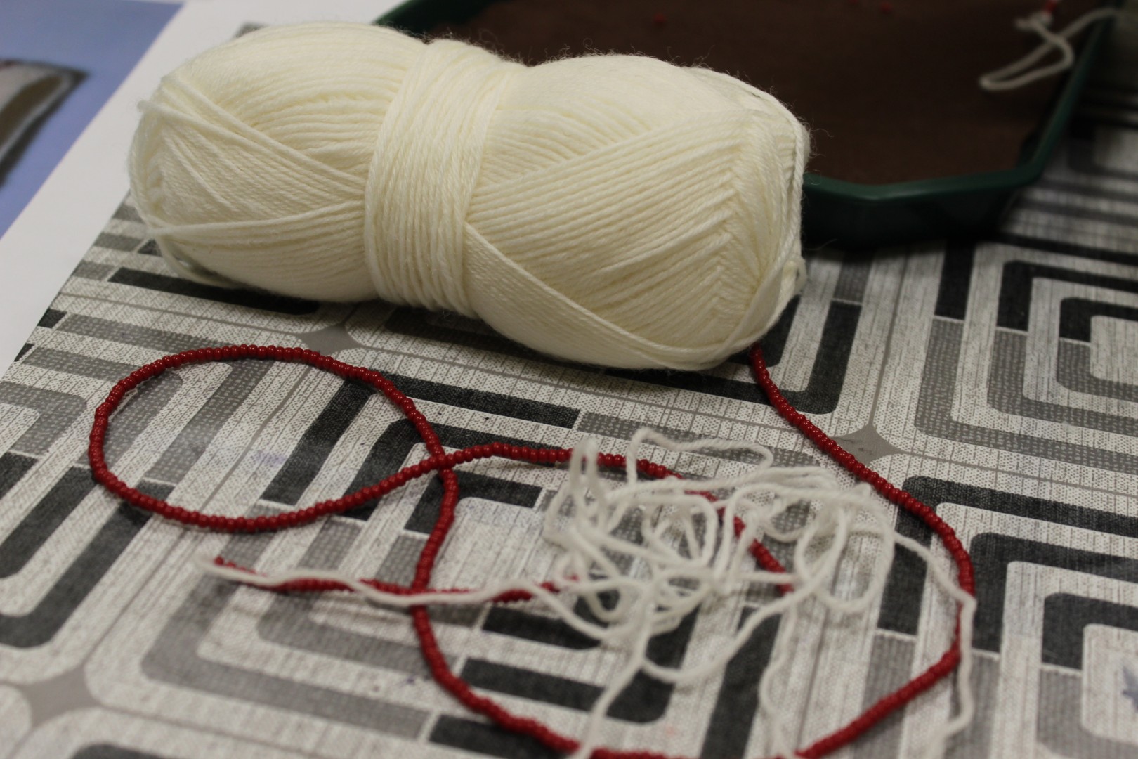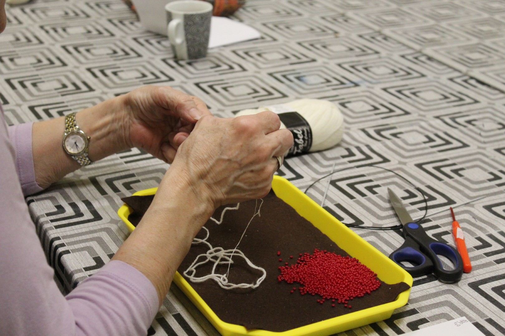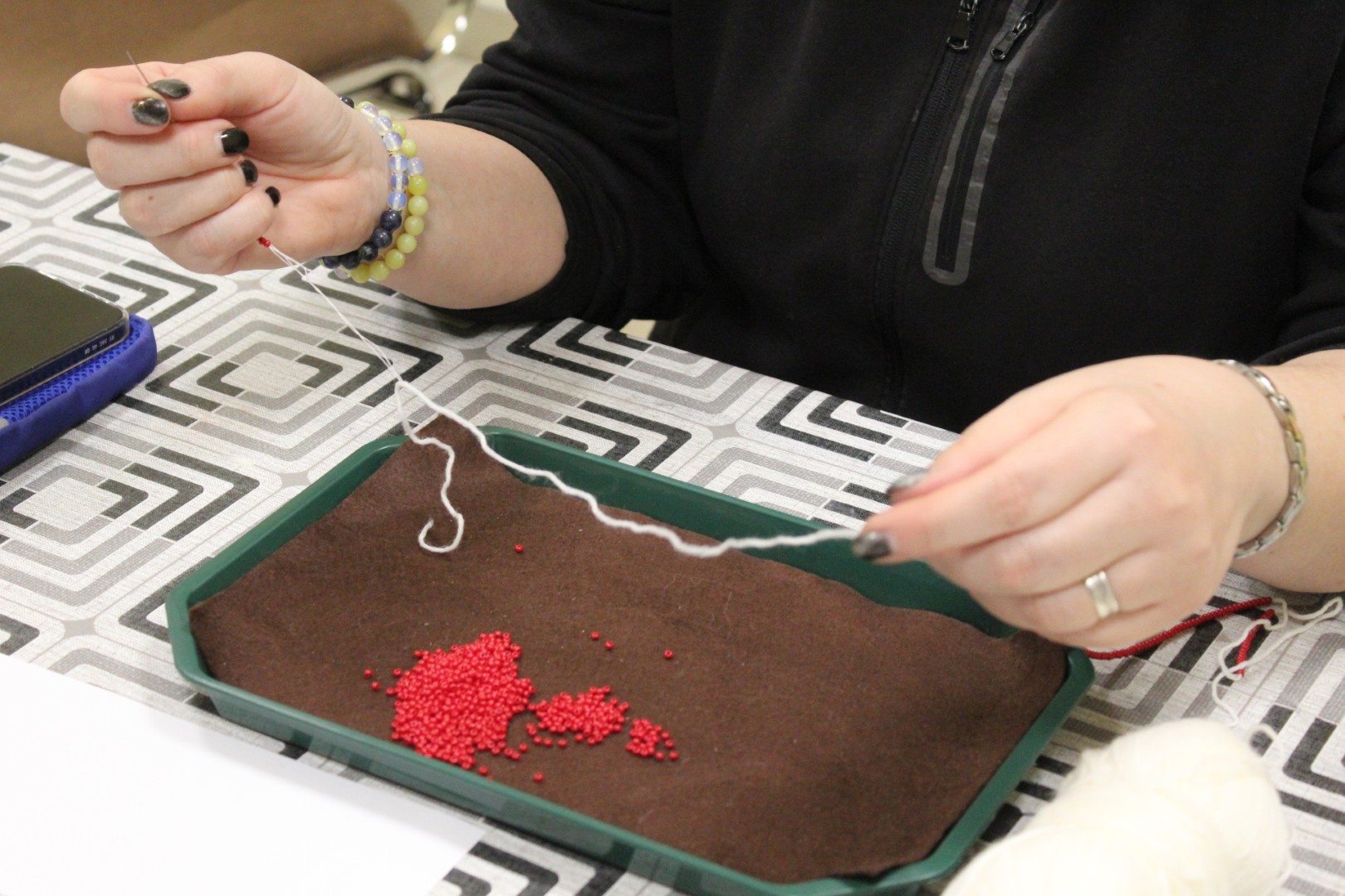 A gyöngykötő szakkör tagjai kedd délután a soron következő munkadarab előkészítésével és megkezdésével voltak elfoglalva. Az új feladat a tótkomlósi takácsmintával díszített csizmagallér kidolgozása, ehhez kellett első lépésben a nem csekély számú gyöngyöt felfűzni. A mintalap alapos tanulmányozása után kezdődhetett is ennek a nagyon látványos kiegészítőnek megkötése, amely nemcsak szép, de praktikus része lehet ruhatáruknak.