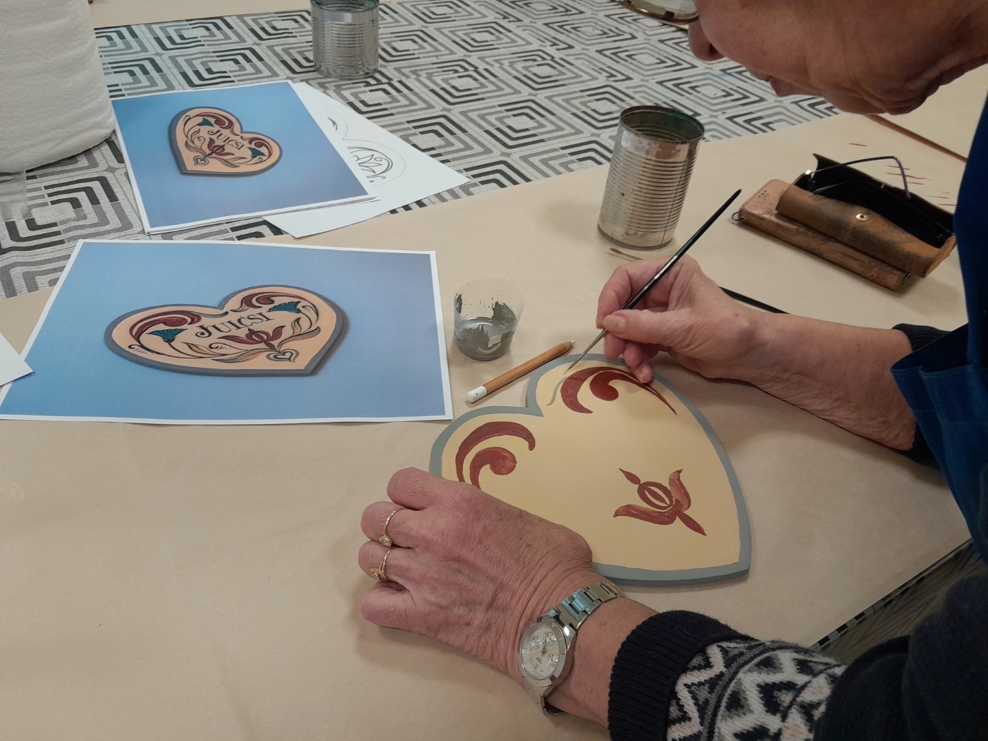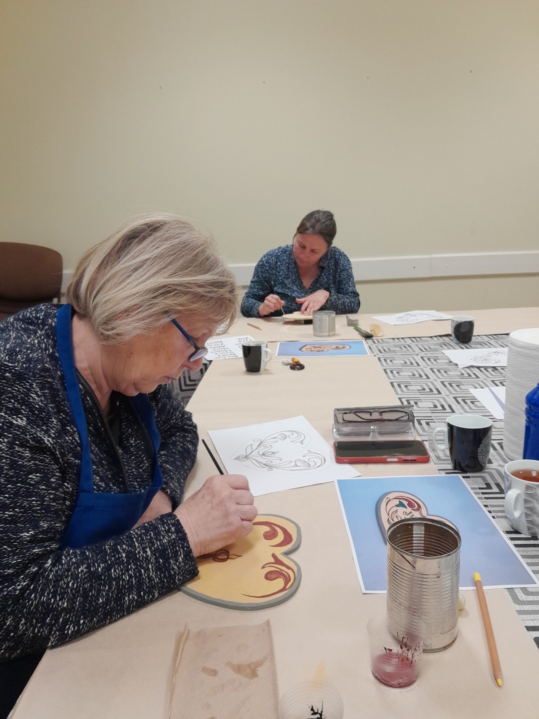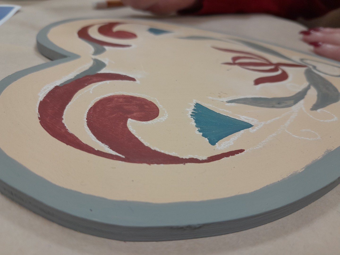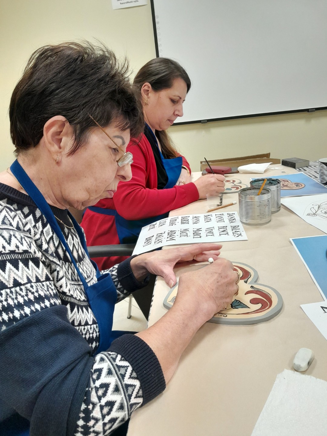 Bútorfestő szakkörünk huszadik alkalmához érkeztünk szerdán, amikor a csoporttagok a múlt héten megkezdett munkájukon dolgoztak tovább. A színkeverés után vizesréti motívumok jelentek meg az ajtónévtáblákon, a befejező fázisban pedig a feketével megfestett árnyékok és indák adták meg a munkadarab végső formáját. Ezen a délutánon is nagyon szép alkotások születtek, bizonyítva a szakkörösök rátermettségét.