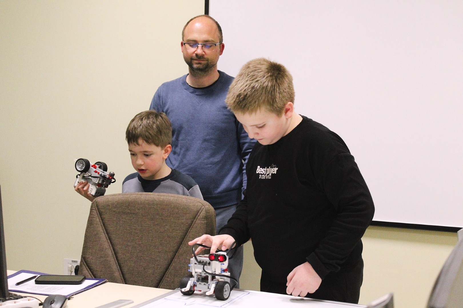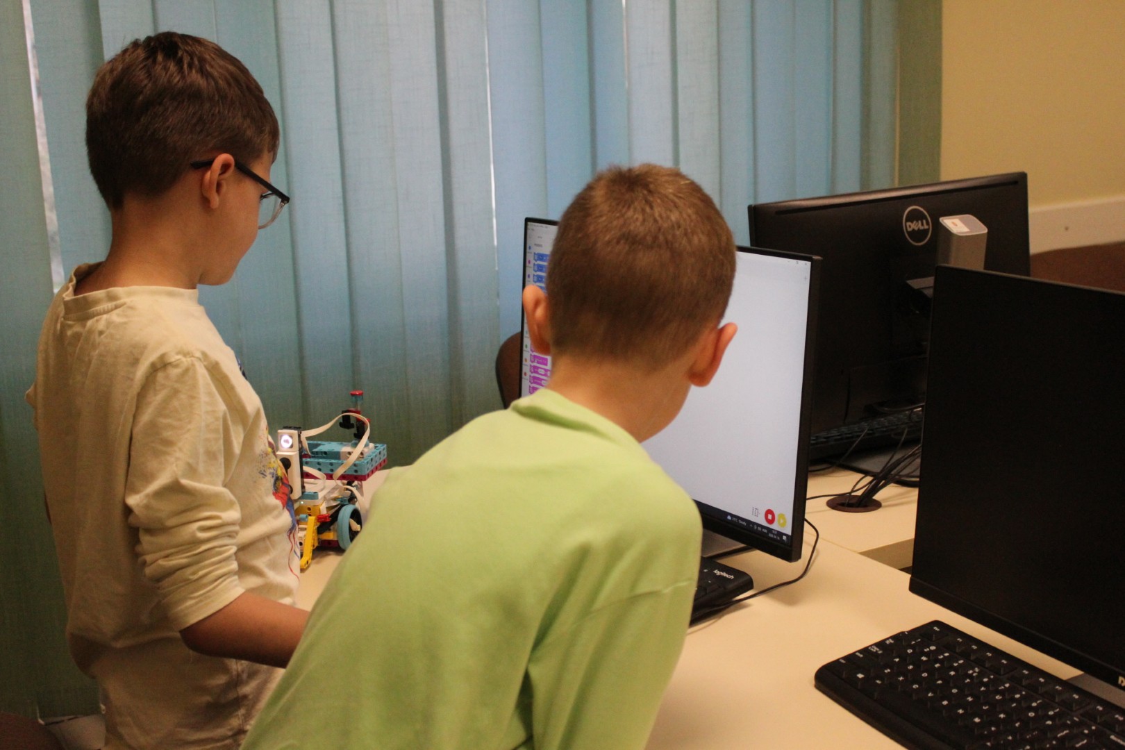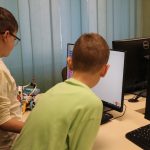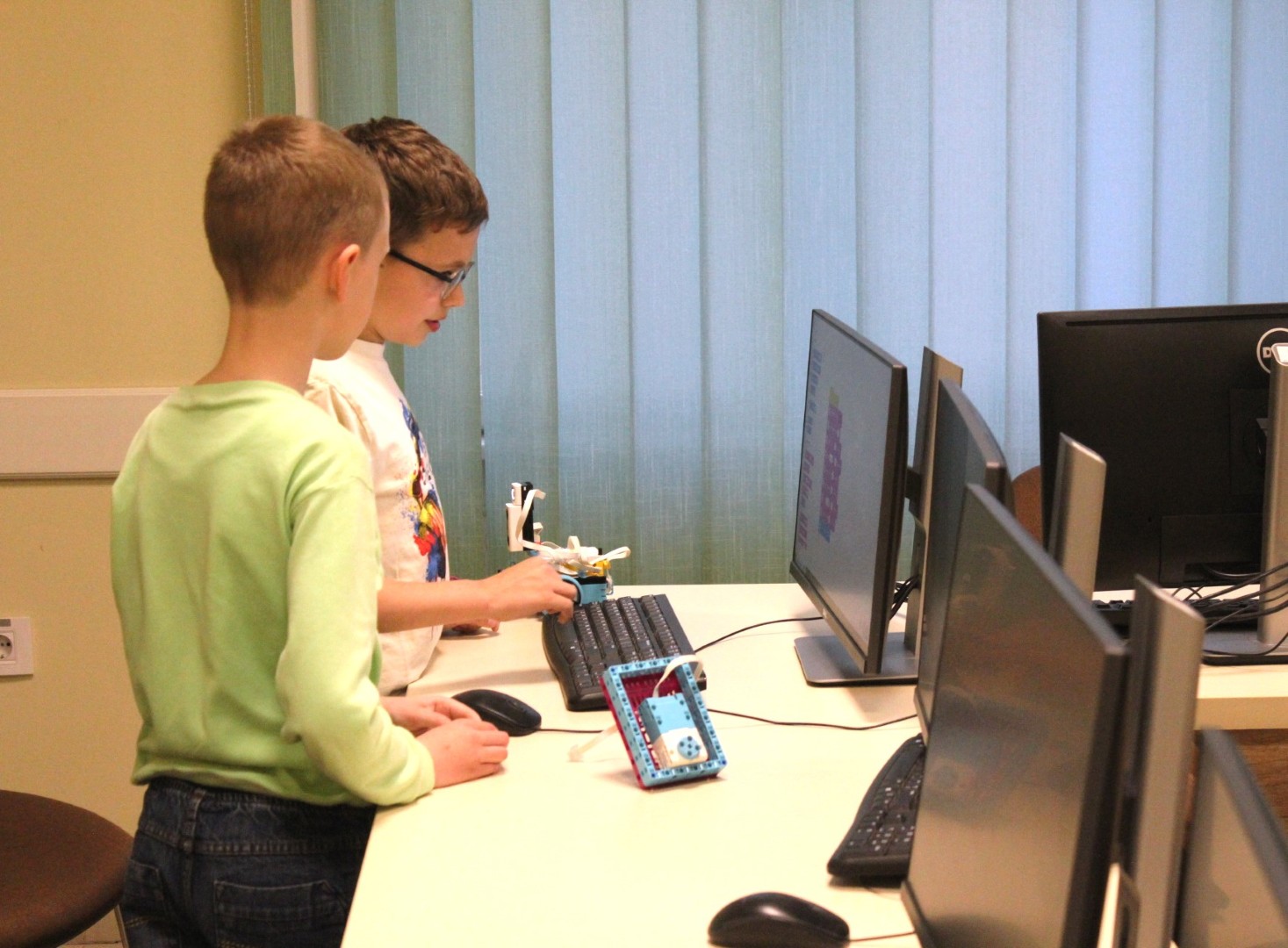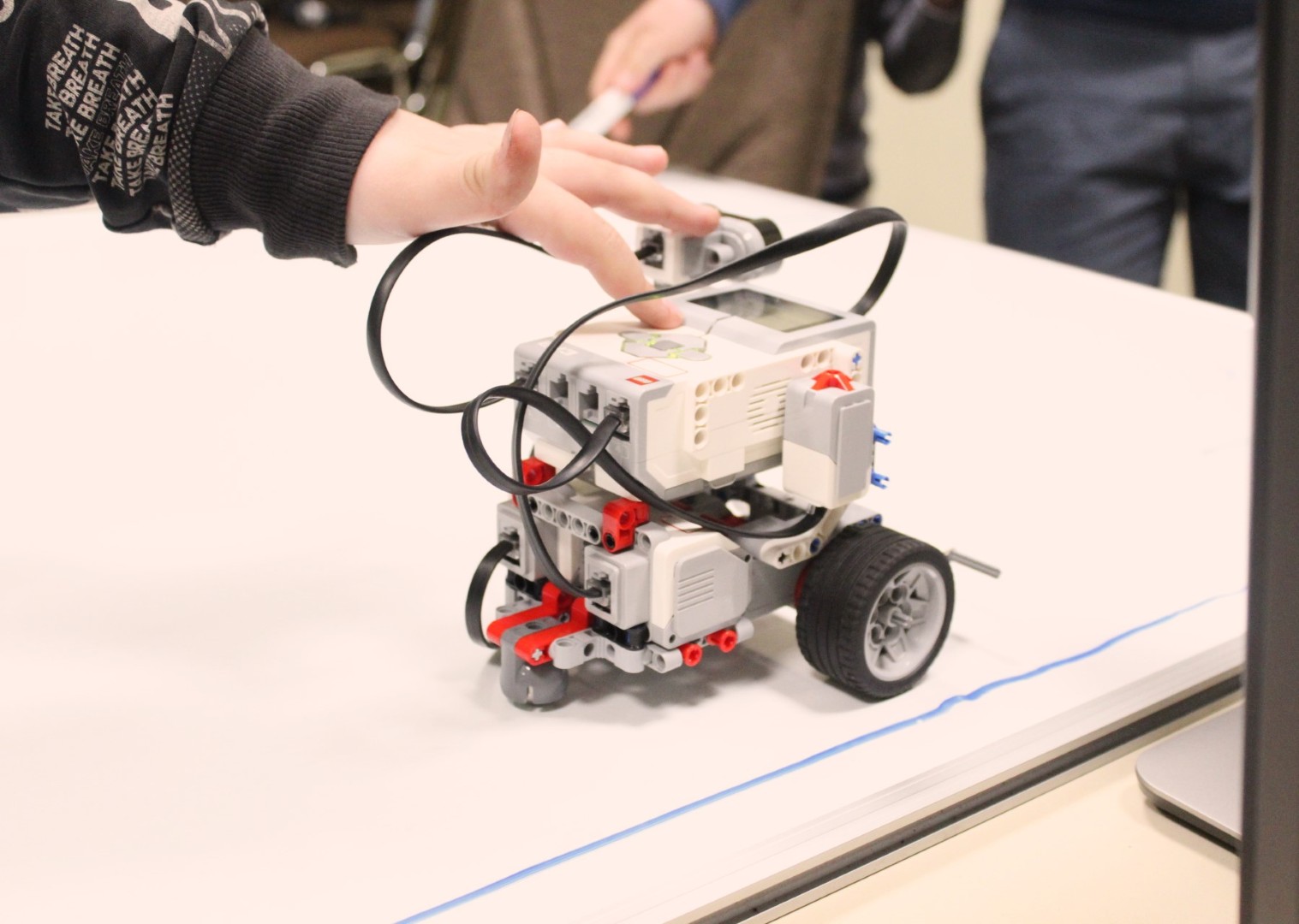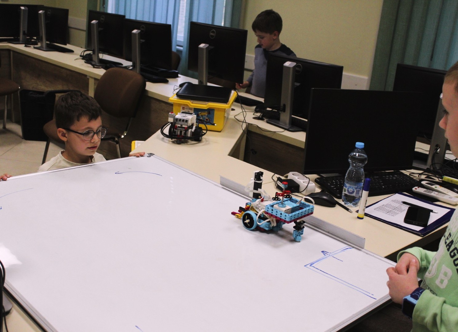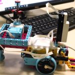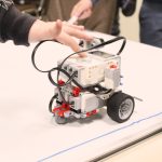 Sok-sok izgalmas feladattal folytatódott LEGO robotika foglalkozásunk április 16-án. A húsvéti szünet után, hogy újból ráhangolódjunk a robotok programozására, egy kis versenyt rendeztünk, amelyben a csapatok robotainak egyszerű feladata volt: körbemenni a pályán elhelyezkedő vonal mentén, minél jobban megközelítve a pálya szegélyét, majd a végén visszajutni a startmezőbe. A parkolást is pontosan kellett véghezvinni, hogy sehol se lógjon ki a robot a felrajzolt négyzetből. A csapatok izgatottan álltak a kihívás elé, sokszor tesztelték a robotot, hogy az minél pontosabban teljesítse feladatát az éles futamon. A miniverseny három mért körből állt, mindenki szerzett pontokat, és egy kisebb eredményhirdetés is kerekedett az óra végén. Tartsatok velünk jövő héten is!