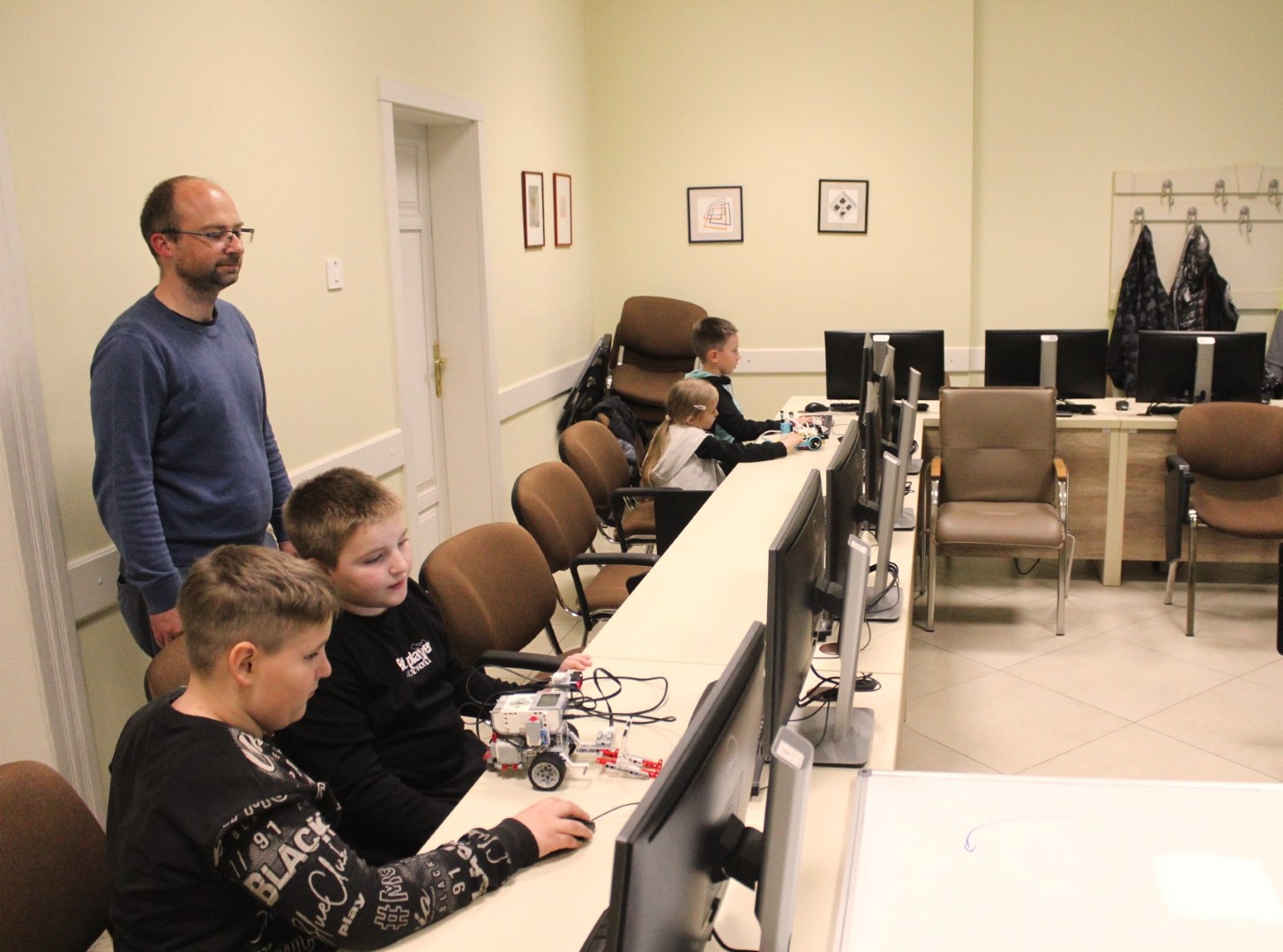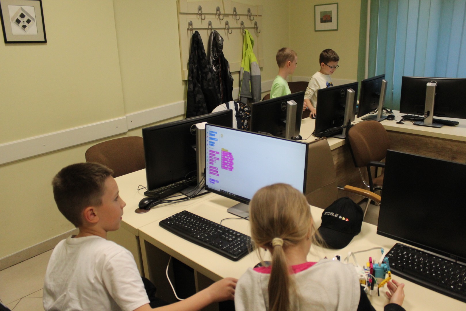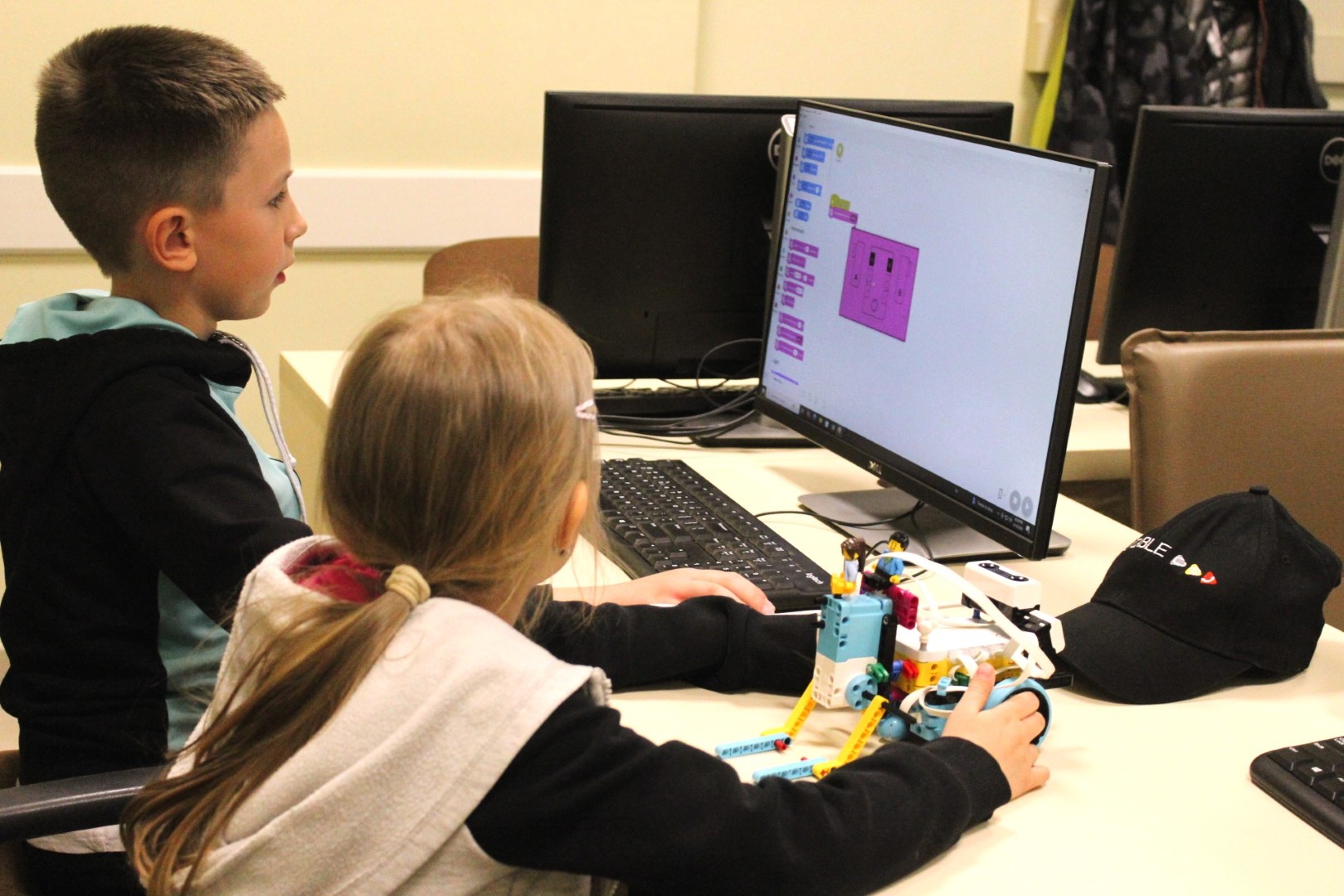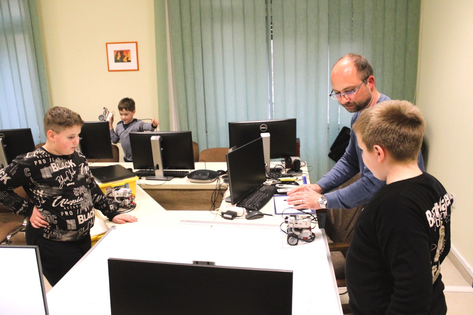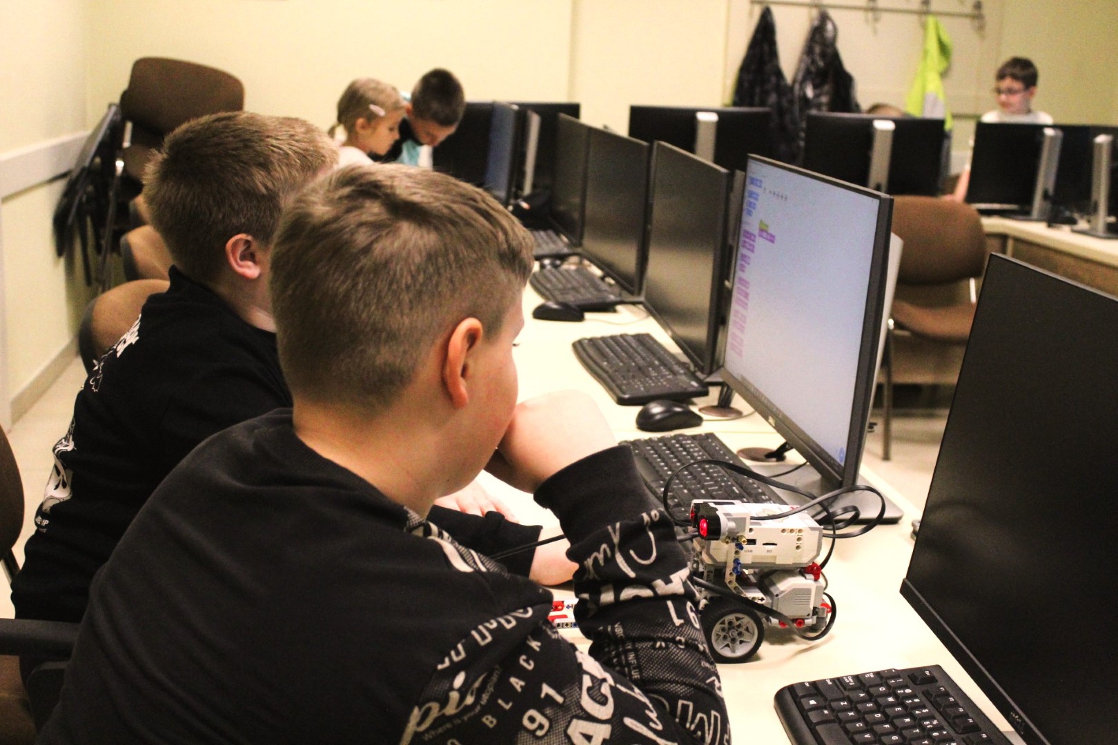 Sok-sok izgalmas feladattal folytatódott LEGO robotika foglalkozásunk április 16-án. A húsvéti szünet után, hogy újból ráhangolódjunk a robotok programozására, egy kis versenyt rendeztünk, amelyben a csapatok robotainak egyszerű feladata volt: körbemenni a pályán elhelyezkedő vonal mentén, minél jobban megközelítve a pálya szegélyét, majd a végén visszajutni a startmezőbe. A parkolást is pontosan kellett véghezvinni, hogy sehol se lógjon ki a robot a felrajzolt négyzetből. A csapatok izgatottan álltak a kihívás elé, sokszor tesztelték a robotot, hogy az minél pontosabban teljesítse feladatát az éles futamon. A miniverseny három mért körből állt, mindenki szerzett pontokat, és egy kisebb eredményhirdetés is kerekedett az óra végén. Tartsatok velünk jövő héten is!