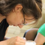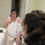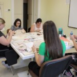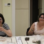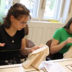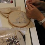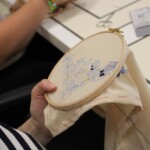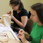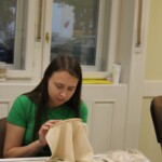 A Szakkör hímzőcsoportjának tagjai találkoztak ismét május 21-én, hogy folytassák az előző héten megkezdett munkát. Előkerültek a békési sarokmotívummal ellátott szalvéták, a csoporttagok pedig szorgosan láttak neki a hímzésnek. Vidám beszélgetés mellett gyorsan telt az idő, ezalatt pedig egyre szebben rajzolódott ki a minta. A következő alkalommal befejező részéhez ér a szalvéta kidolgozása, hogy azután újabb feladatba vágjanak a résztvevők.